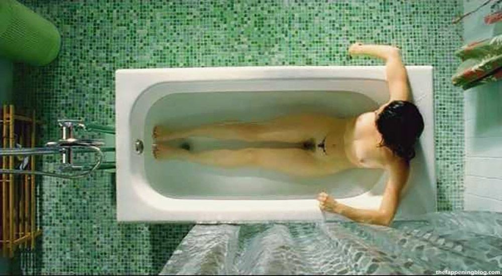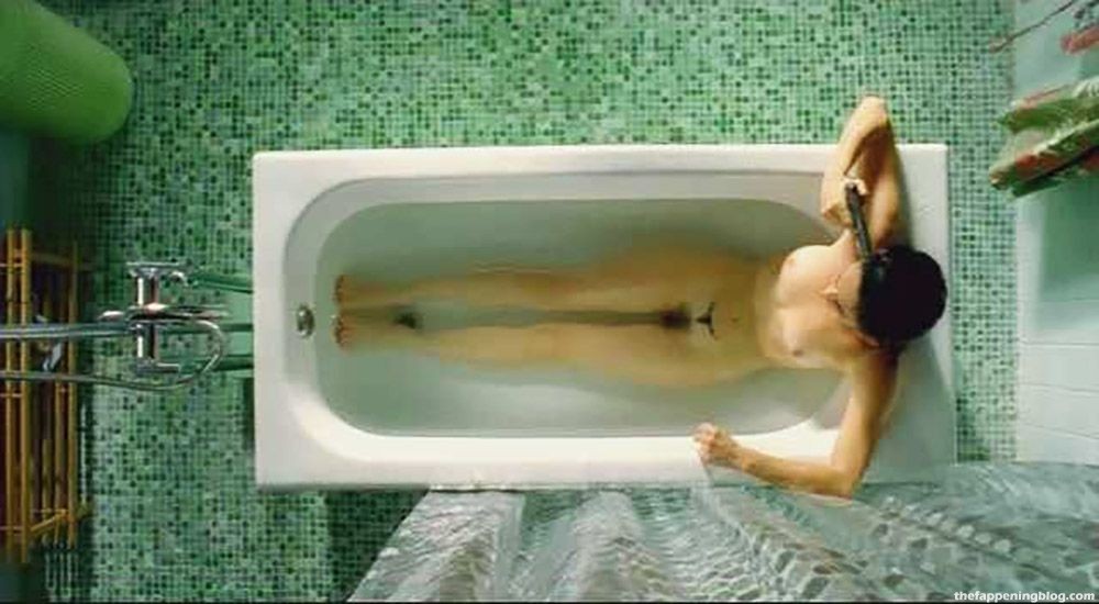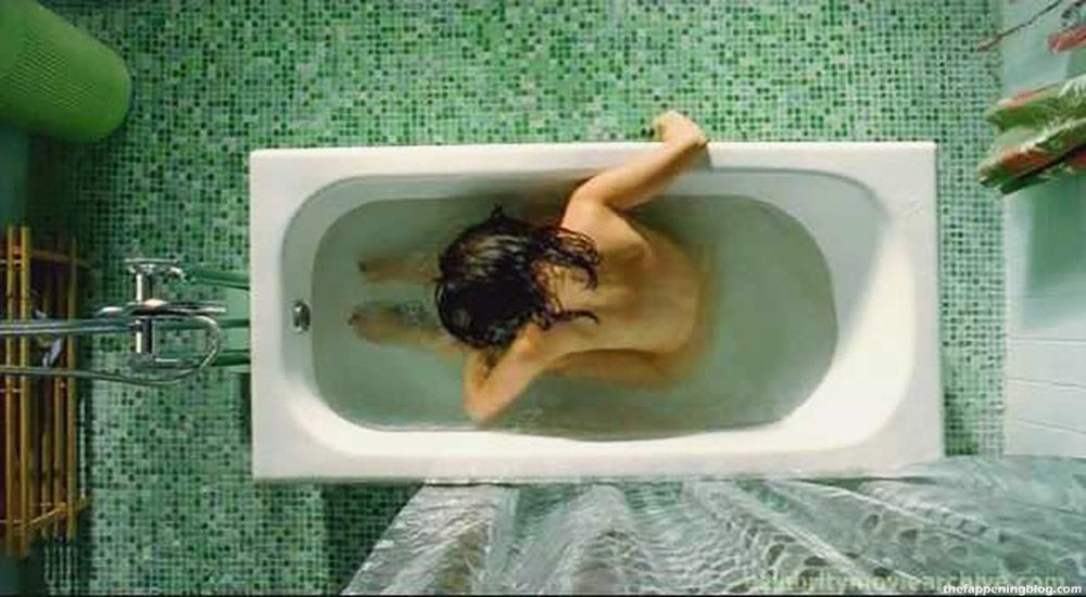 Ana de la Reguera is naked in a bathtub, her breasts and bush visible as she raises a revolver to her head and then drops it.