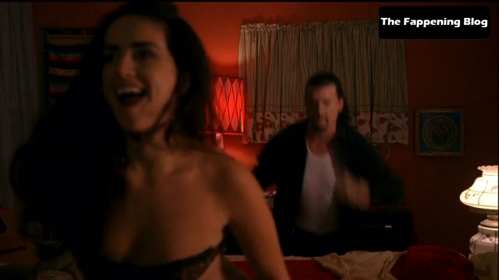 Mexicana Ana de la Reguera is making out with a guy on a bed. Then she’s riding him topless and giving us a quick look at her right breast as she has sex with her man.