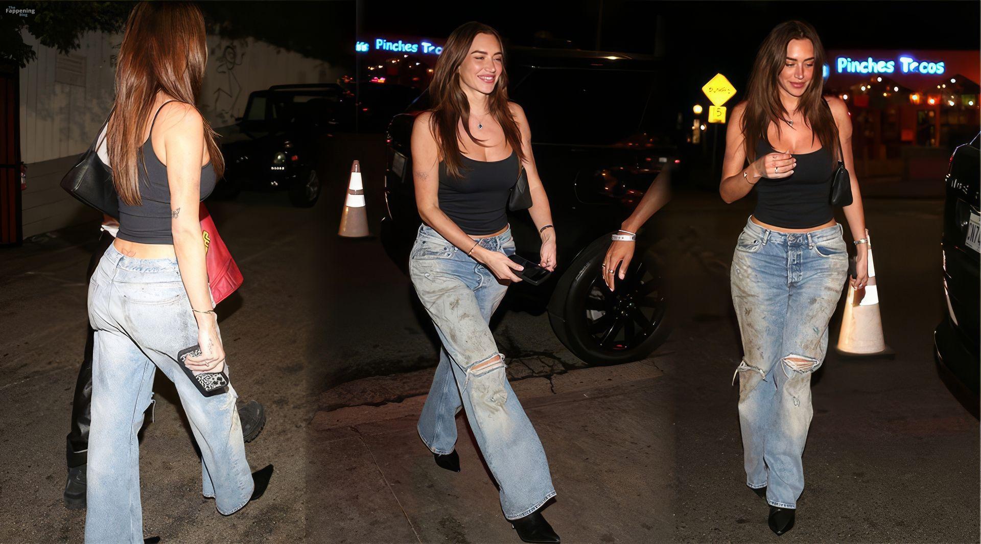 Anastasia Karanikolaou exibiu um decote e bumbum incríveis com uma regata justa e jeans rasgados na festa de lançamento do livro de Mark Ronson no Chateau Marmont.