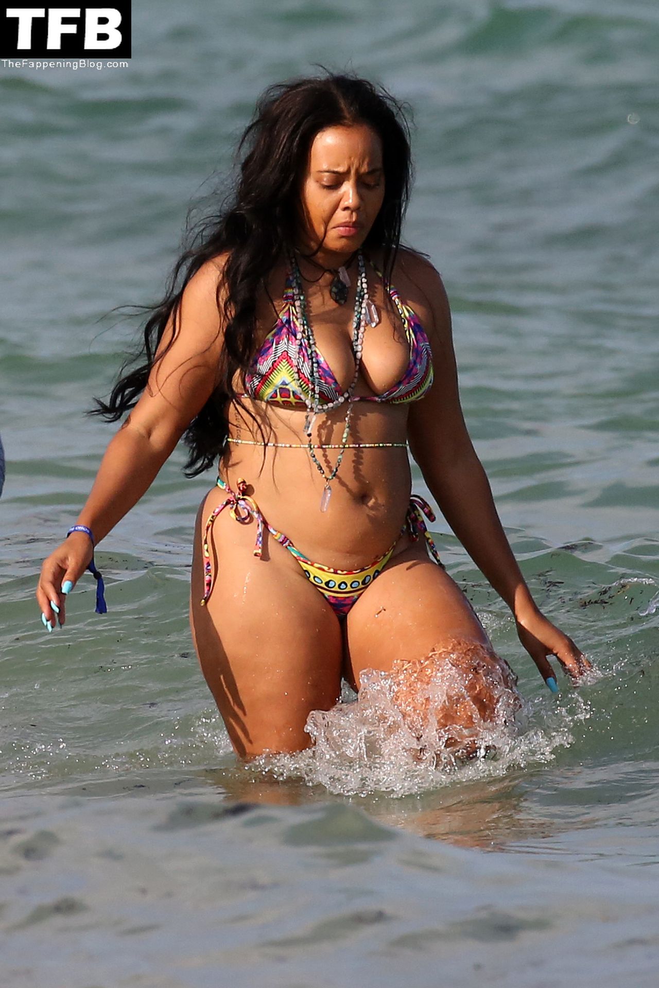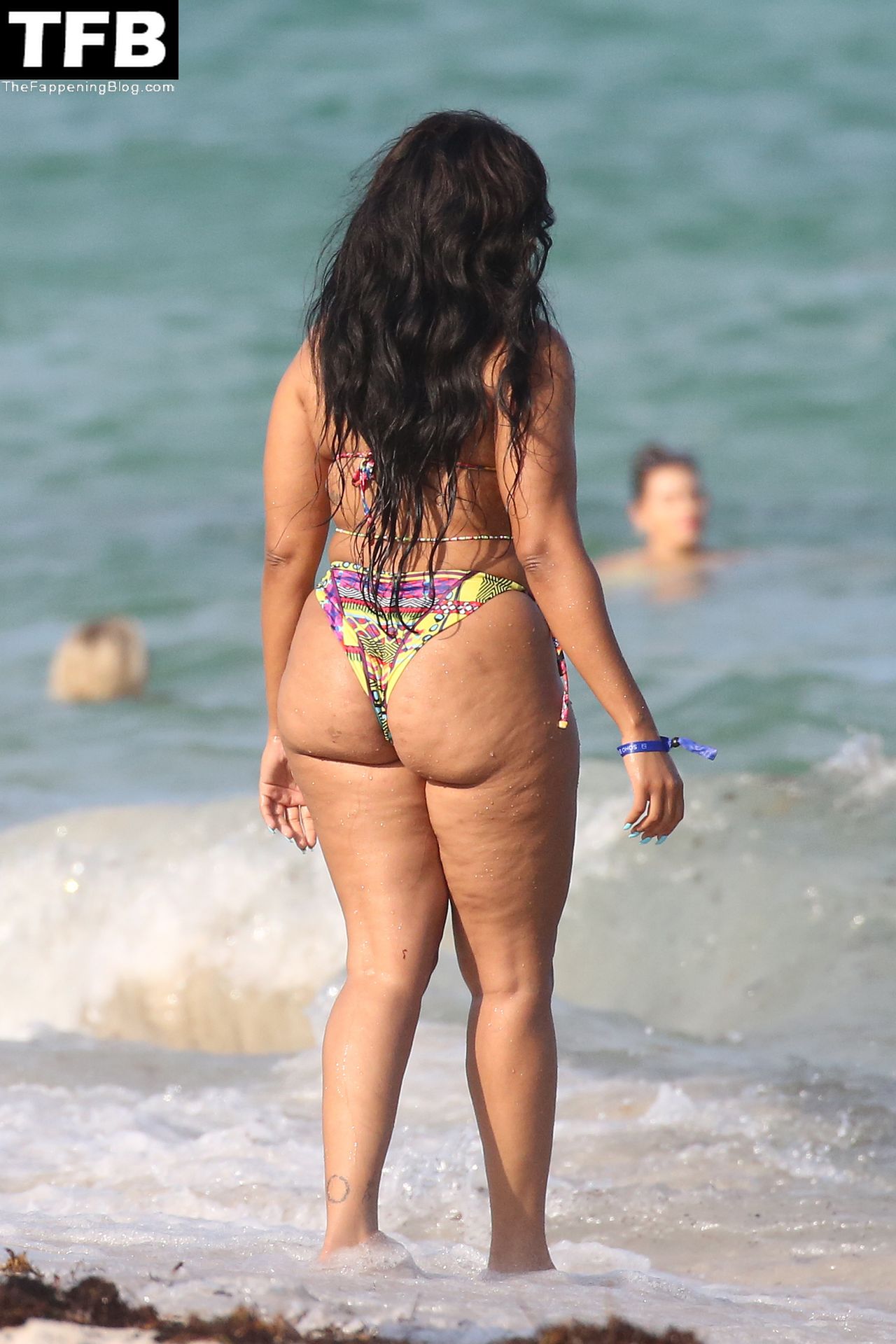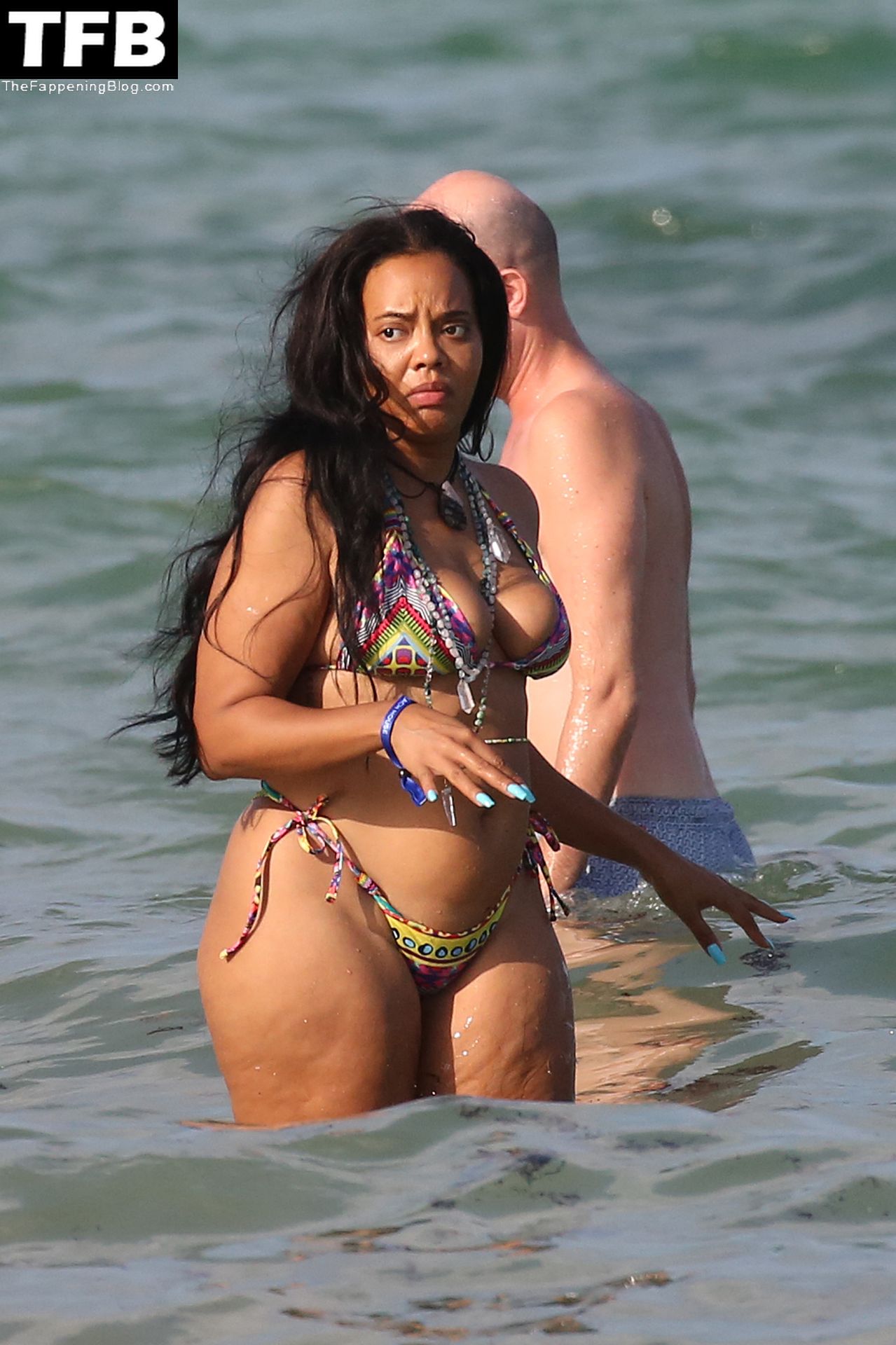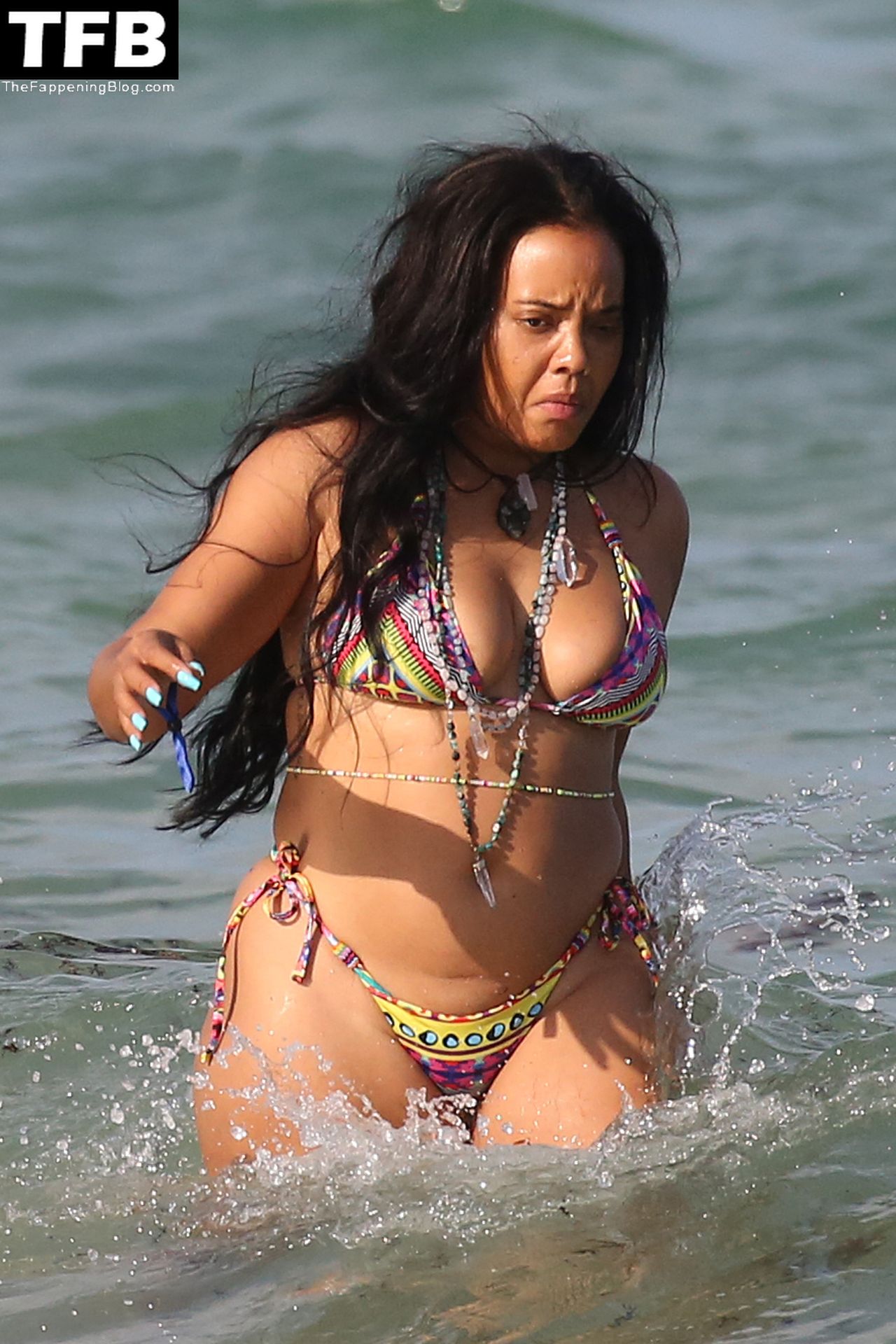 A estrela de reality show Angela Simmons exibe suas curvas em um biquíni colorido enquanto aproveita a praia em Miami, 17/10/2021.