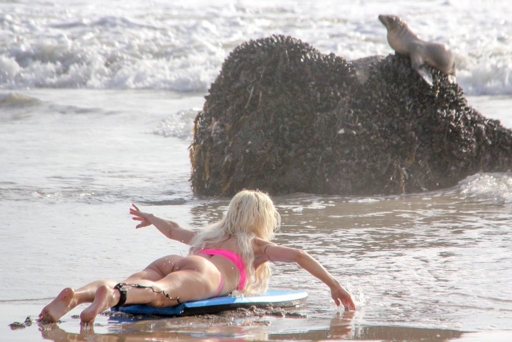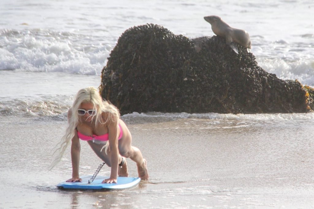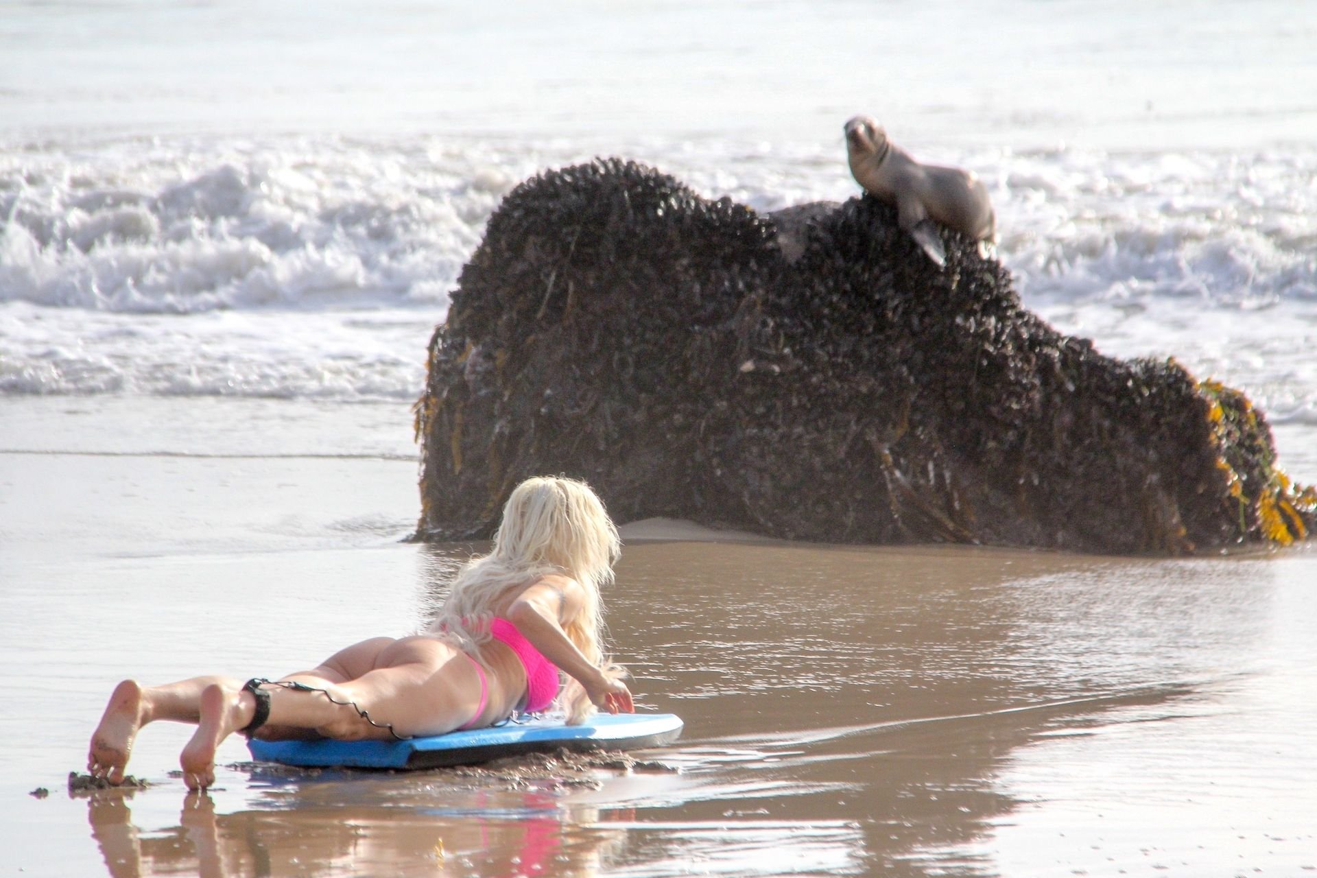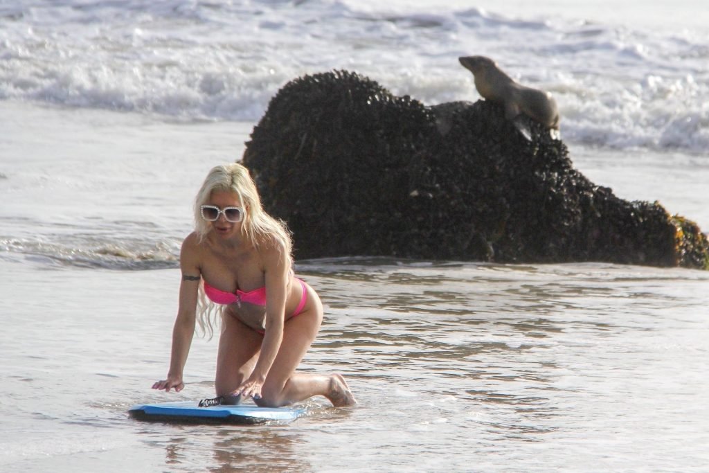 Blonde Angelique “Frenchy” Morgan foi vista de biquíni rosa na Praia de Malibu mostrando suas habilidades em bodyboard, 01/03/2019.