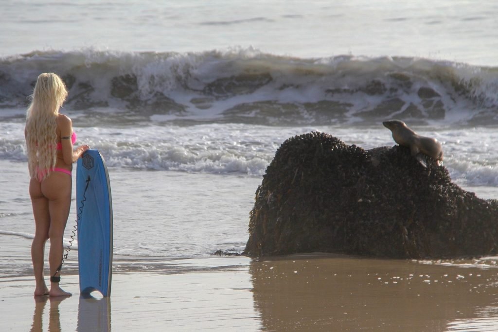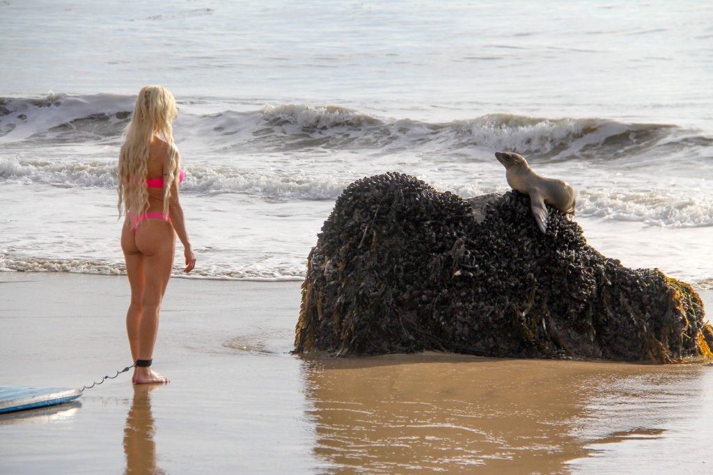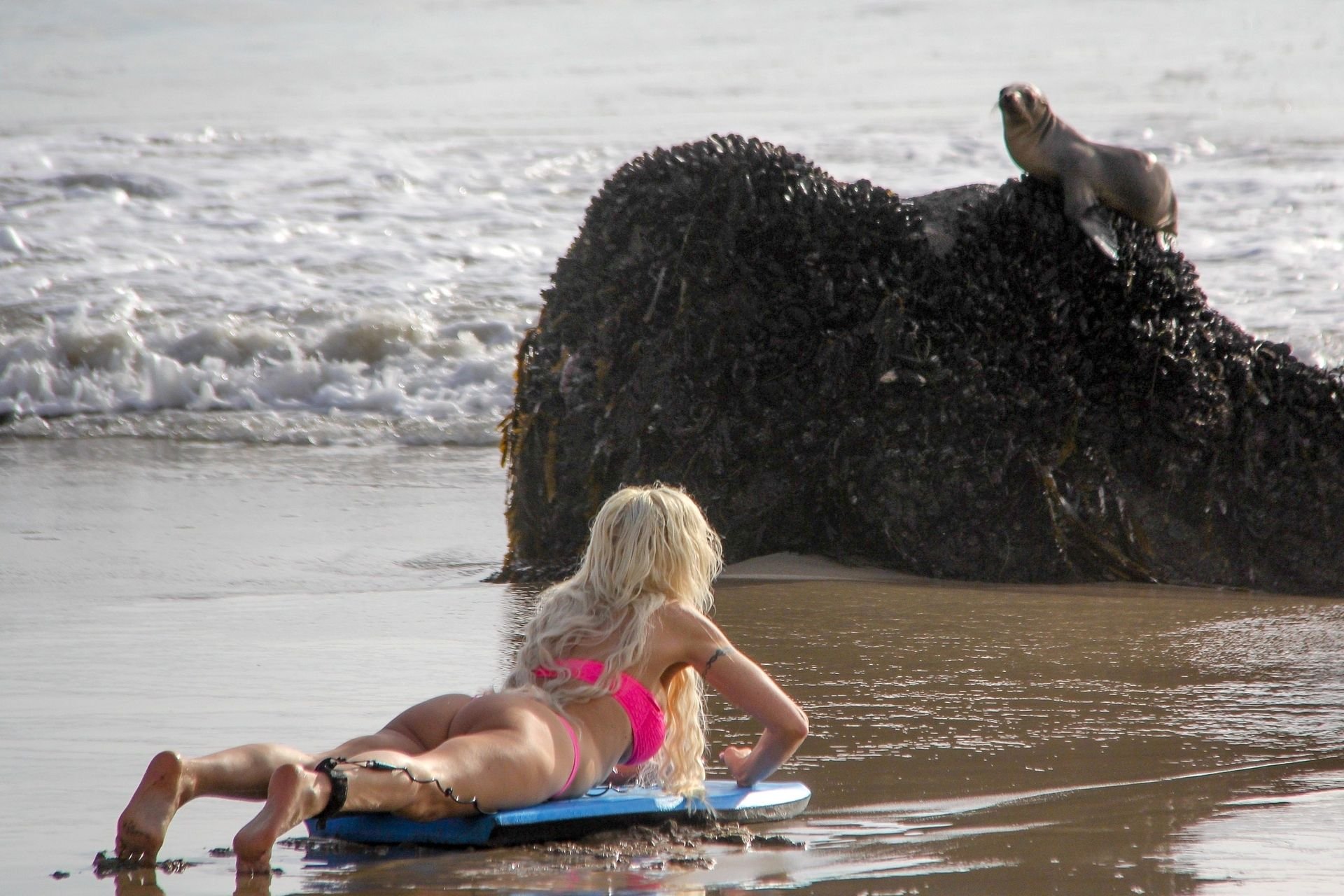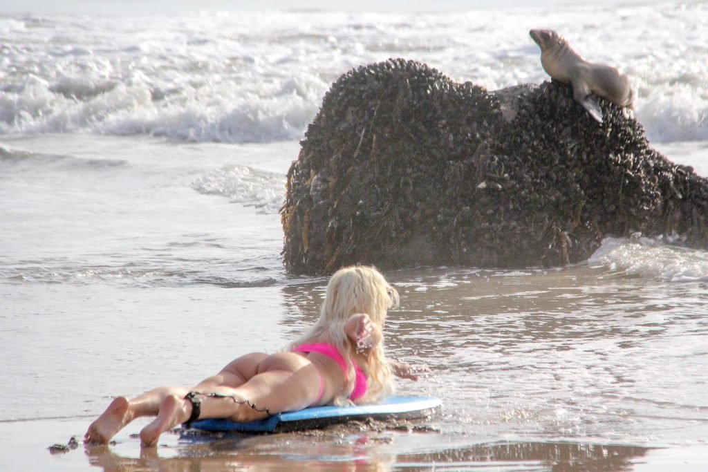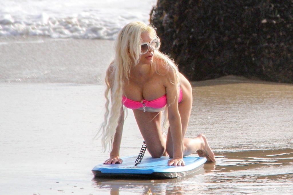 Blonde Angelique “Frenchy” Morgan foi vista de biquíni rosa na Praia de Malibu mostrando suas habilidades em bodyboard, 01/03/2019.