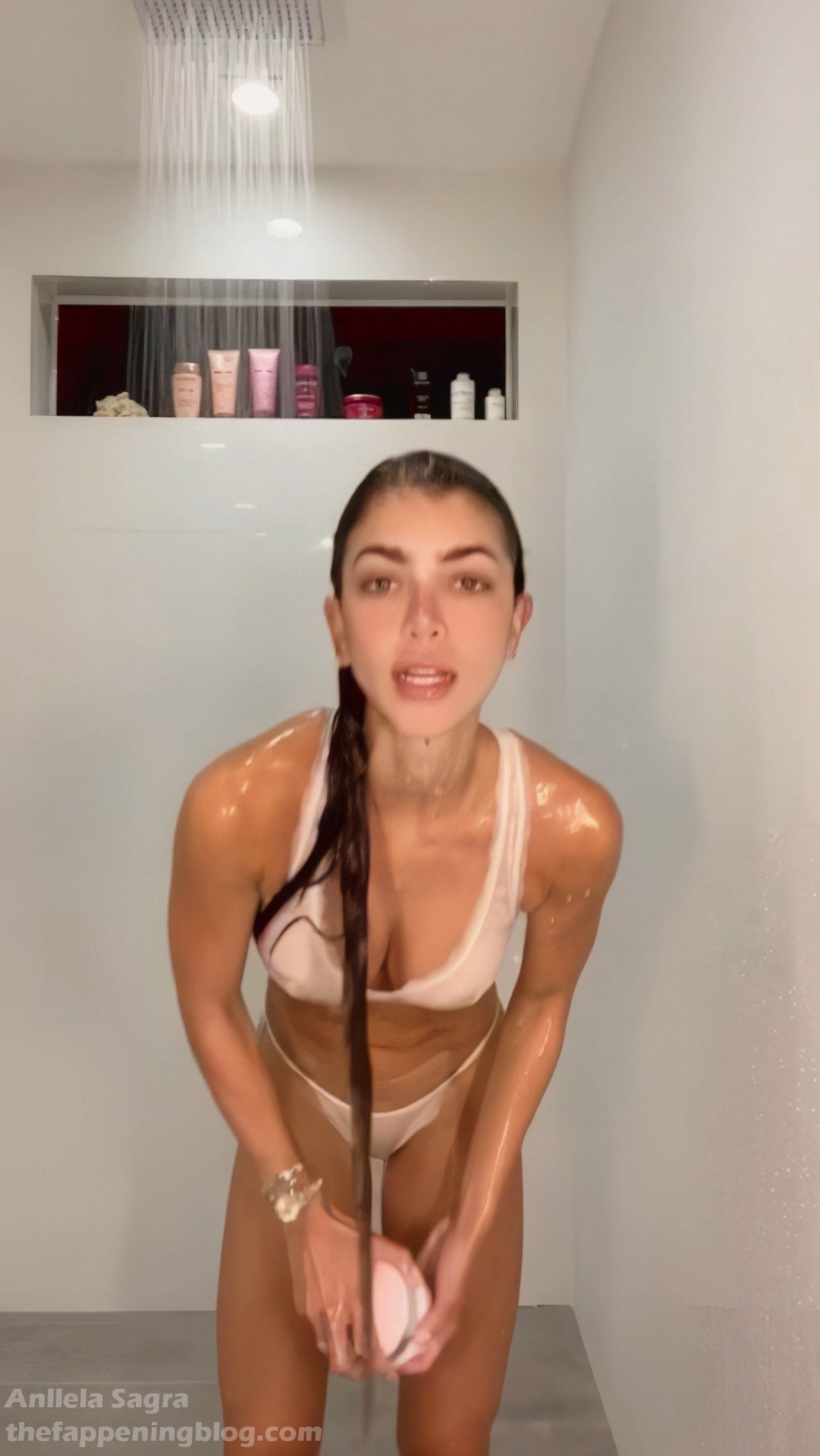 Modelo fitness Anllela Sagra exibe seus seios levemente nus em lingerie de renda enquanto posa molhada no chuveiro – Instagram, 09/03/2020.