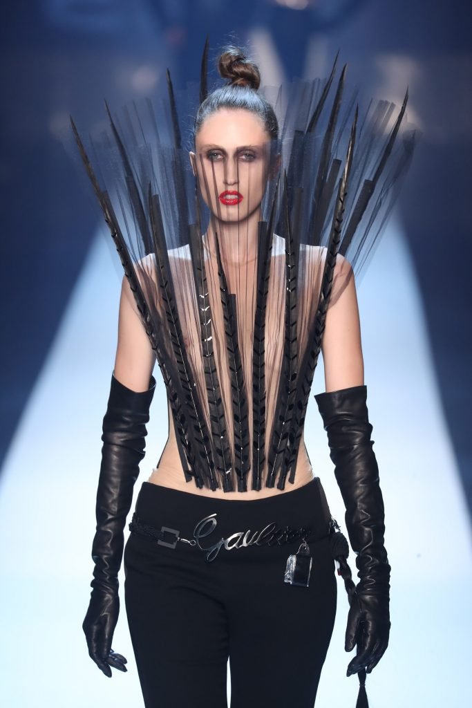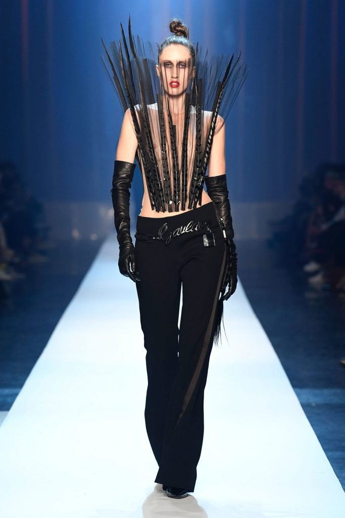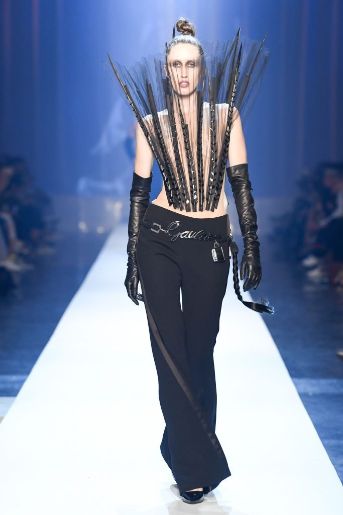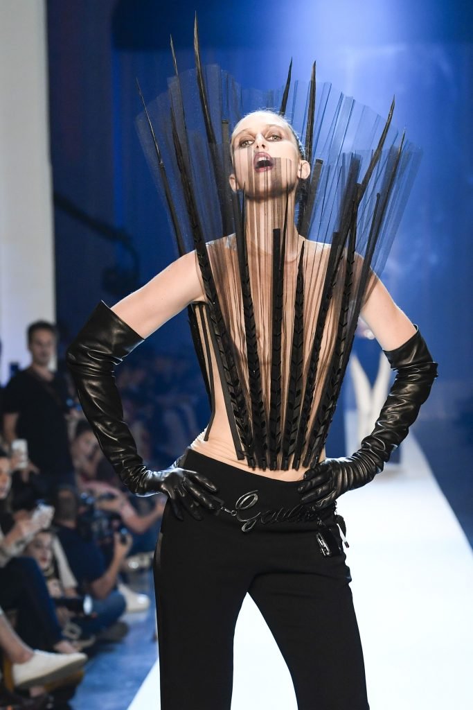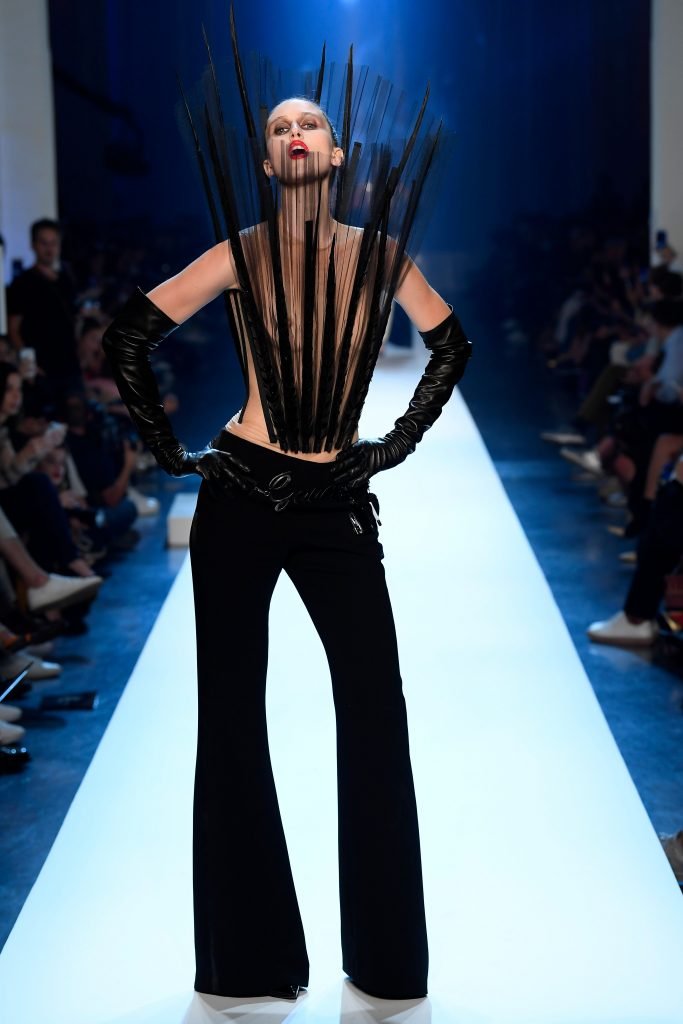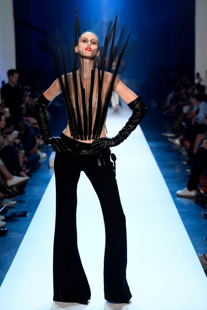 Model Anna Cleveland desfila durante a Semana de Moda Haute Couture Paris Outono/Inverno 2018/19 de Jean-Paul Gaultier realizada em Paris, França, 04/07/2018. Anna usava uma blusa estranha sem sutiã.