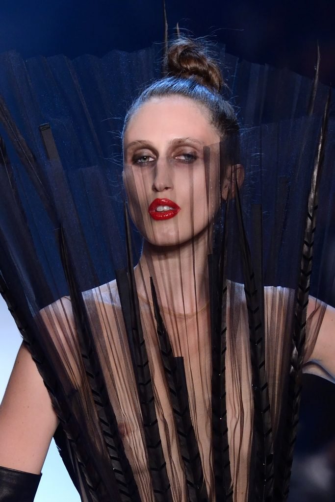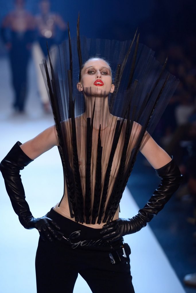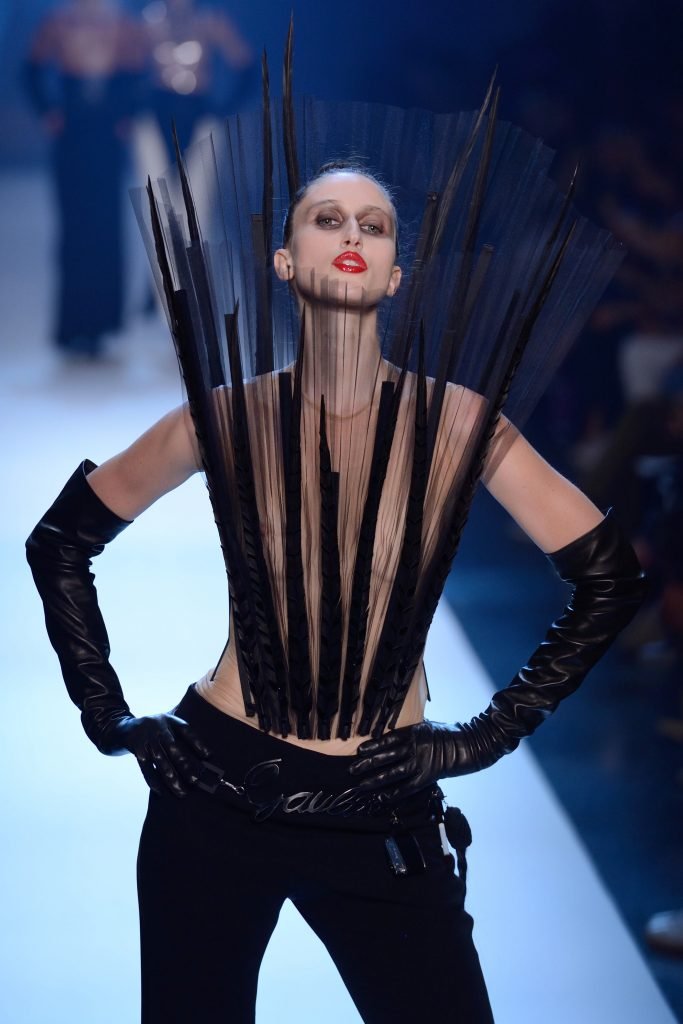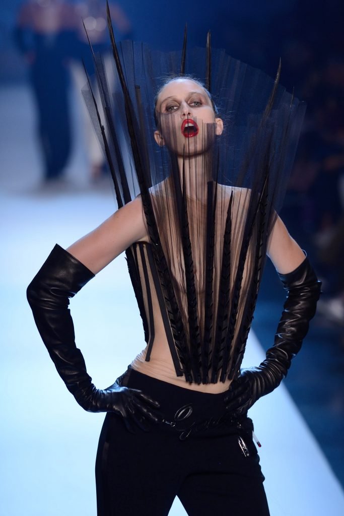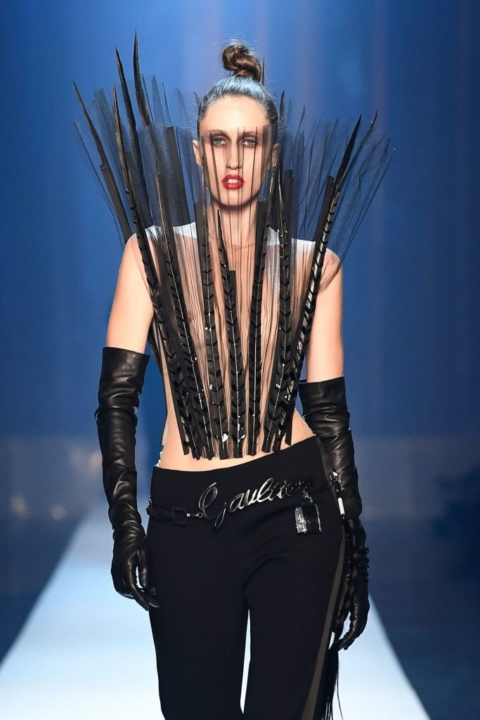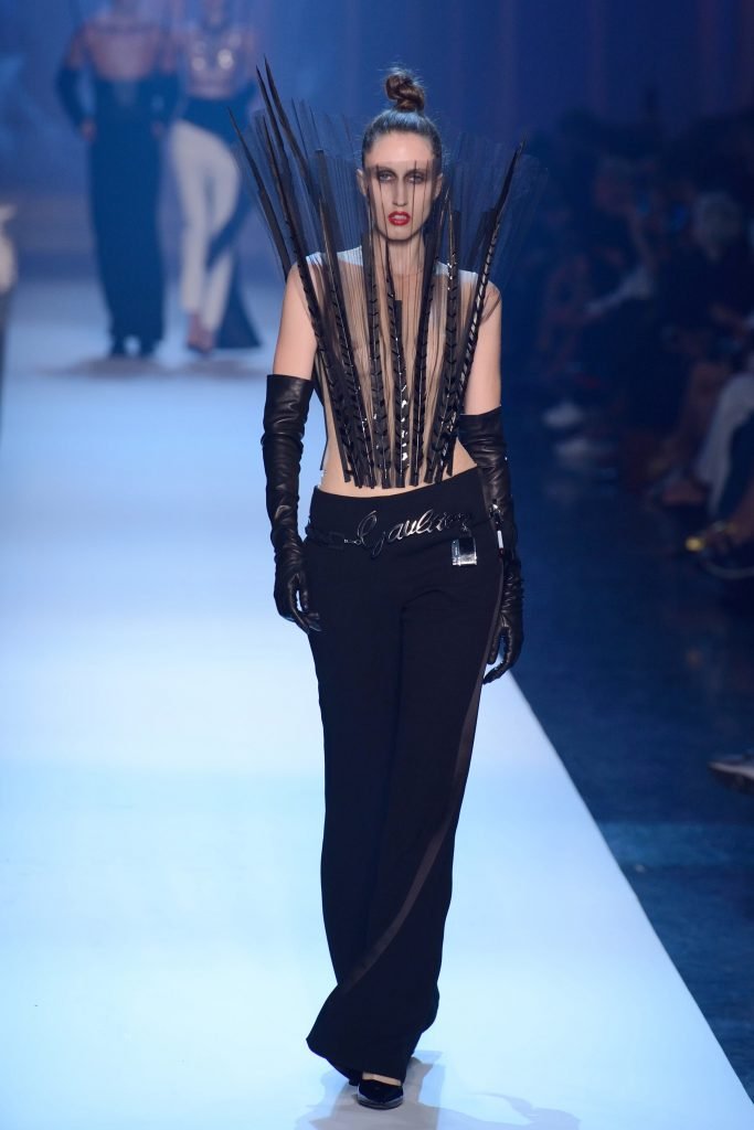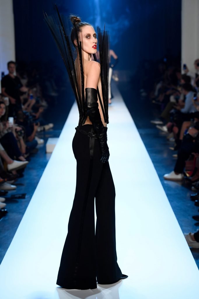 Model Anna Cleveland desfila durante a Semana de Moda Haute Couture Paris Outono/Inverno 2018/19 de Jean-Paul Gaultier realizada em Paris, França, 04/07/2018. Anna usava uma blusa estranha sem sutiã.