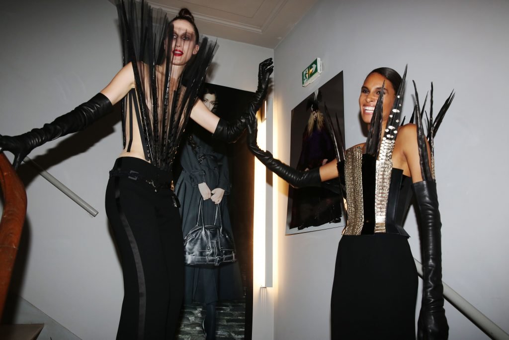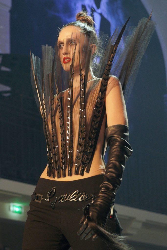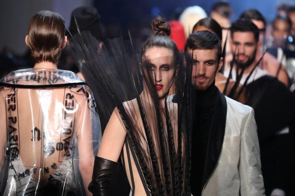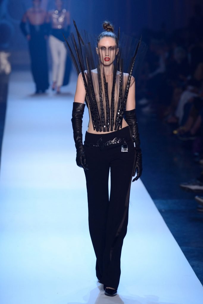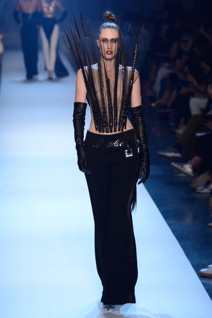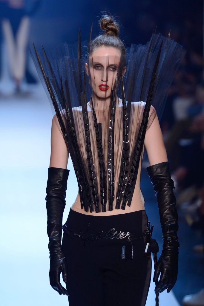 Model Anna Cleveland desfila durante a Semana de Moda Haute Couture Paris Outono/Inverno 2018/19 de Jean-Paul Gaultier realizada em Paris, França, 04/07/2018. Anna usava uma blusa estranha sem sutiã.