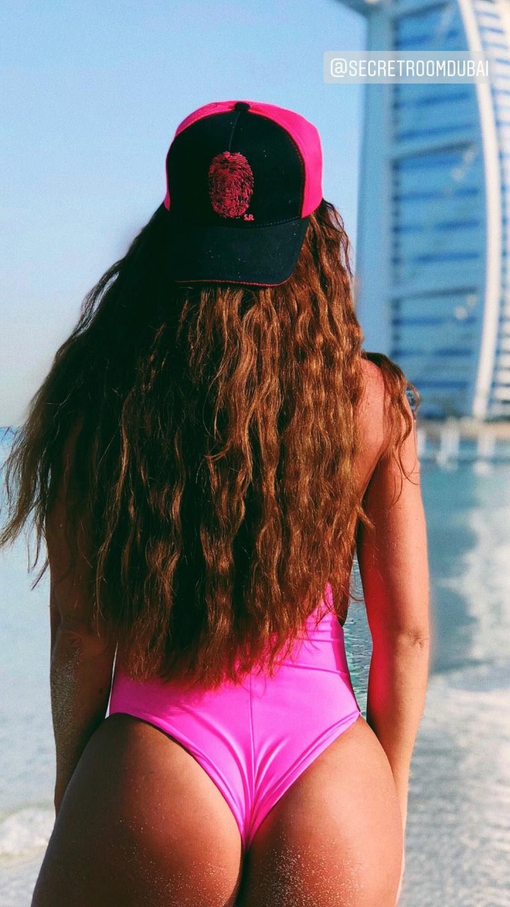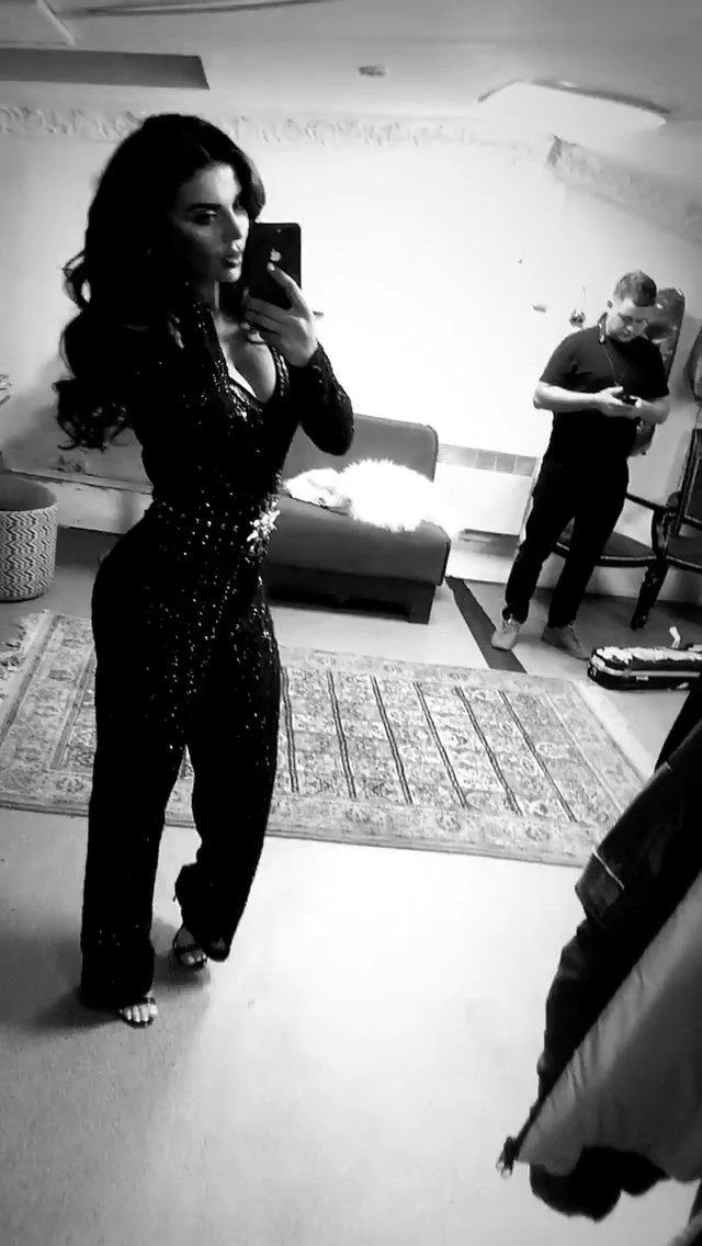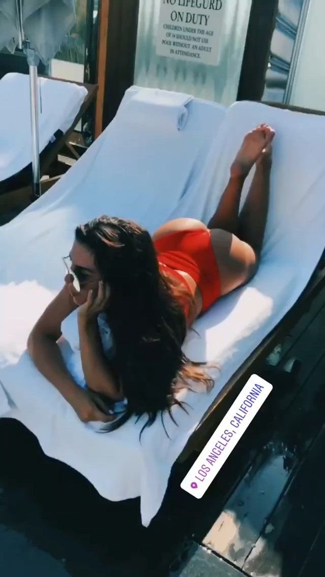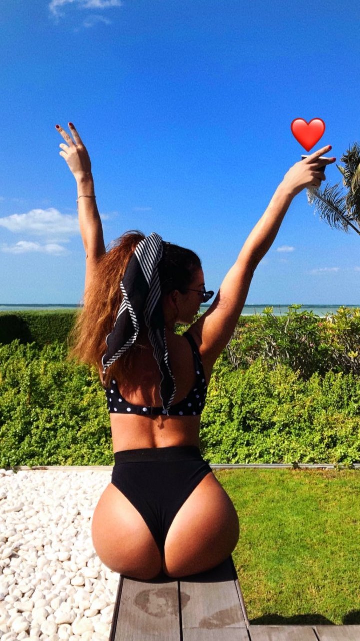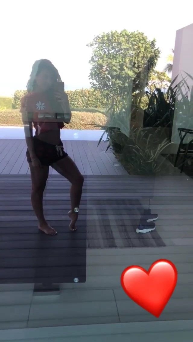Ela estava envolta em uma folha plástica vermelha na imagem que compartilhou com seus seguidores no Instagram. Outra foto tirada ao mesmo tempo mostra-a usando um top estilo basque para combinar com a folha plástica.