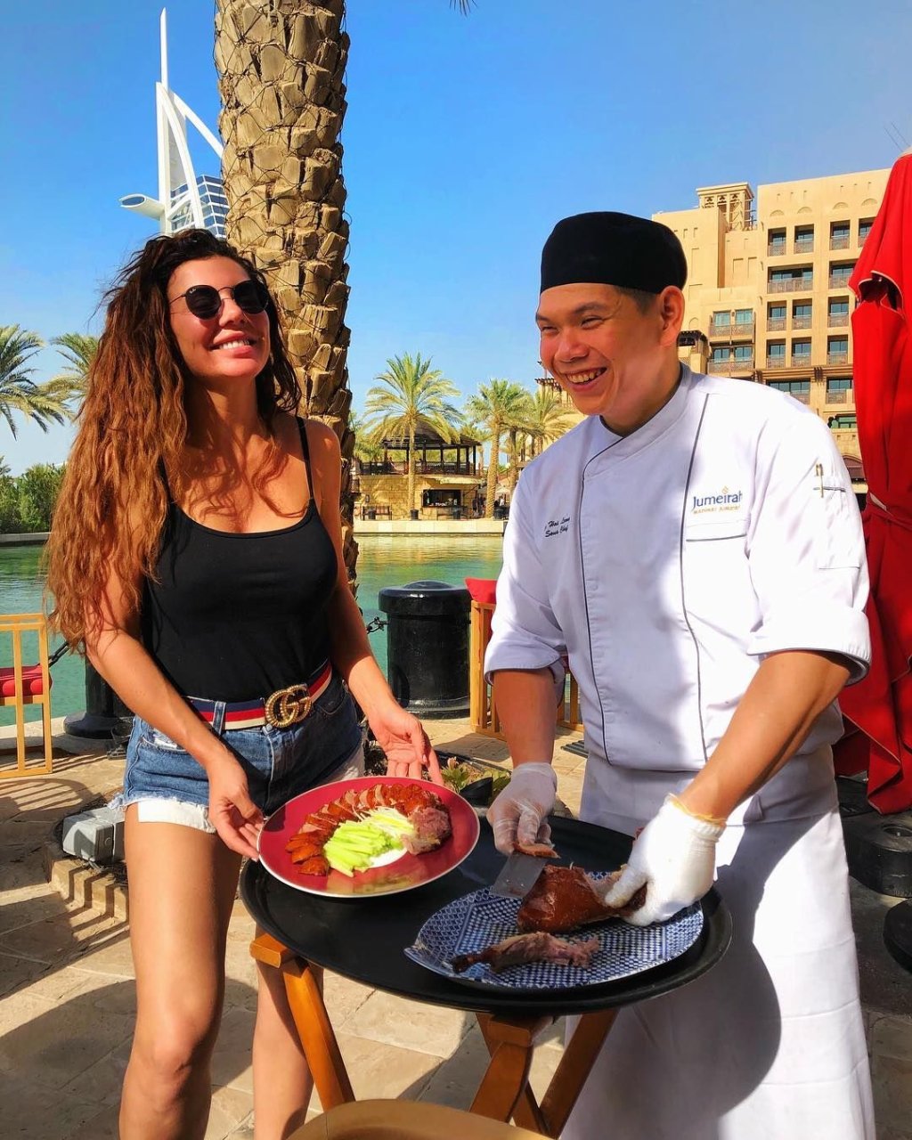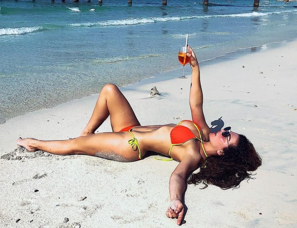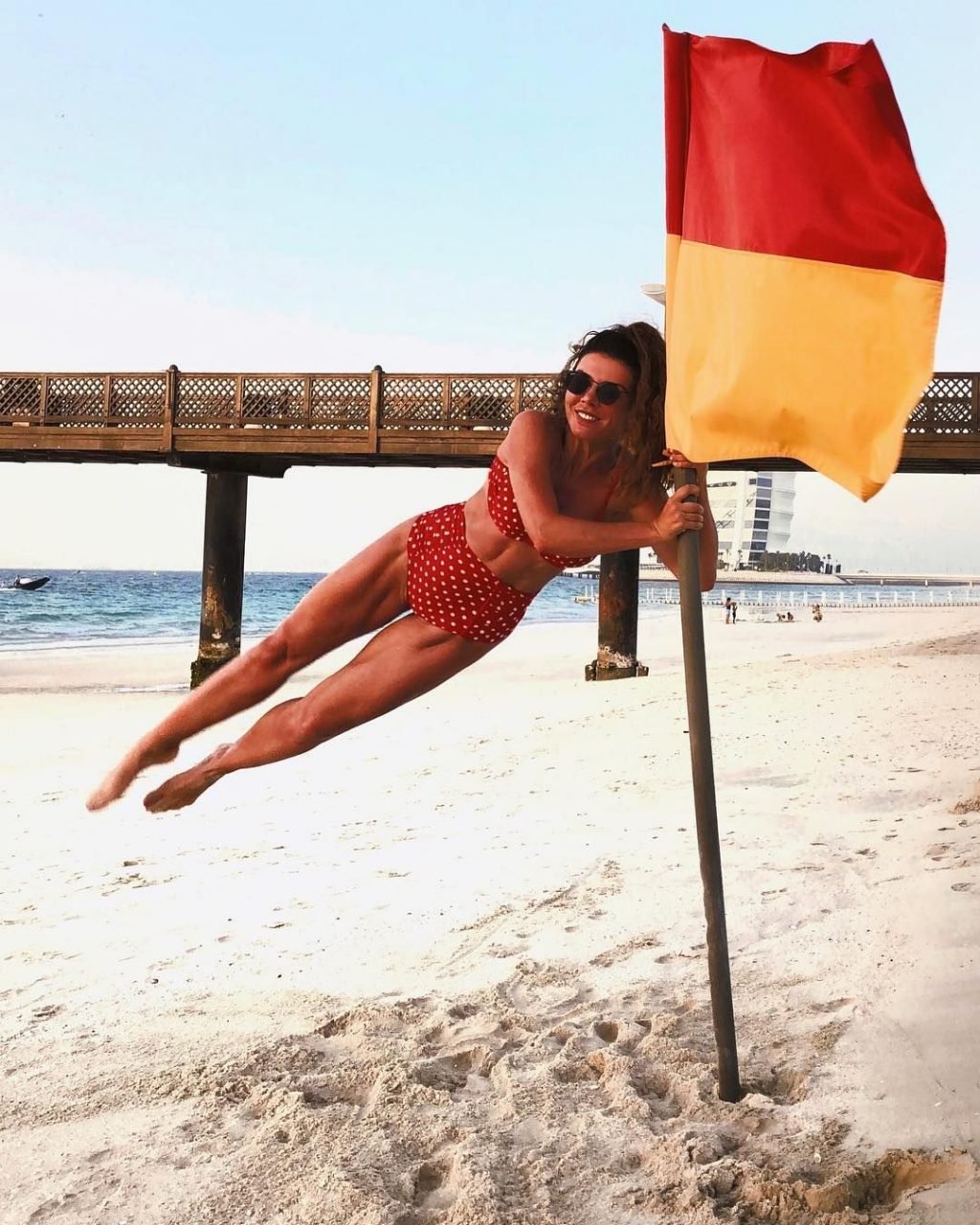 Ela estava envolta em uma folha plástica vermelha na imagem que compartilhou com seus seguidores no Instagram. Outra foto tirada ao mesmo tempo mostra-a usando um top estilo basque para combinar com a folha plástica.