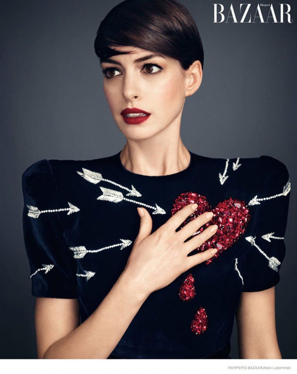 A atriz de Hollywood Anne Hathaway tornou-se a personagem principal da edição de novembro de 2014 da Harper’s Bazaar US. A sessão de fotos foi concebida em duas cores – preto e vermelho. Para a capa, a atriz vestiu um deslumbrante vestido vermelho de Giorgio Armani.