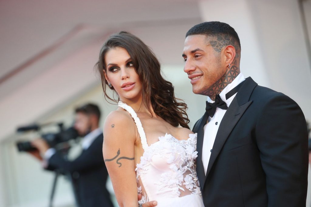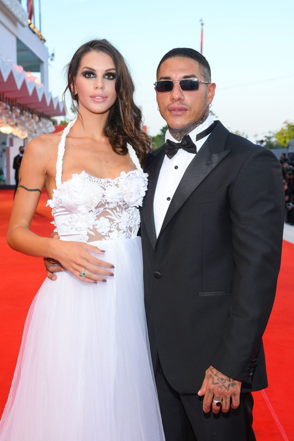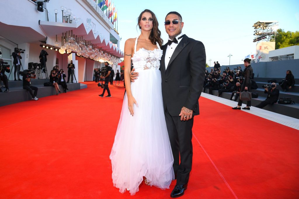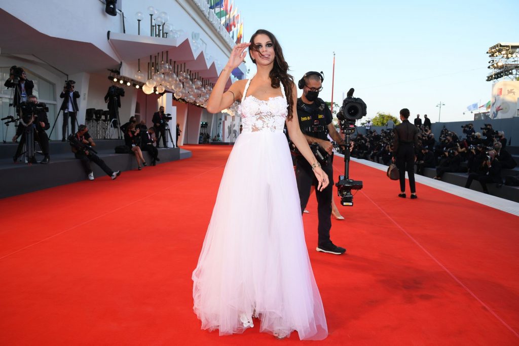 Sexy modelo italiana Antonella Fiordelisi exibe seu decote posando com um vestido branco no tapete vermelho antes do filme “Le Sorelle Macaluso” no 77º Festival de Cinema de Veneza em Veneza, 09/09/2020.
