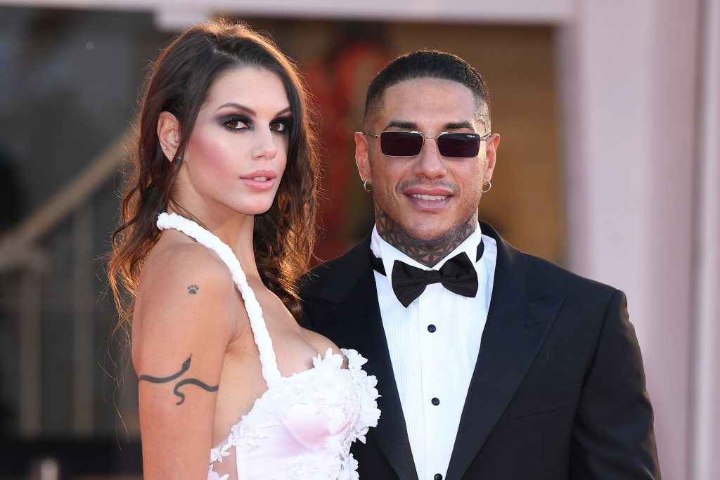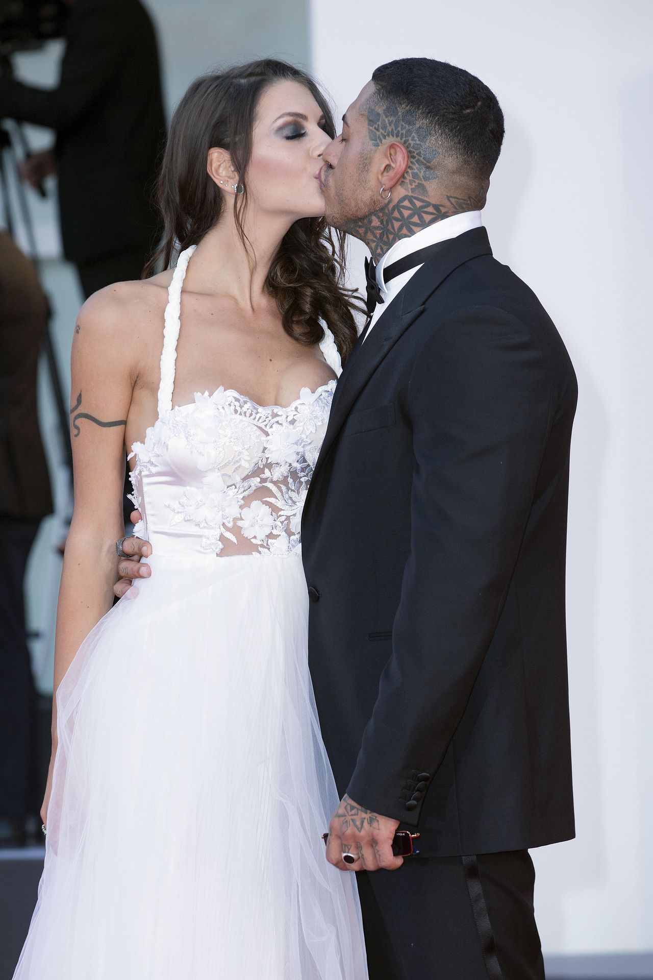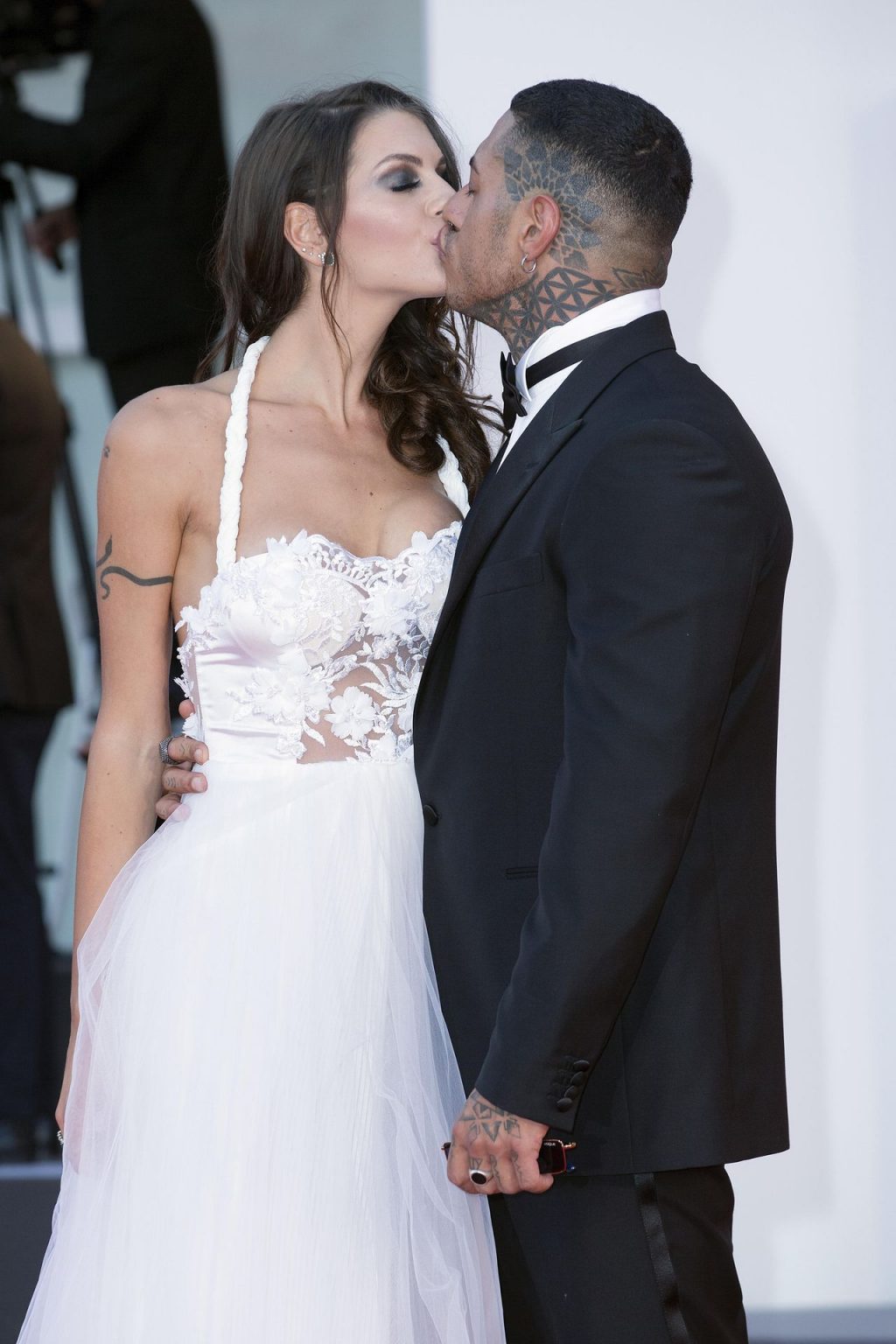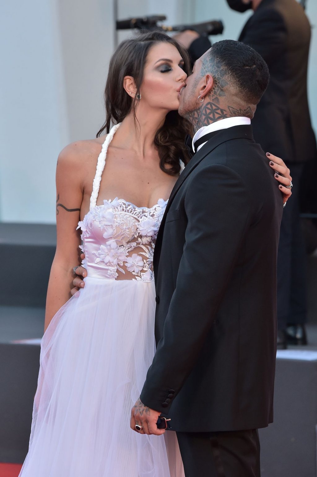 Sexy modelo italiana Antonella Fiordelisi exibe seu decote posando com um vestido branco no tapete vermelho antes do filme “Le Sorelle Macaluso” no 77º Festival de Cinema de Veneza em Veneza, 09/09/2020.