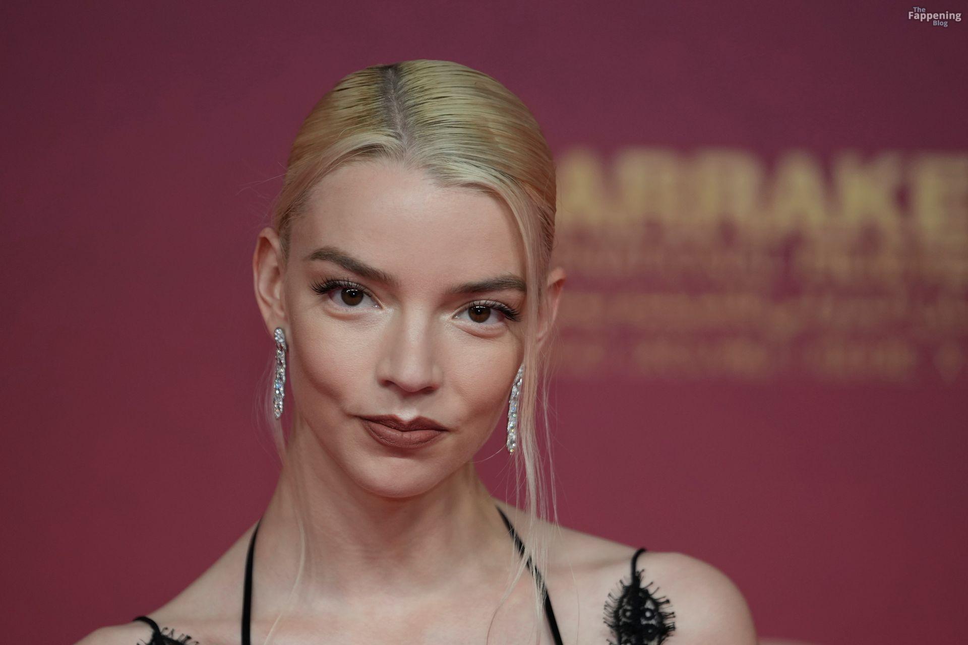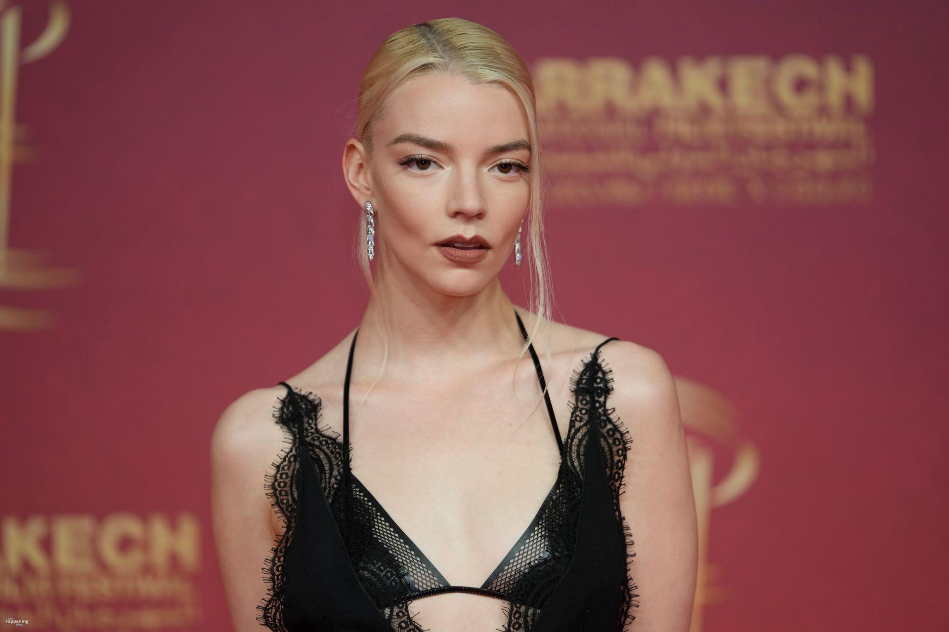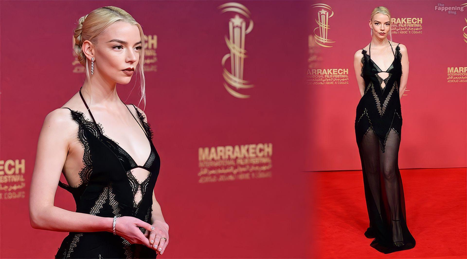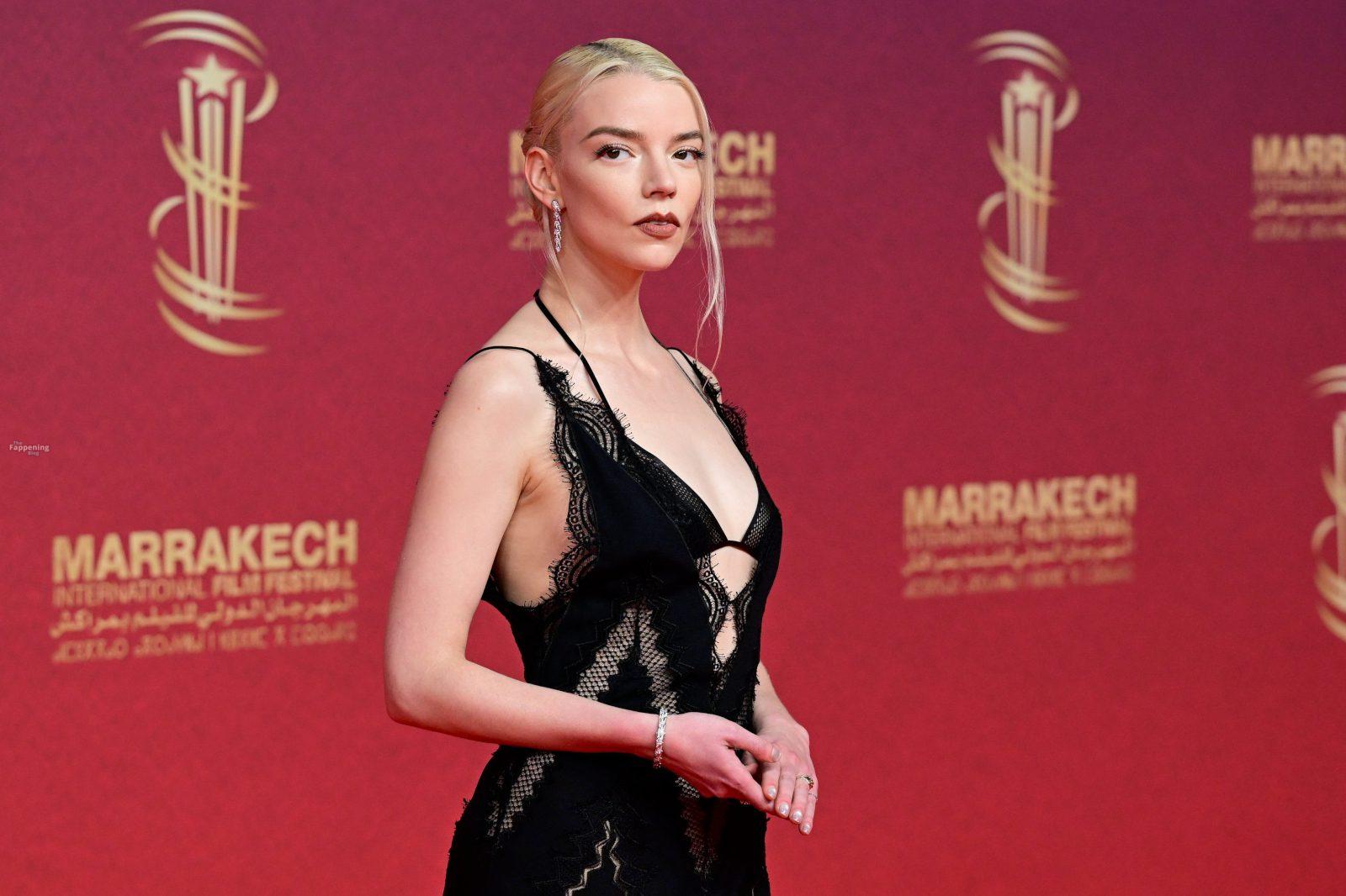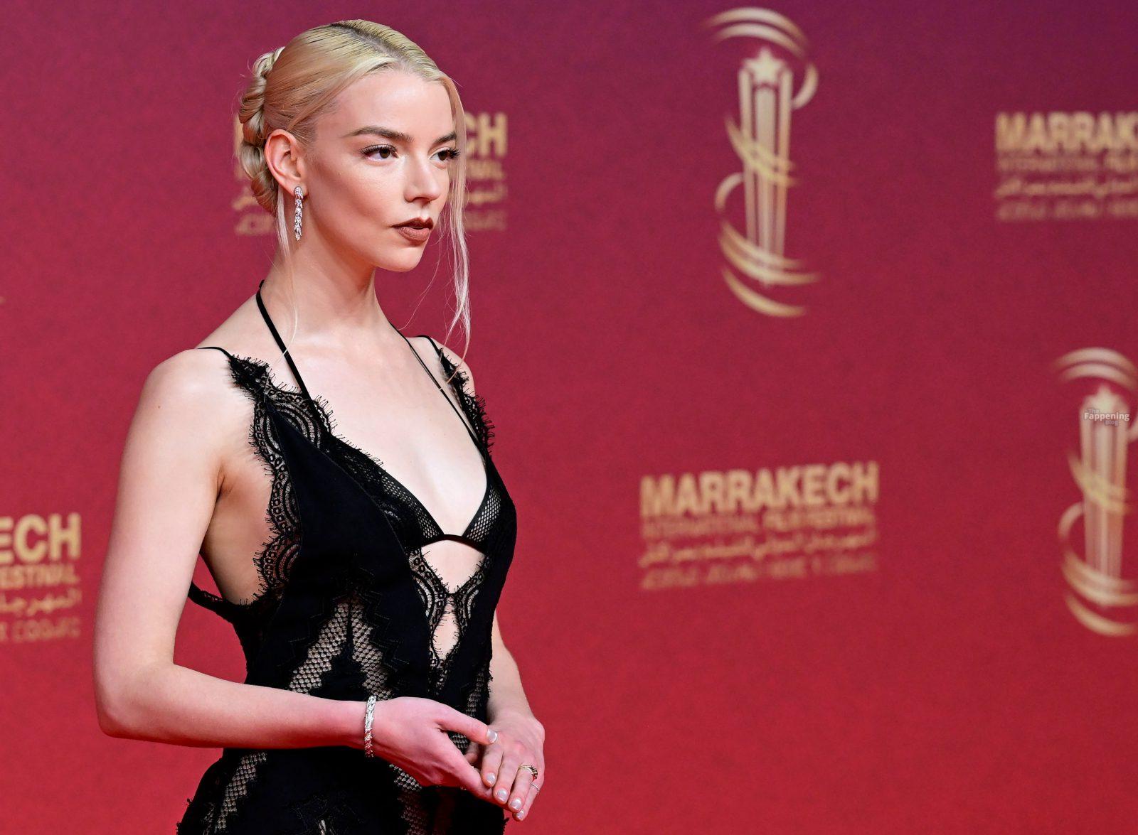 A atriz americana Anya Taylor-Joy posa com um vestido de renda transparente mostrando suas pernas no tapete vermelho ao chegar para a cerimônia de encerramento do 22º Festival de Cinema de Marrakesh (FIFM) em Marrakesh.