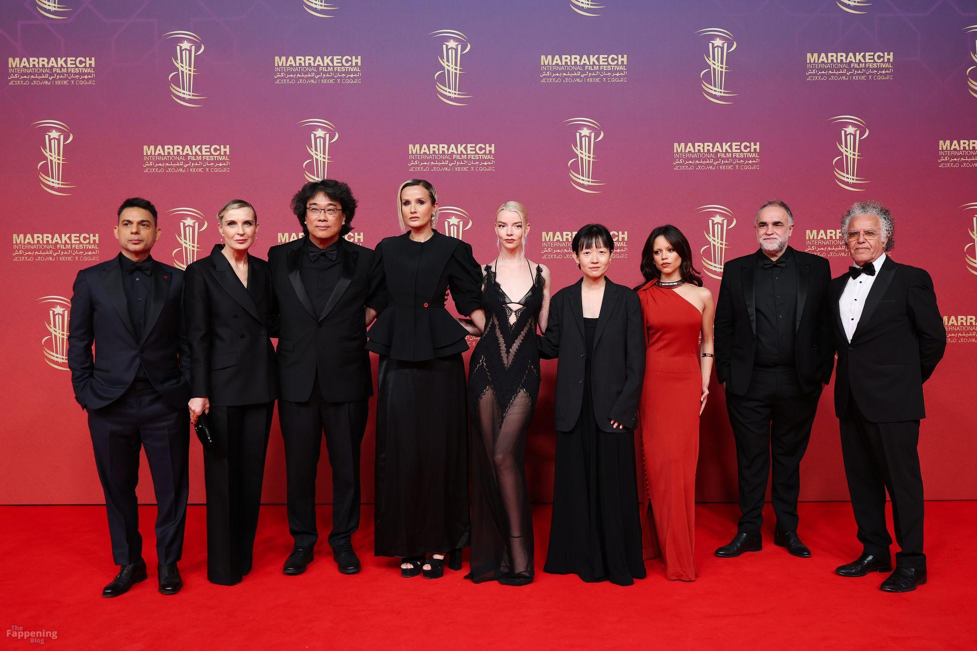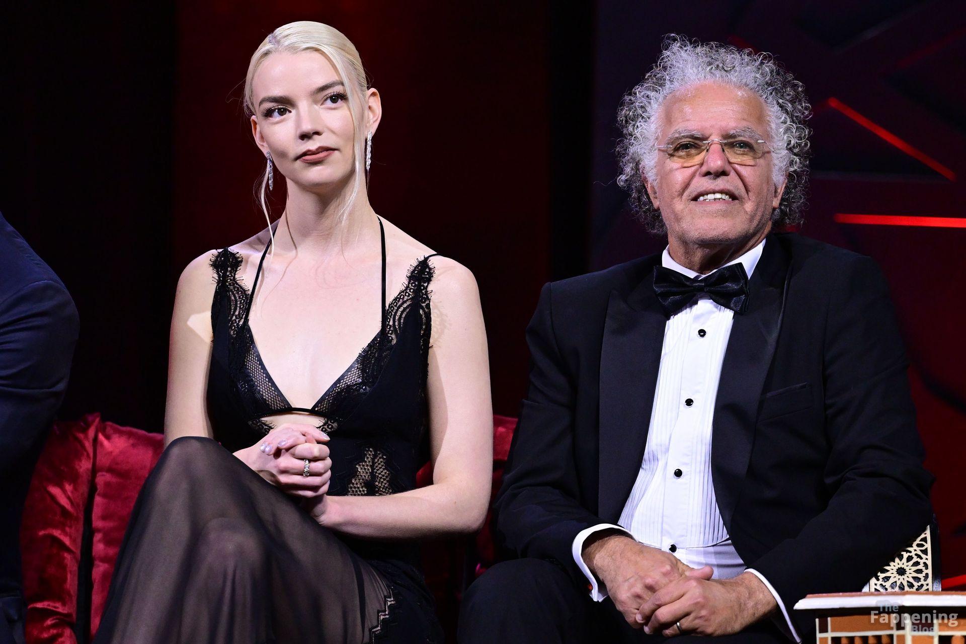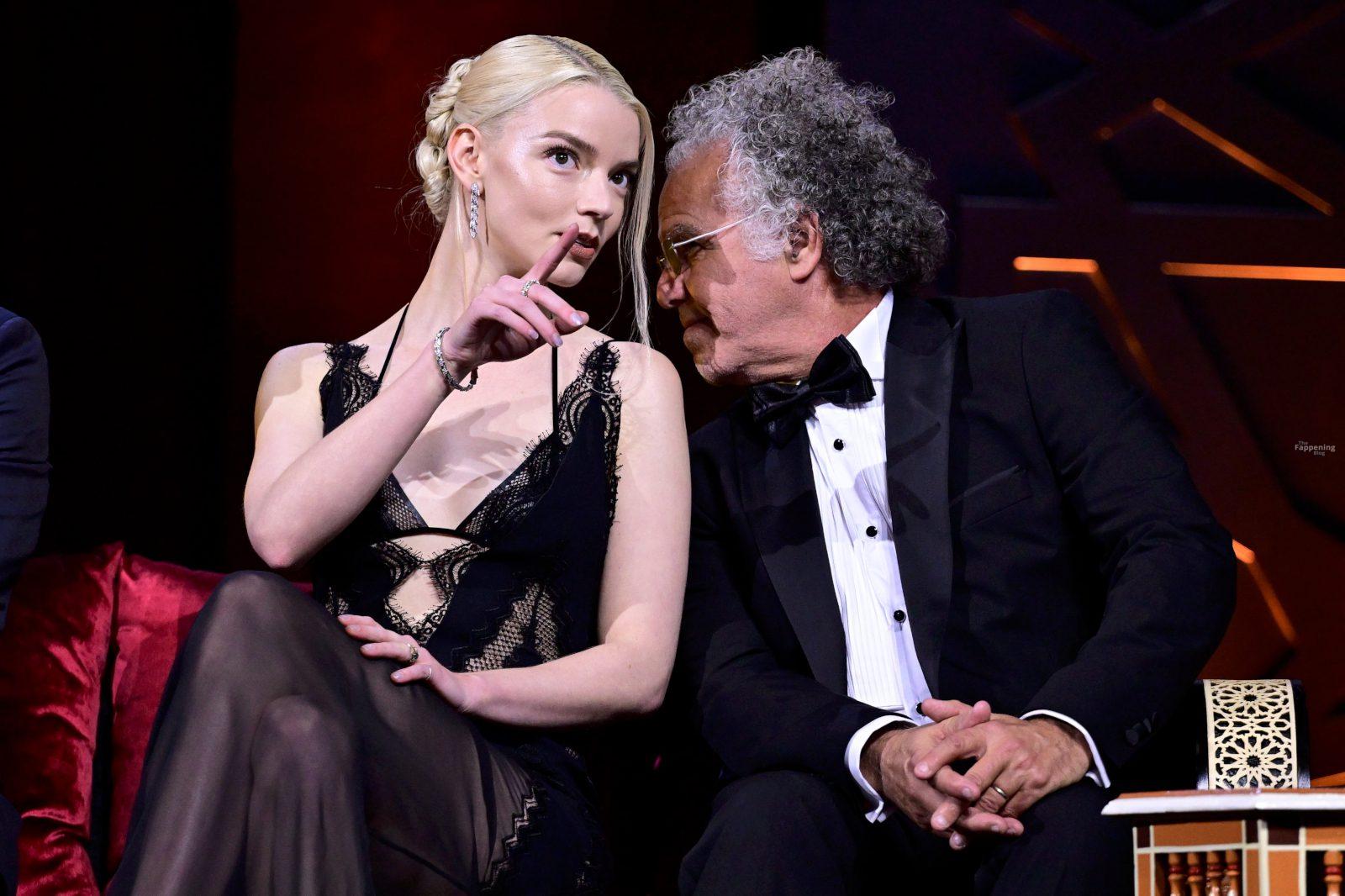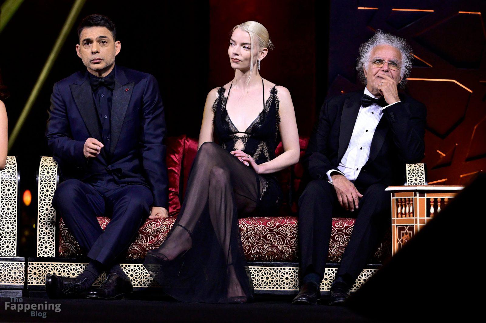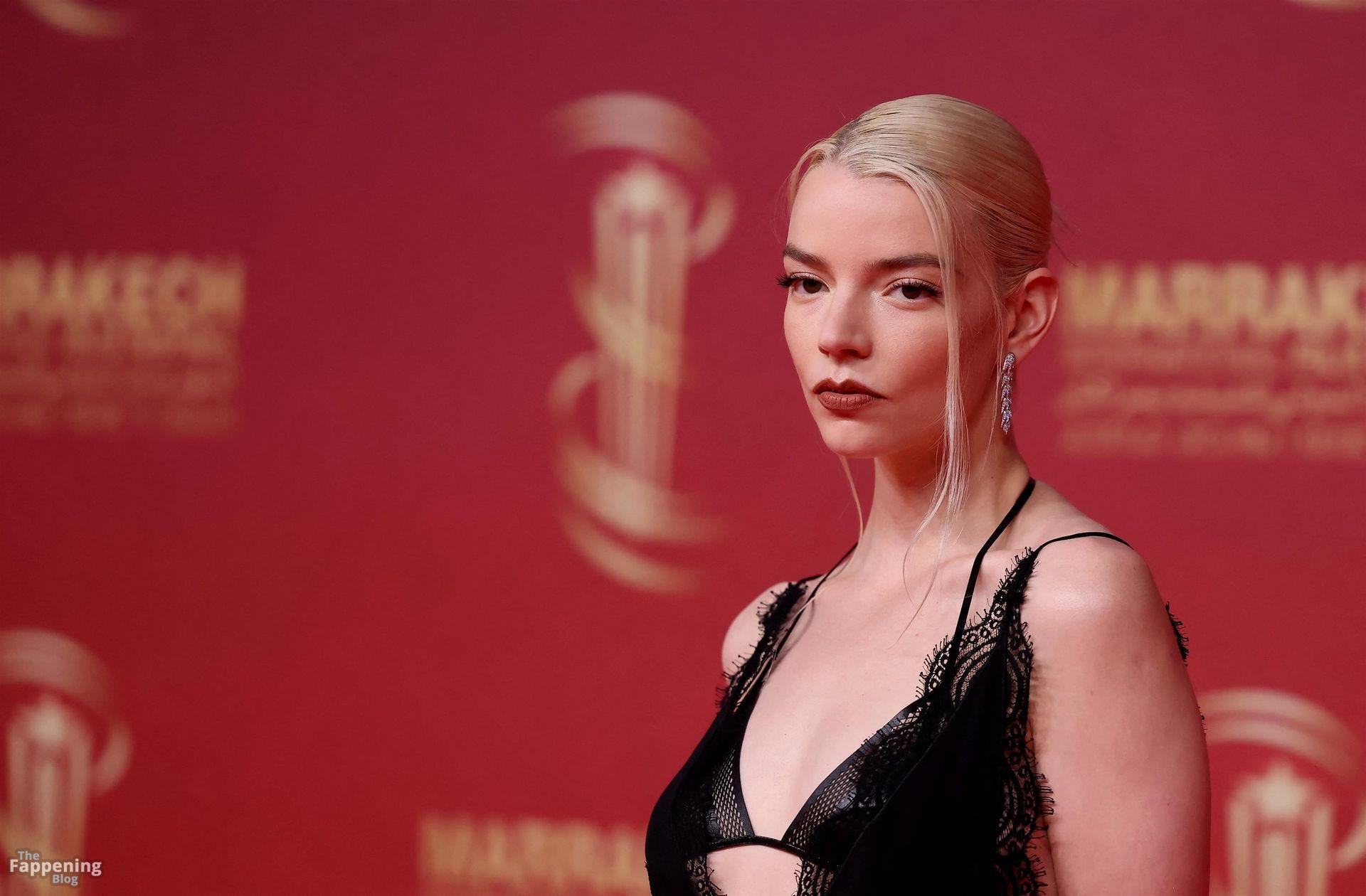 A atriz americana Anya Taylor-Joy posa com um vestido de renda transparente mostrando suas pernas no tapete vermelho ao chegar para a cerimônia de encerramento do 22º Festival de Cinema de Marrakesh (FIFM) em Marrakesh.