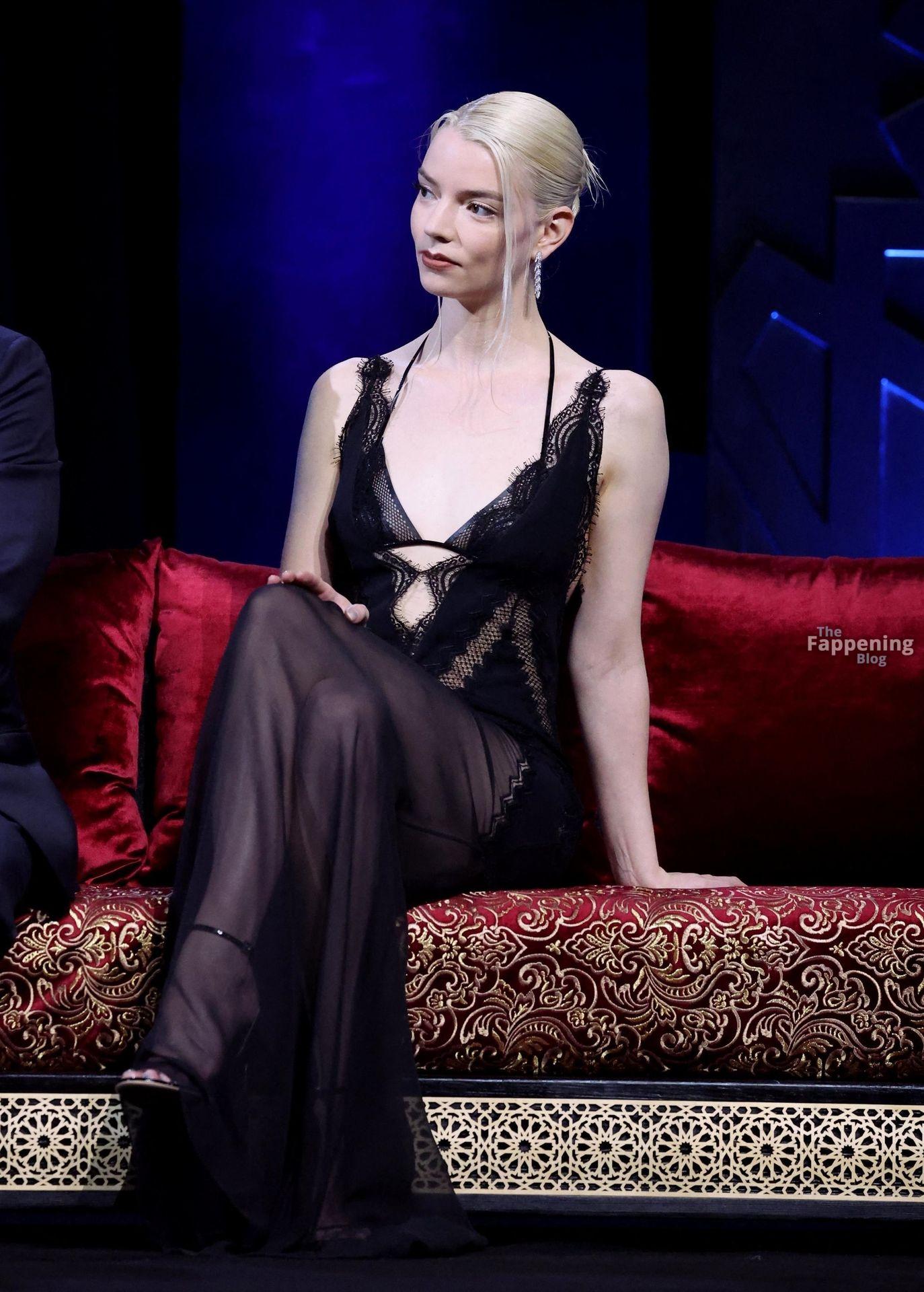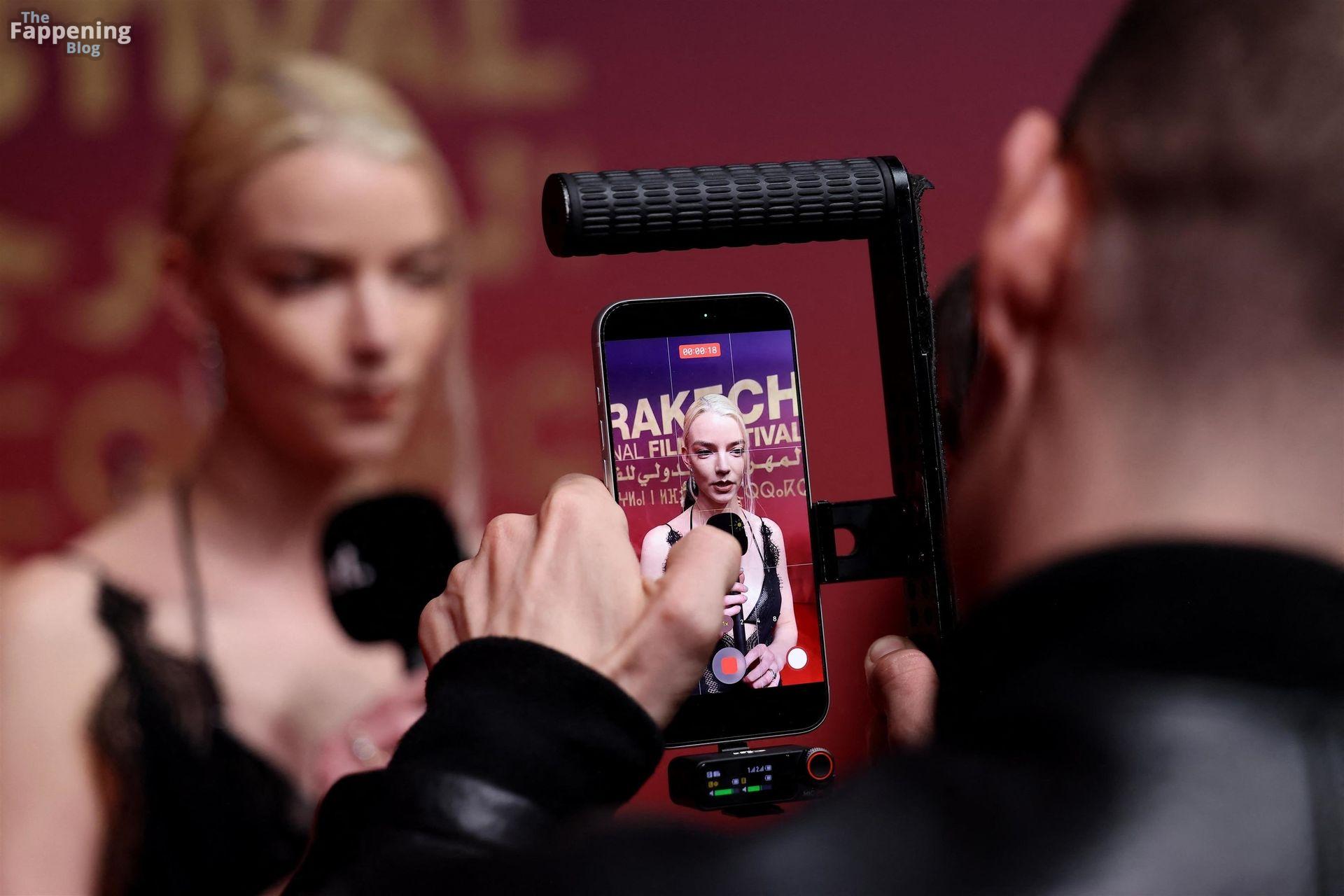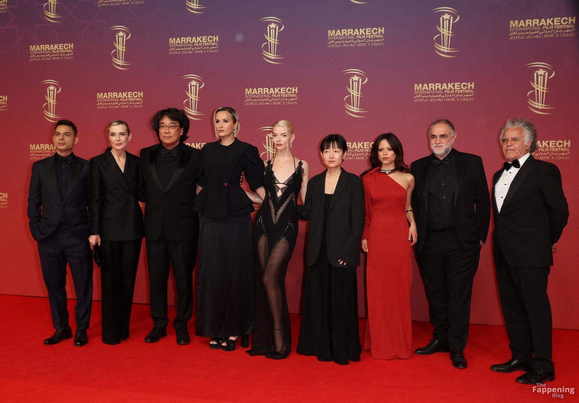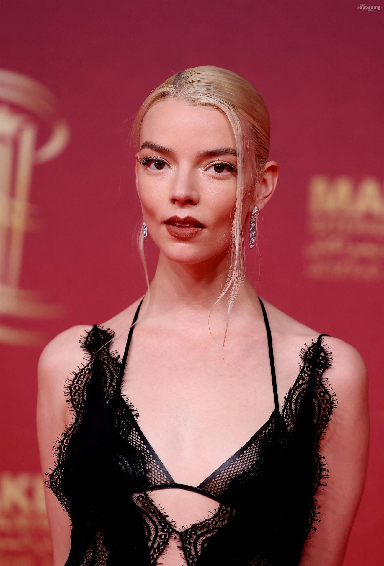A atriz americana Anya Taylor-Joy posa com um vestido de renda transparente mostrando suas pernas no tapete vermelho ao chegar para a cerimônia de encerramento do 22º Festival de Cinema de Marrakesh (FIFM) em Marrakesh.