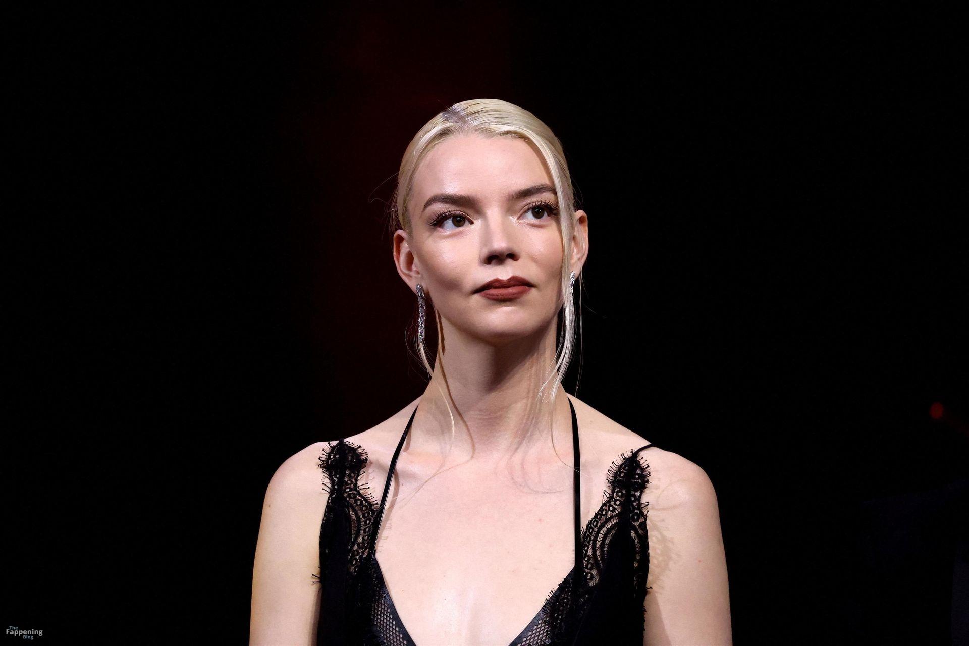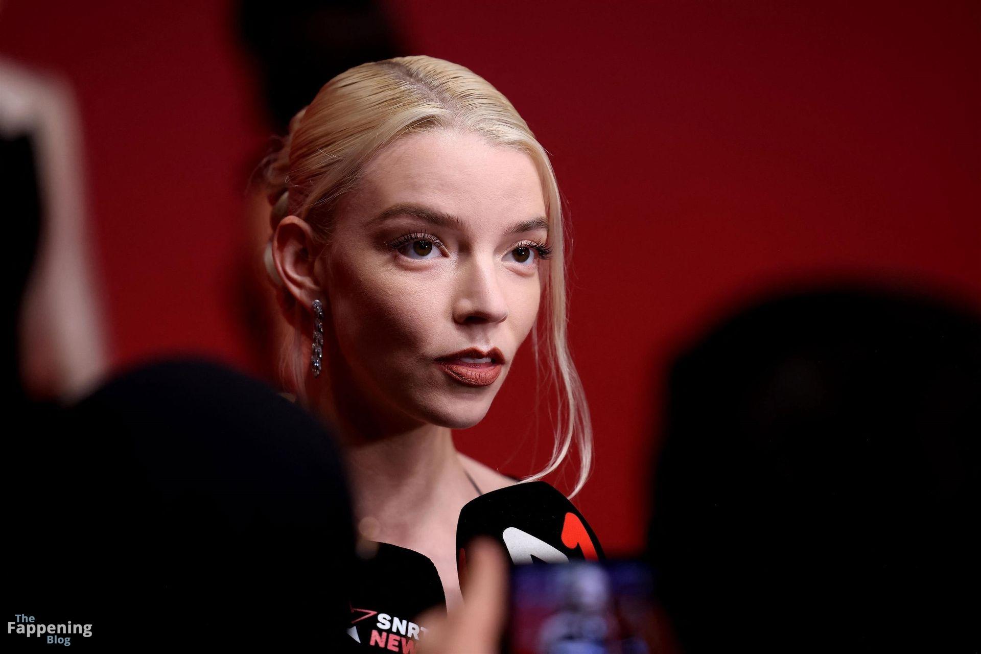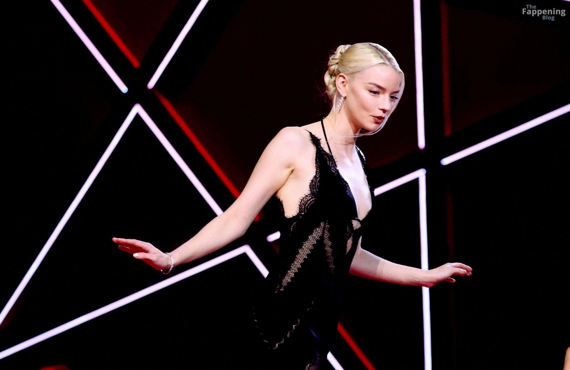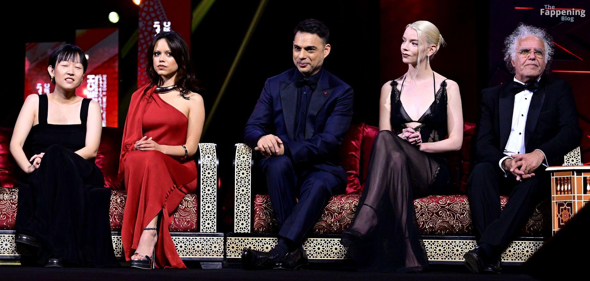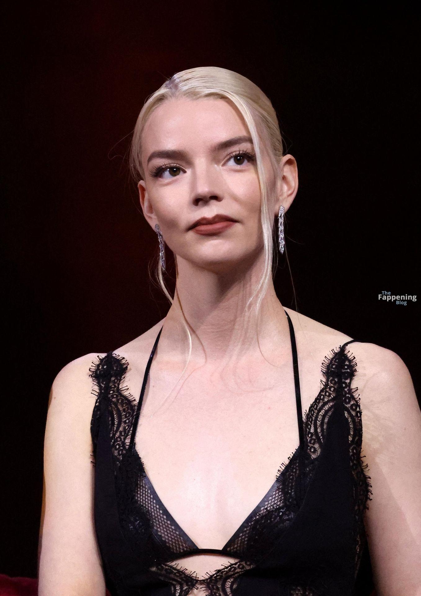 A atriz americana Anya Taylor-Joy posa com um vestido de renda transparente mostrando suas pernas no tapete vermelho ao chegar para a cerimônia de encerramento do 22º Festival de Cinema de Marrakesh (FIFM) em Marrakesh.