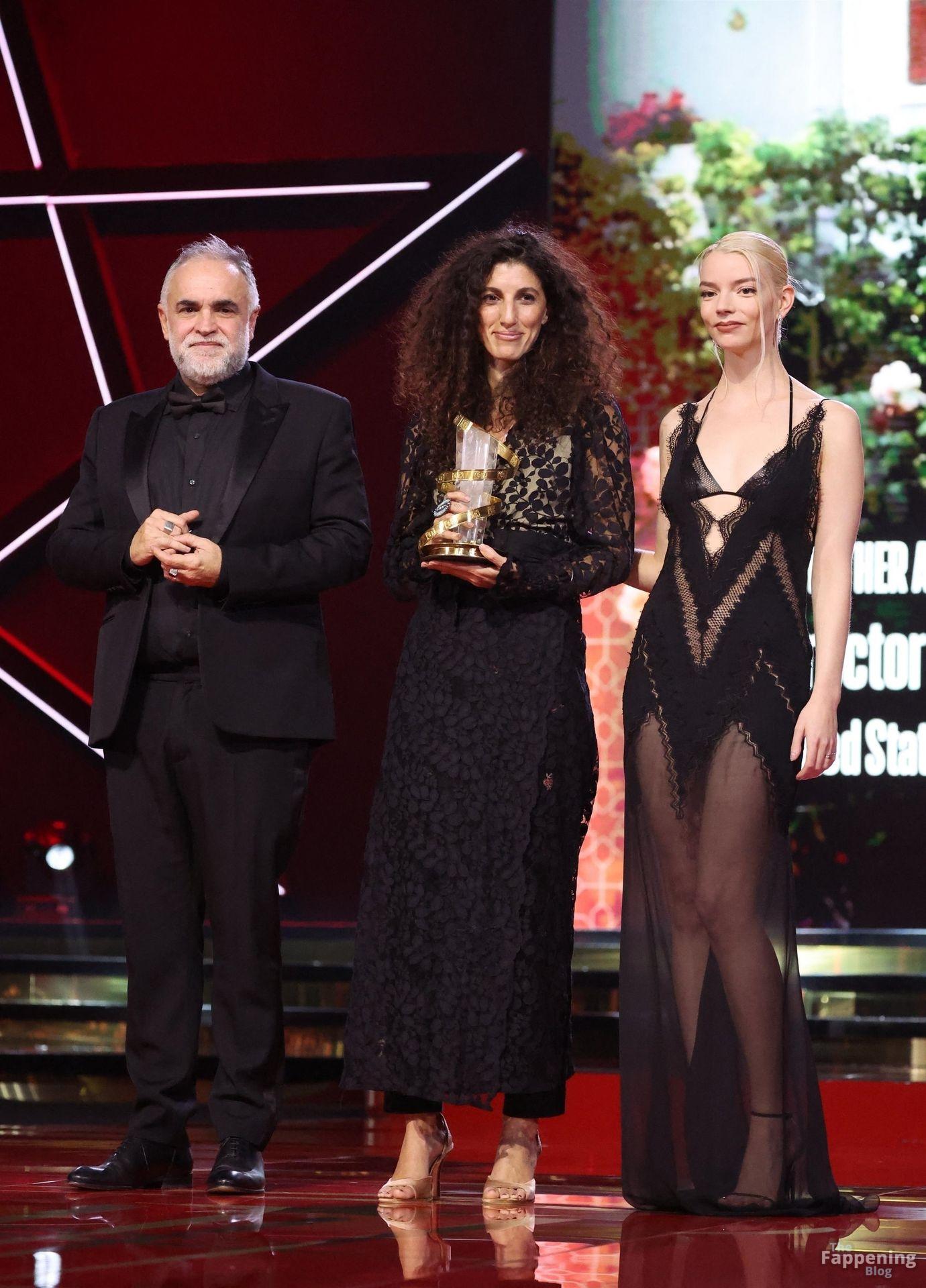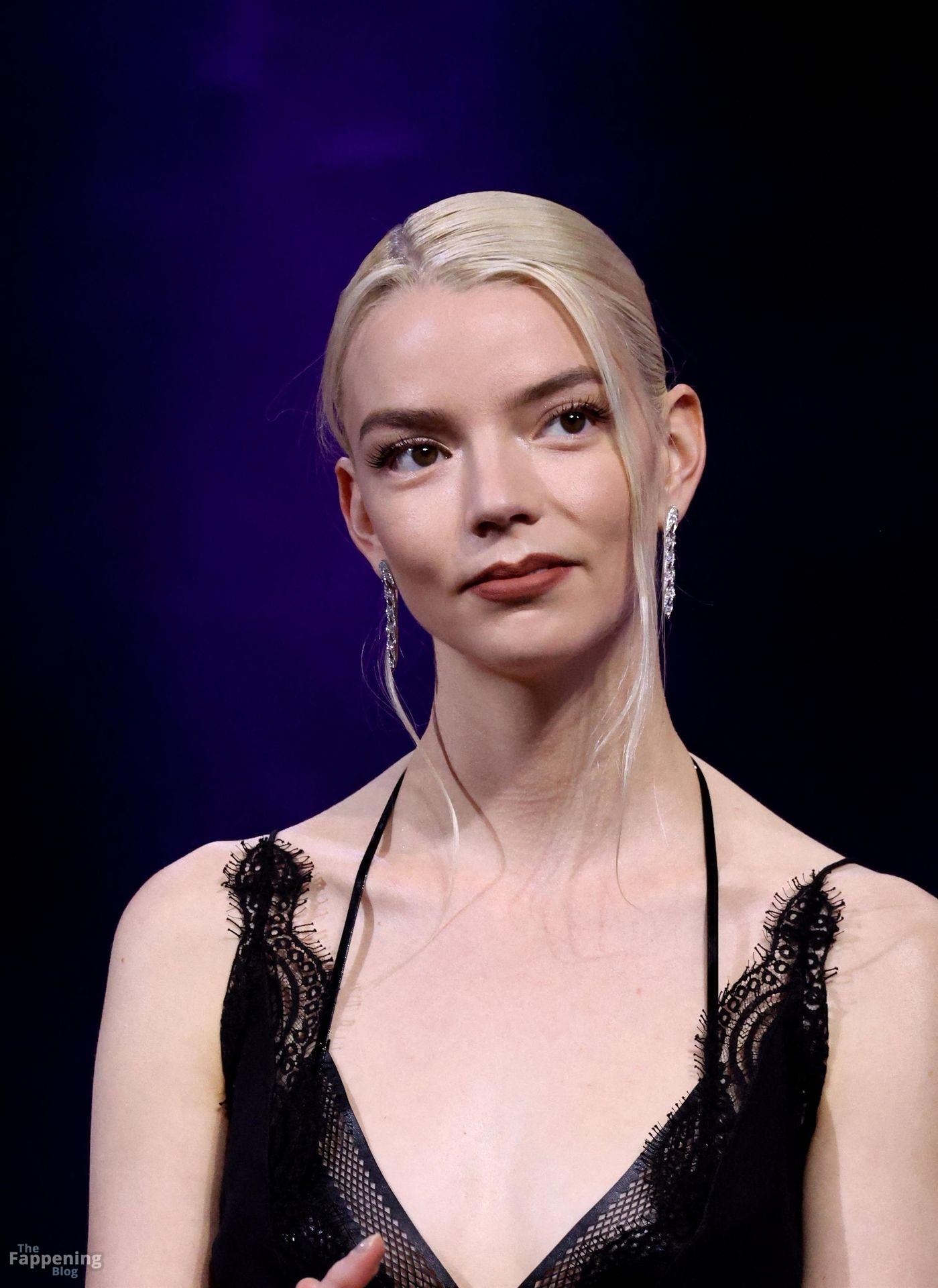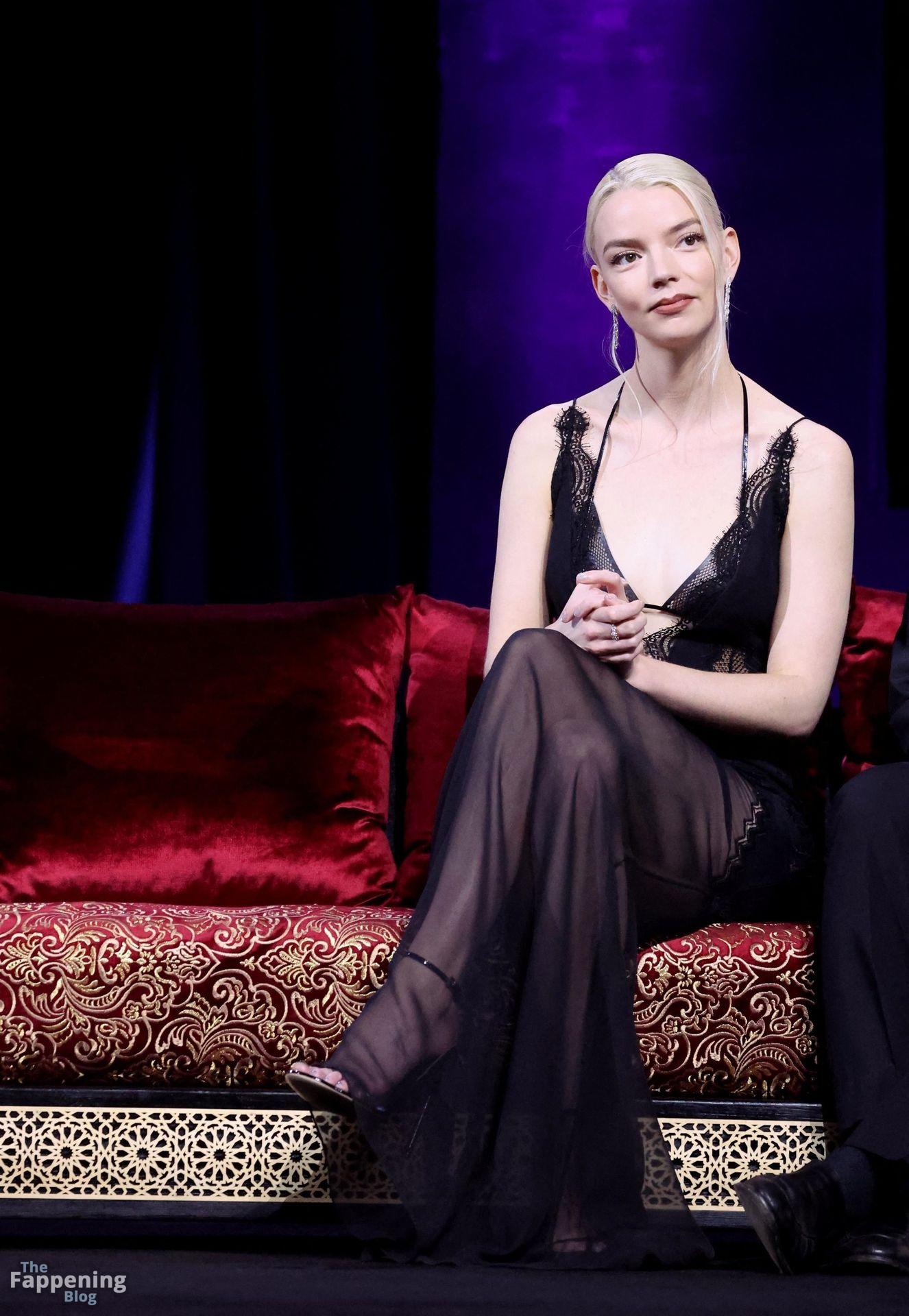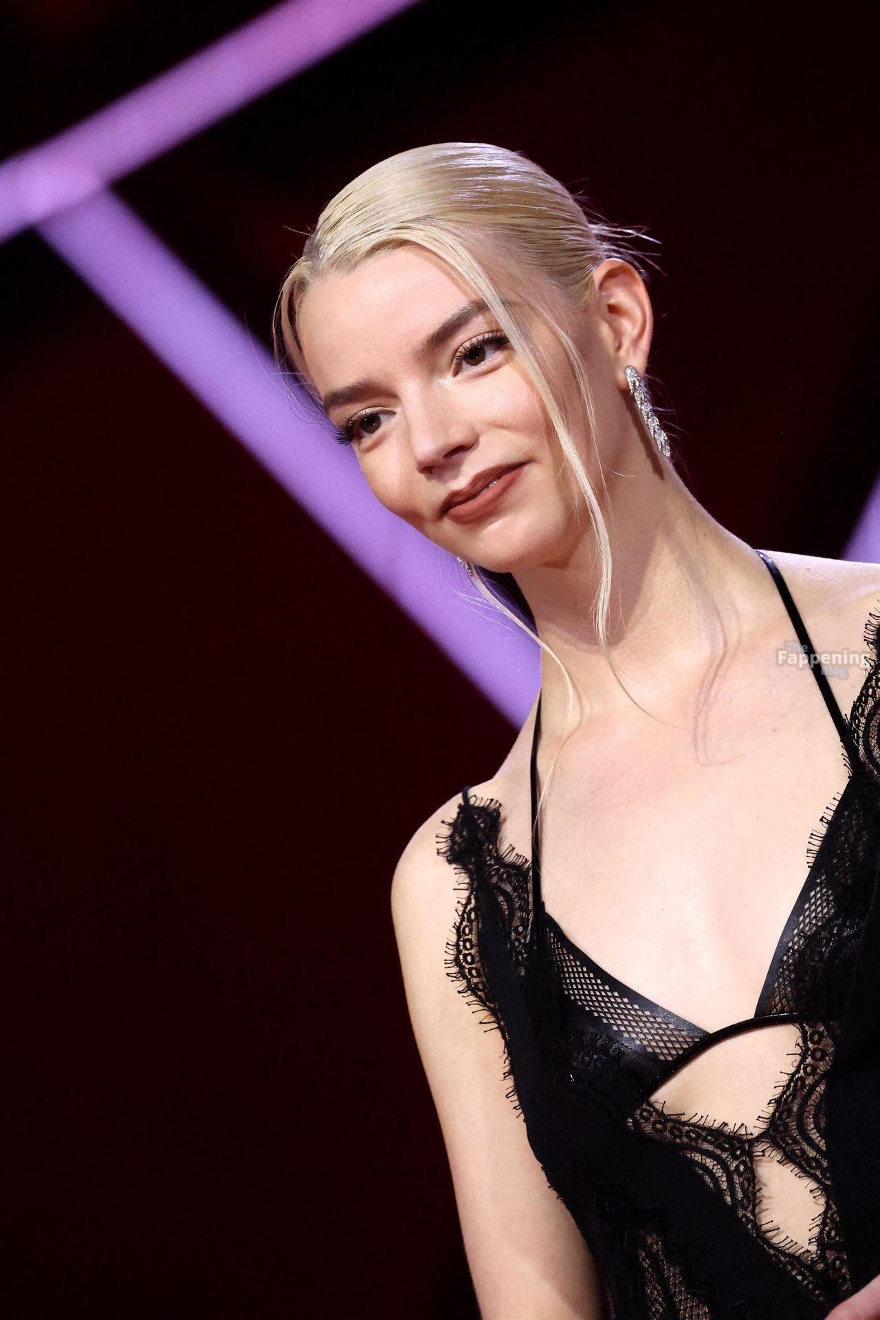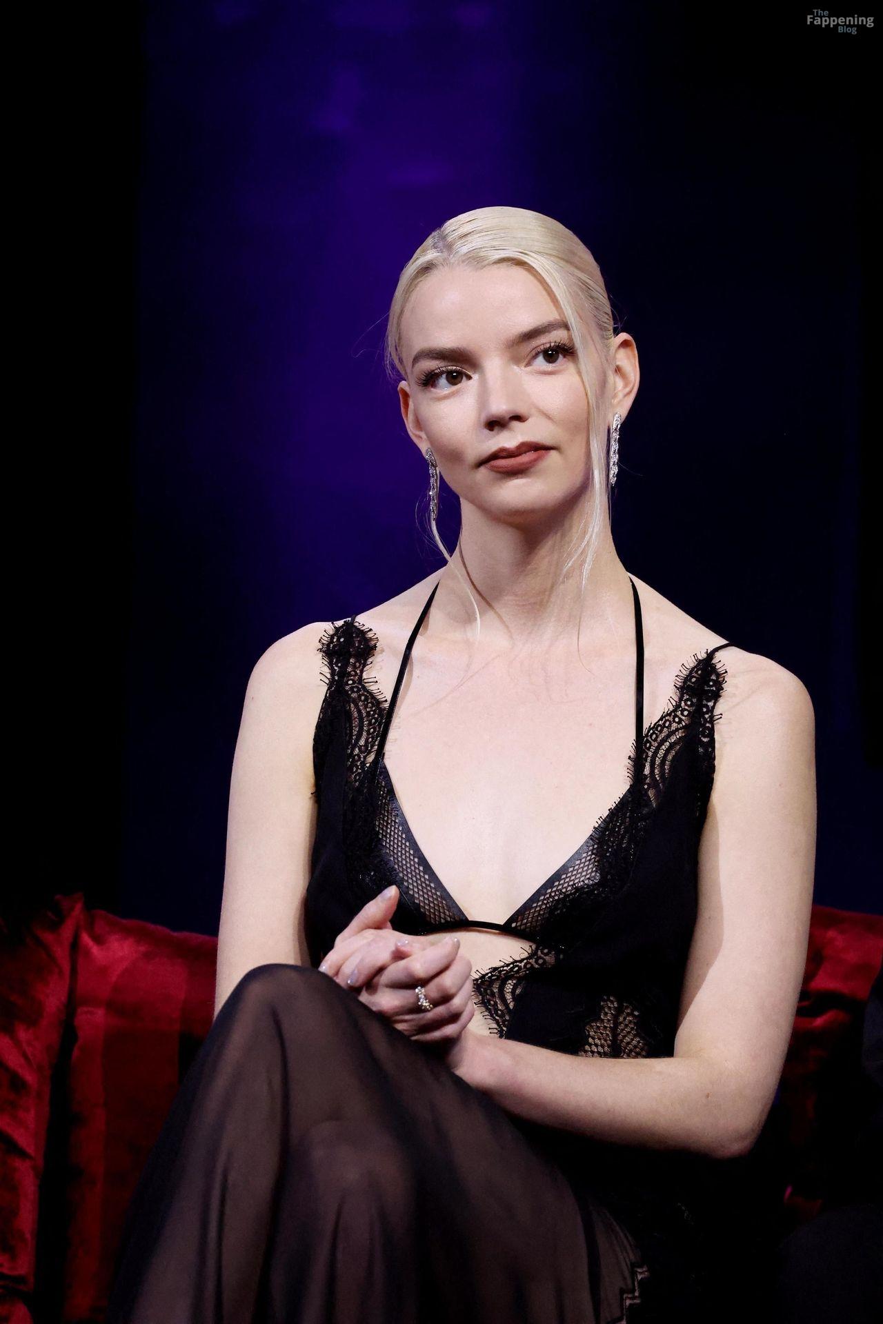 A atriz americana Anya Taylor-Joy posa com um vestido de renda transparente mostrando suas pernas no tapete vermelho ao chegar para a cerimônia de encerramento do 22º Festival de Cinema de Marrakesh (FIFM) em Marrakesh.