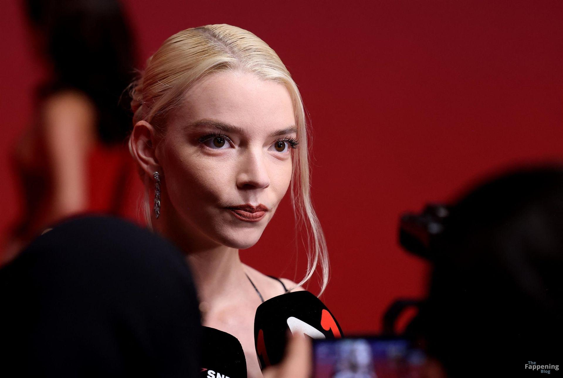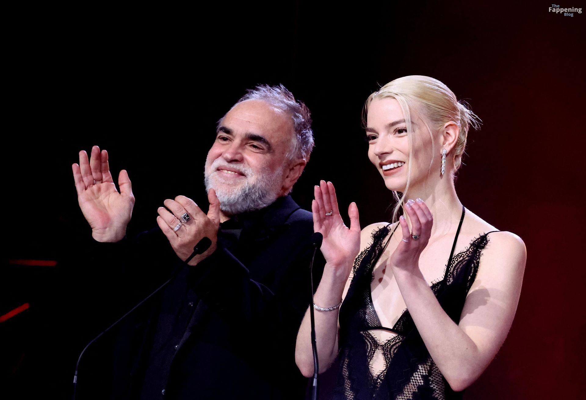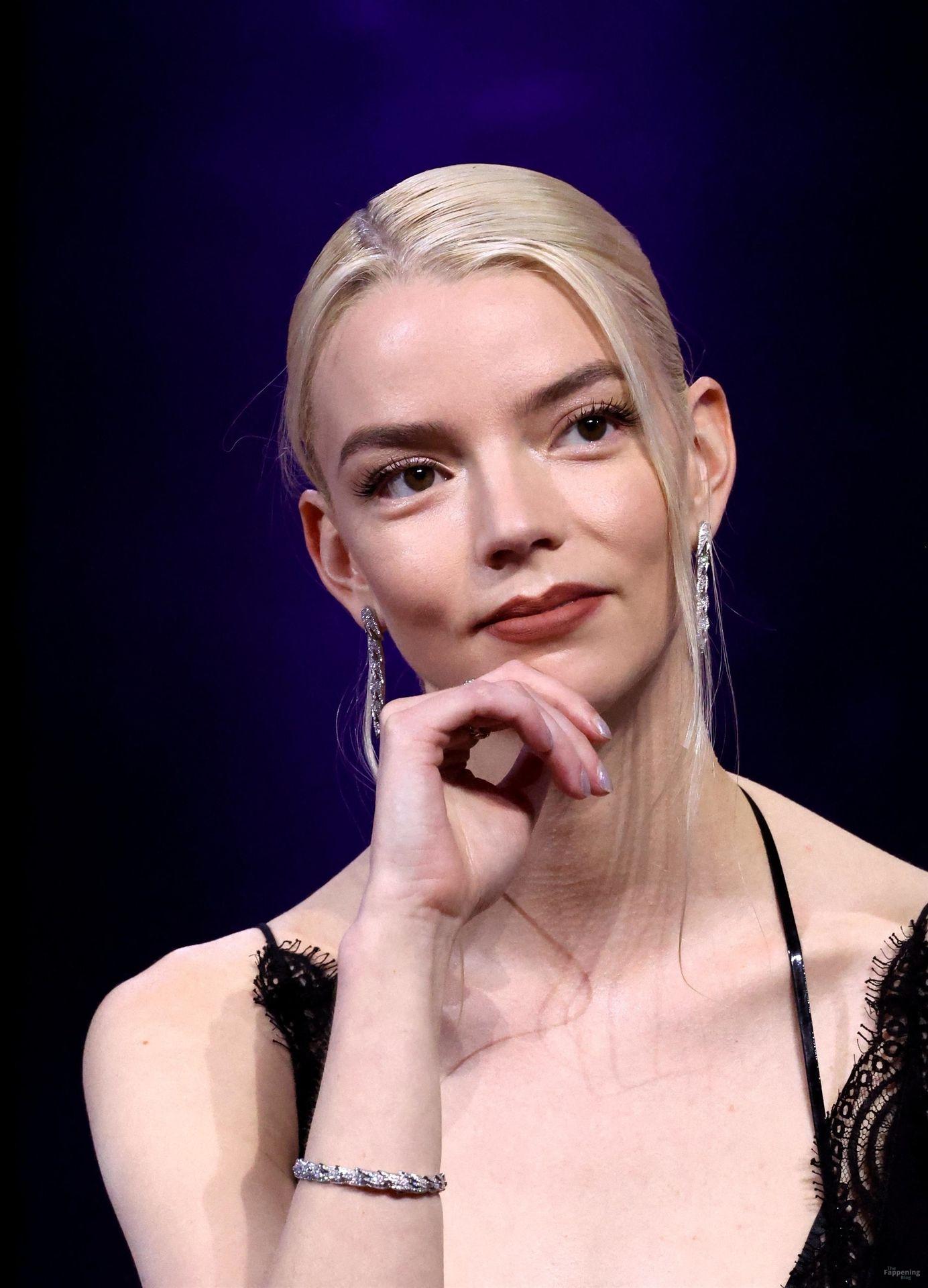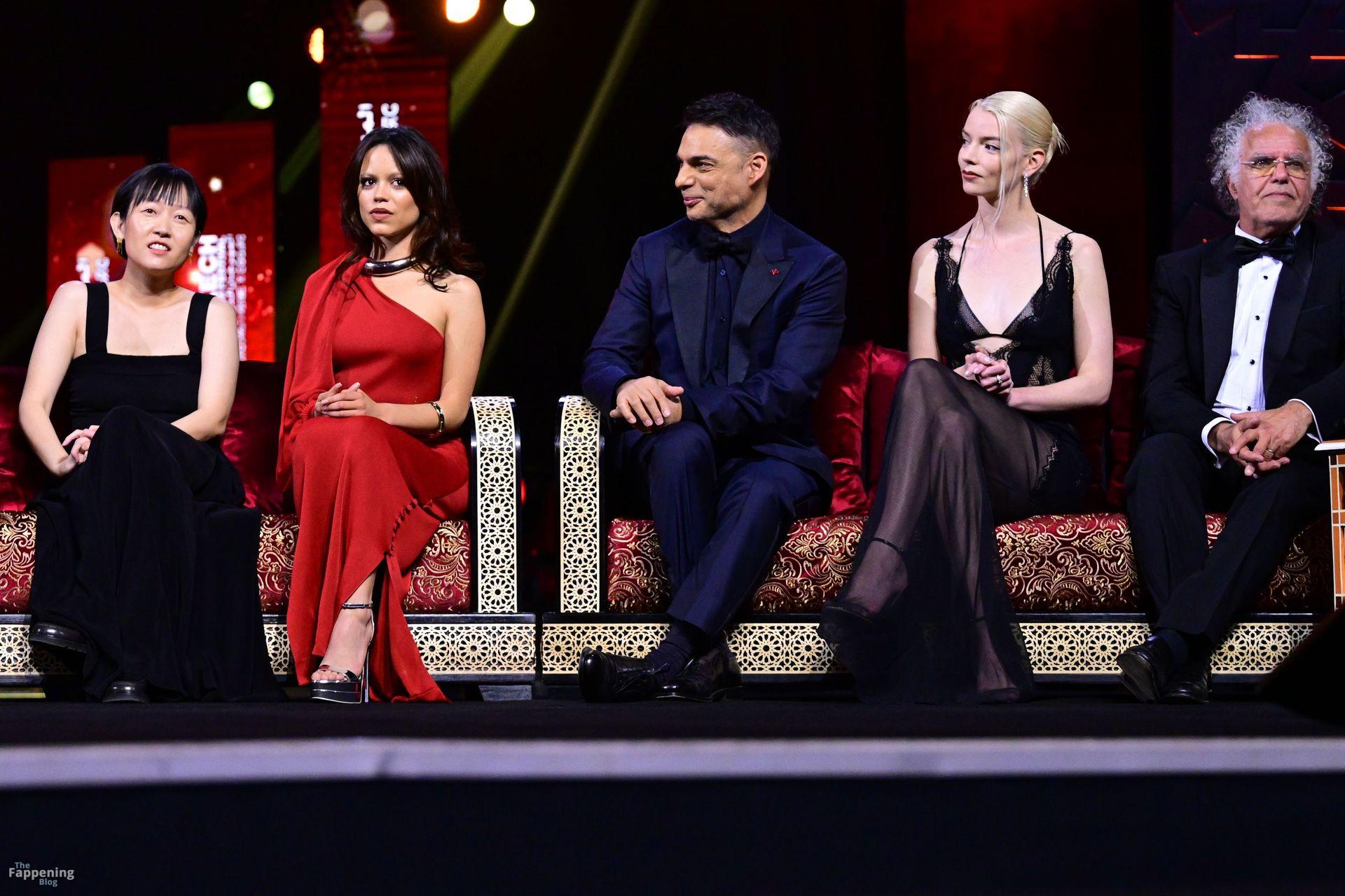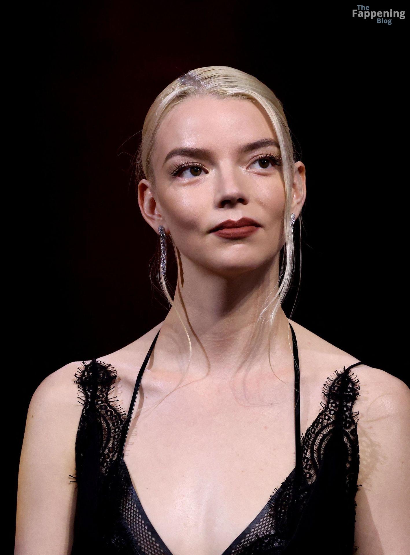 A atriz americana Anya Taylor-Joy posa com um vestido de renda transparente mostrando suas pernas no tapete vermelho ao chegar para a cerimônia de encerramento do 22º Festival de Cinema de Marrakesh (FIFM) em Marrakesh.