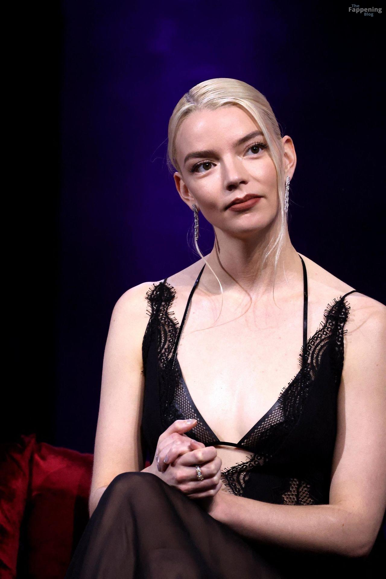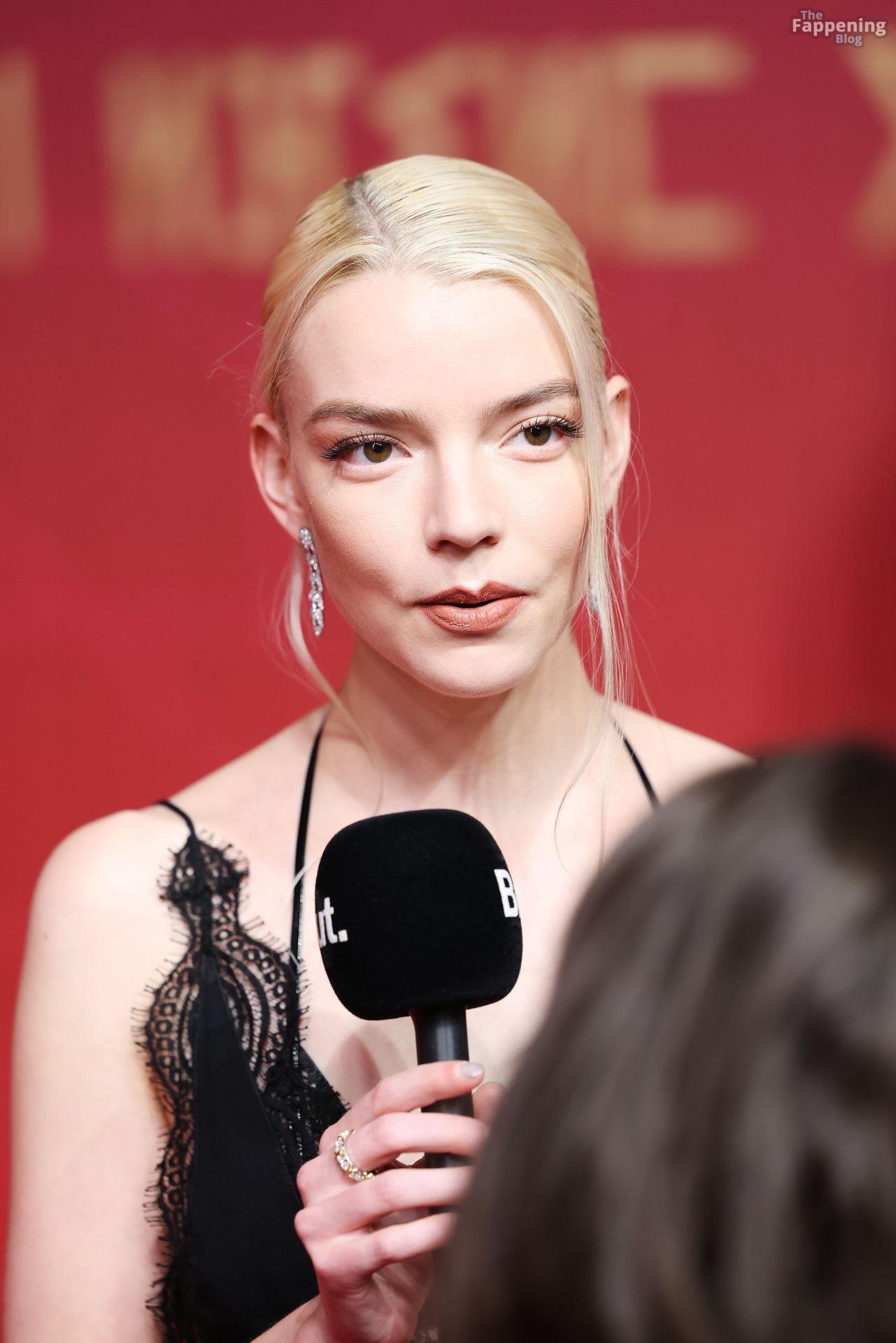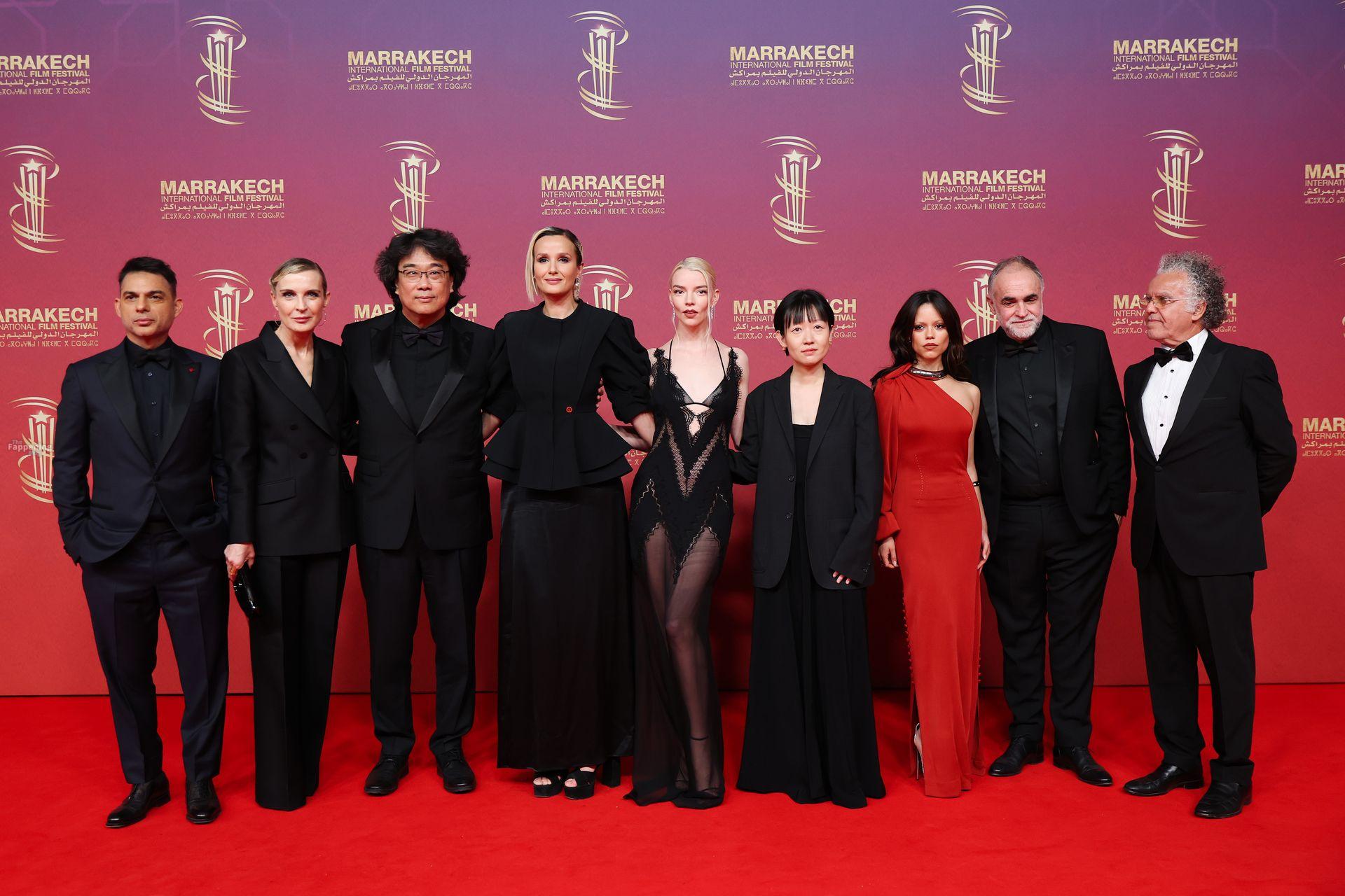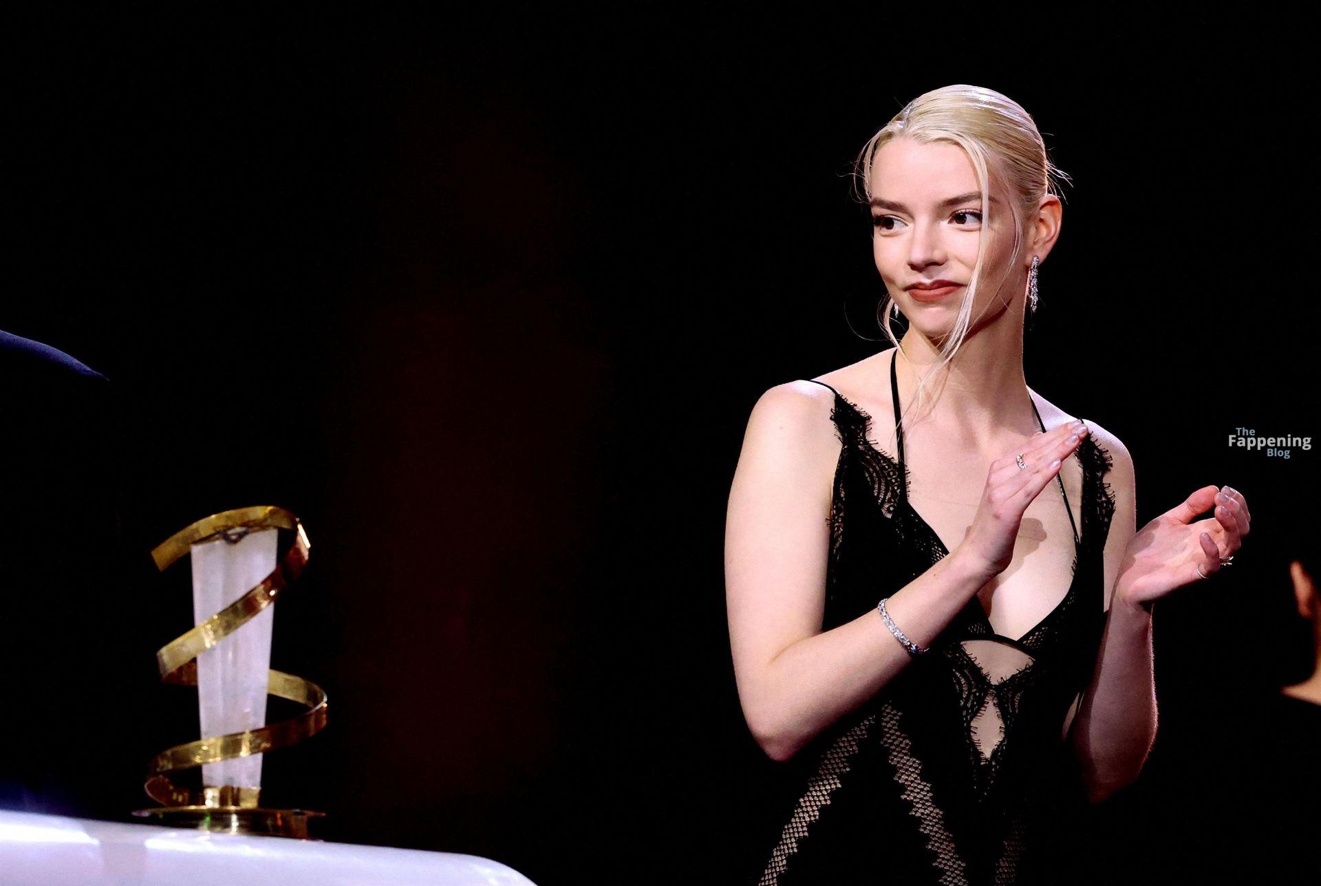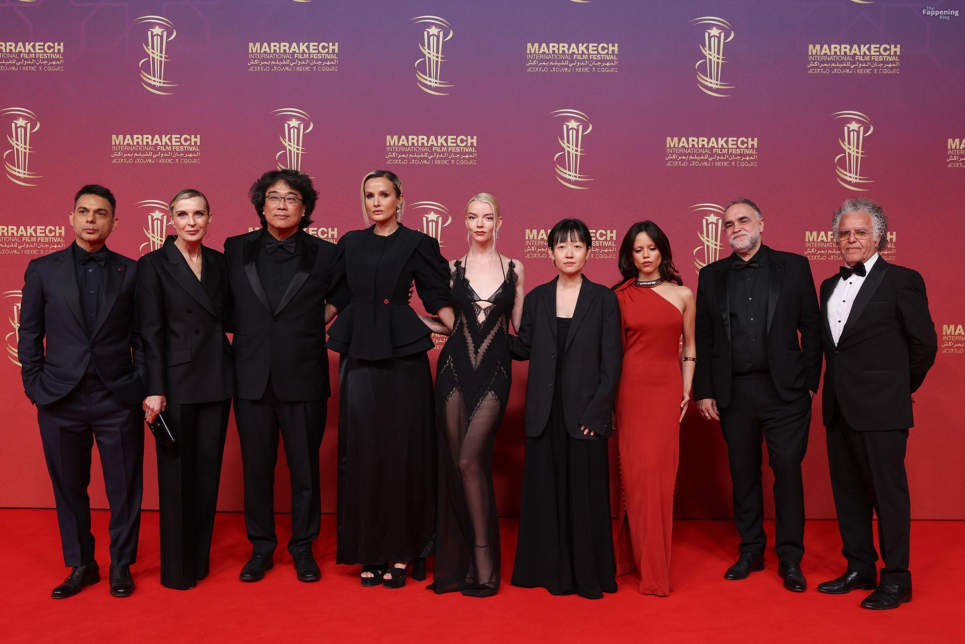 A atriz americana Anya Taylor-Joy posa com um vestido de renda transparente mostrando suas pernas no tapete vermelho ao chegar para a cerimônia de encerramento do 22º Festival de Cinema de Marrakesh (FIFM) em Marrakesh.