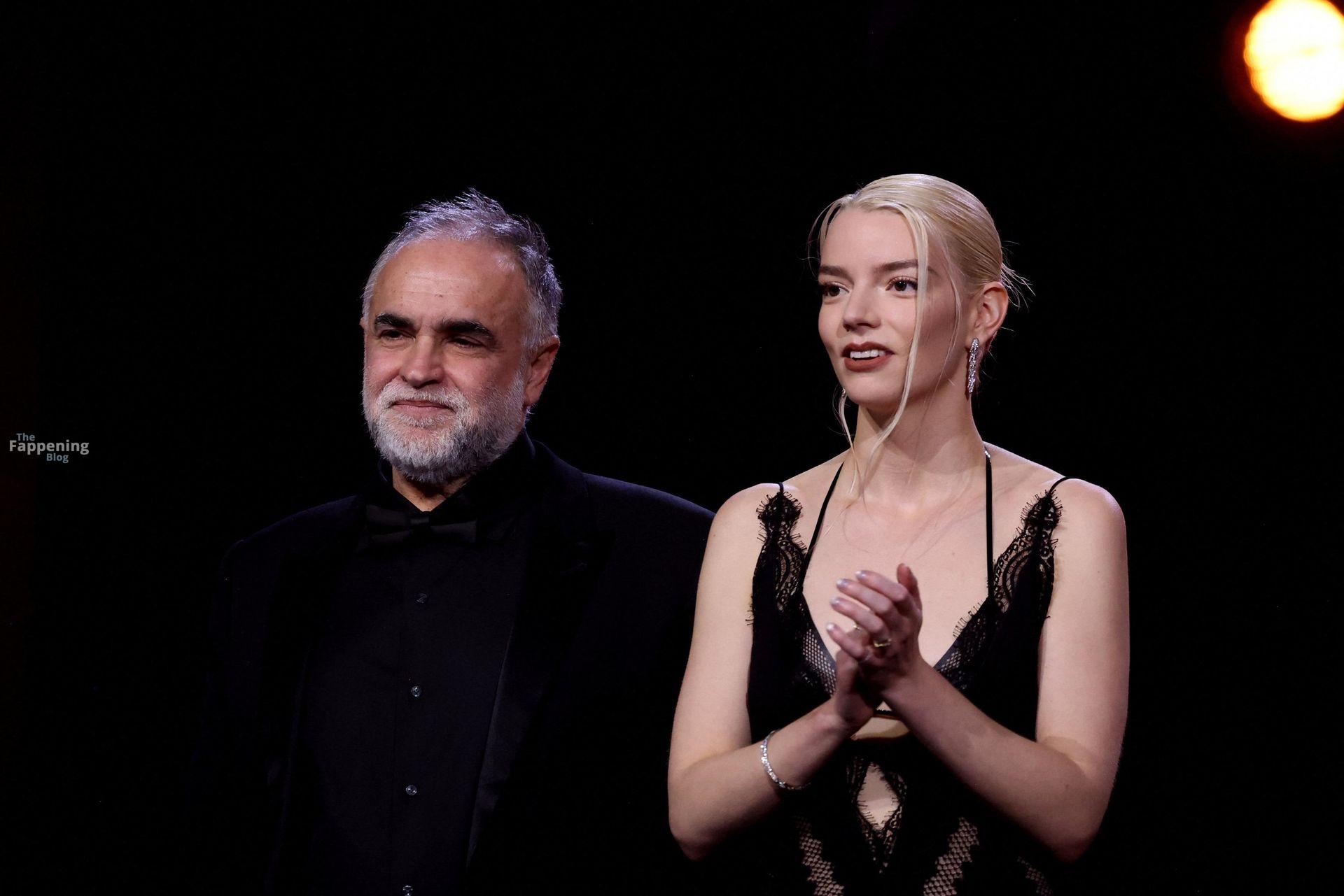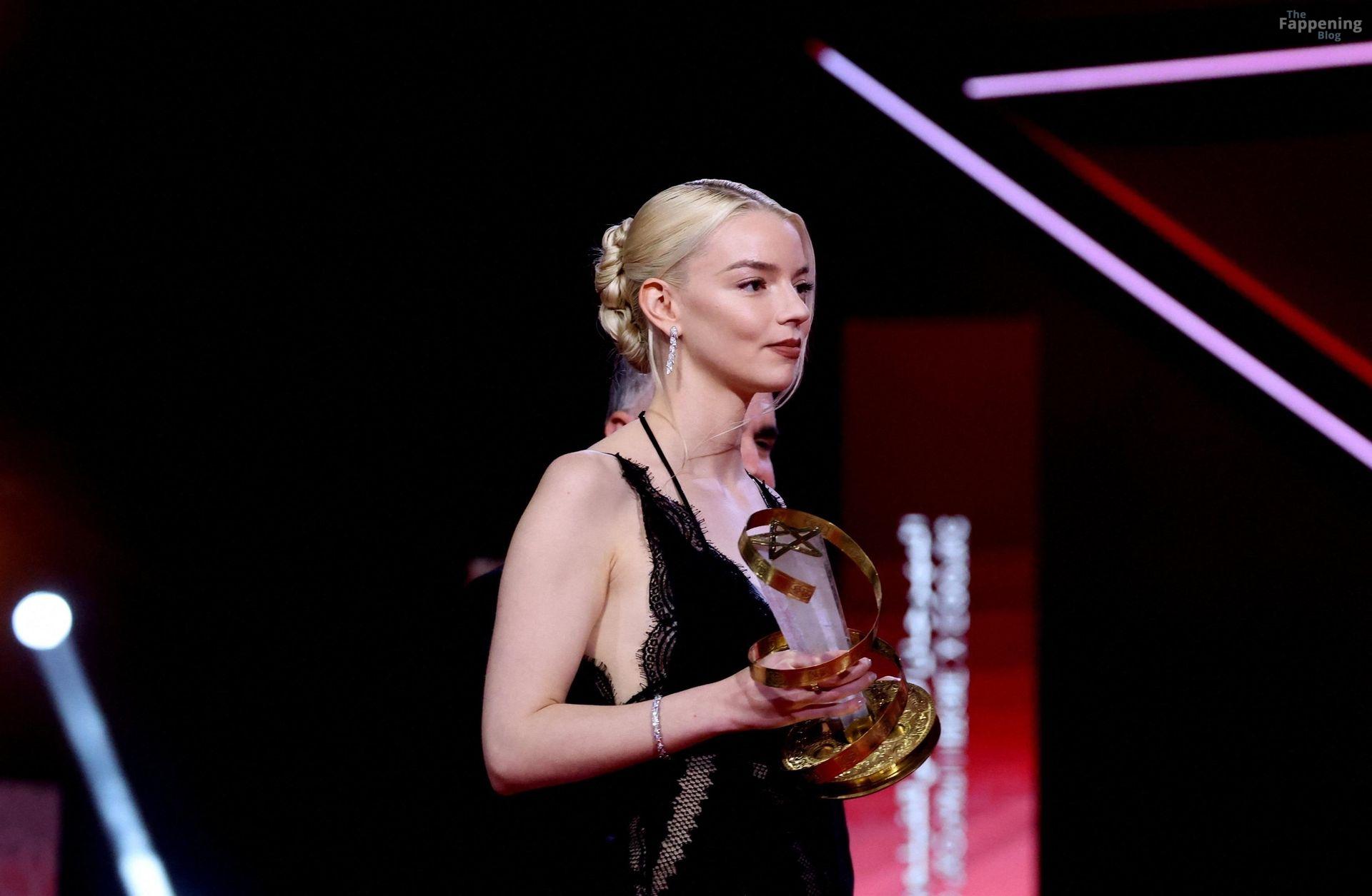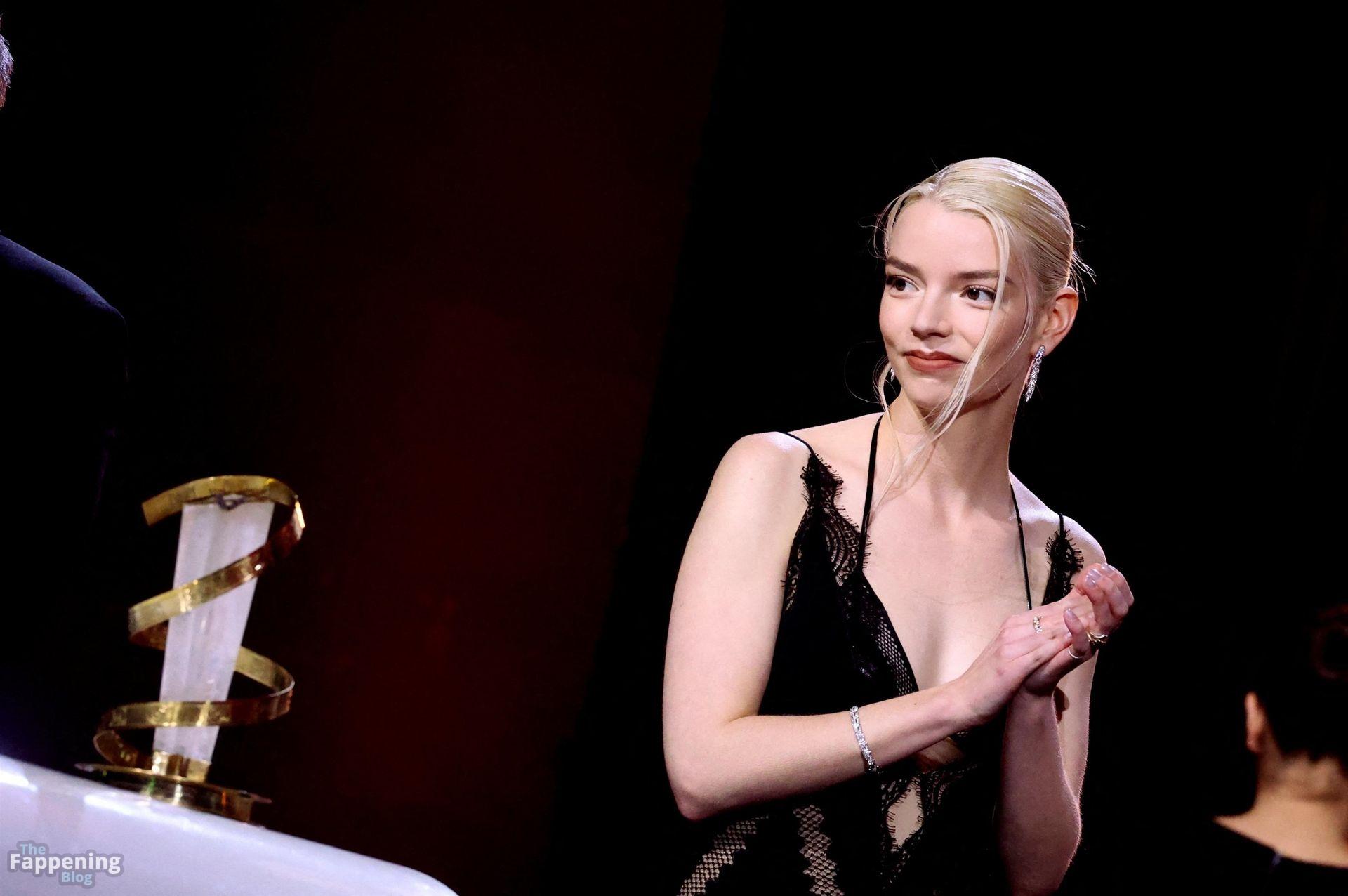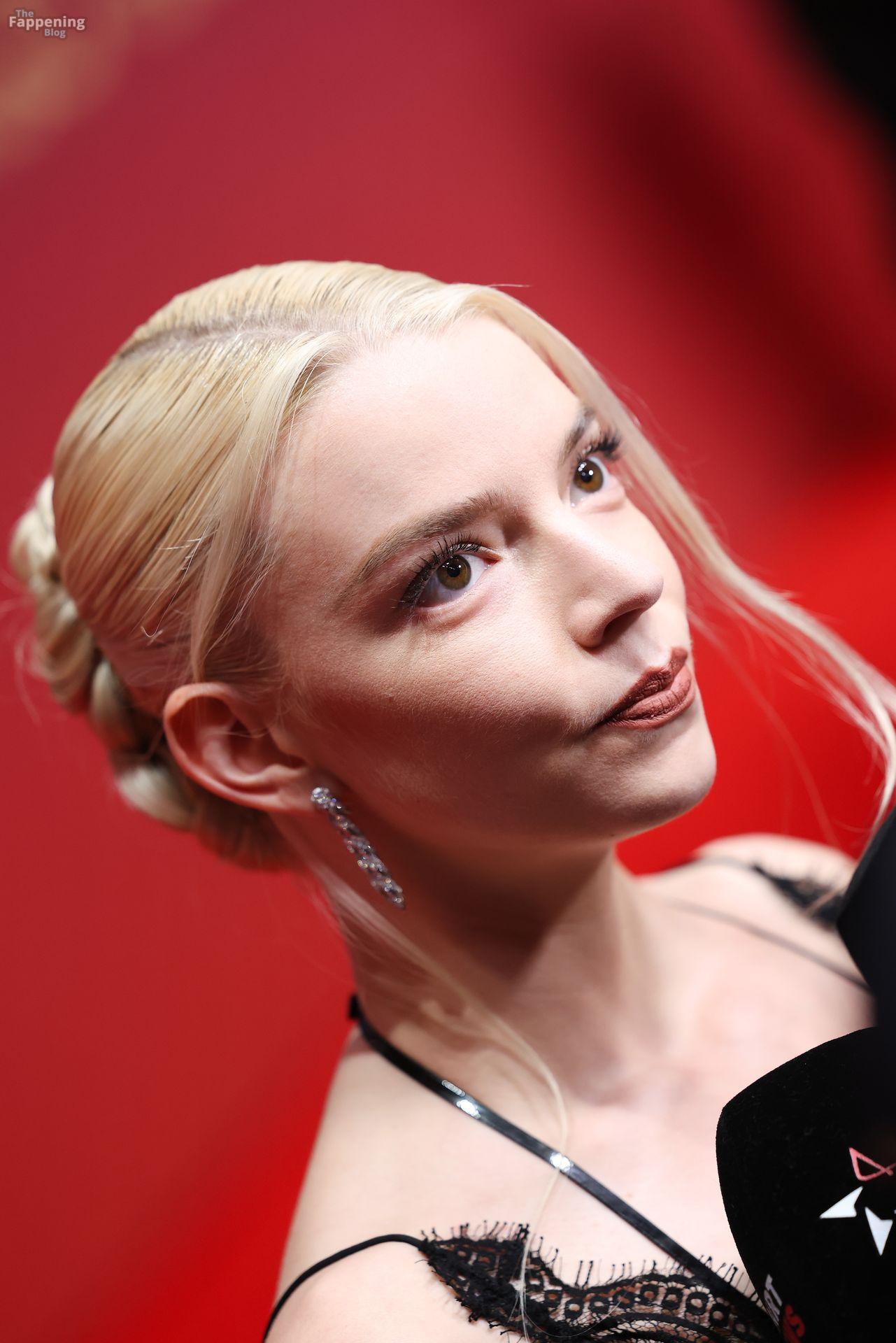 A atriz americana Anya Taylor-Joy posa com um vestido de renda transparente mostrando suas pernas no tapete vermelho ao chegar para a cerimônia de encerramento do 22º Festival de Cinema de Marrakesh (FIFM) em Marrakesh.