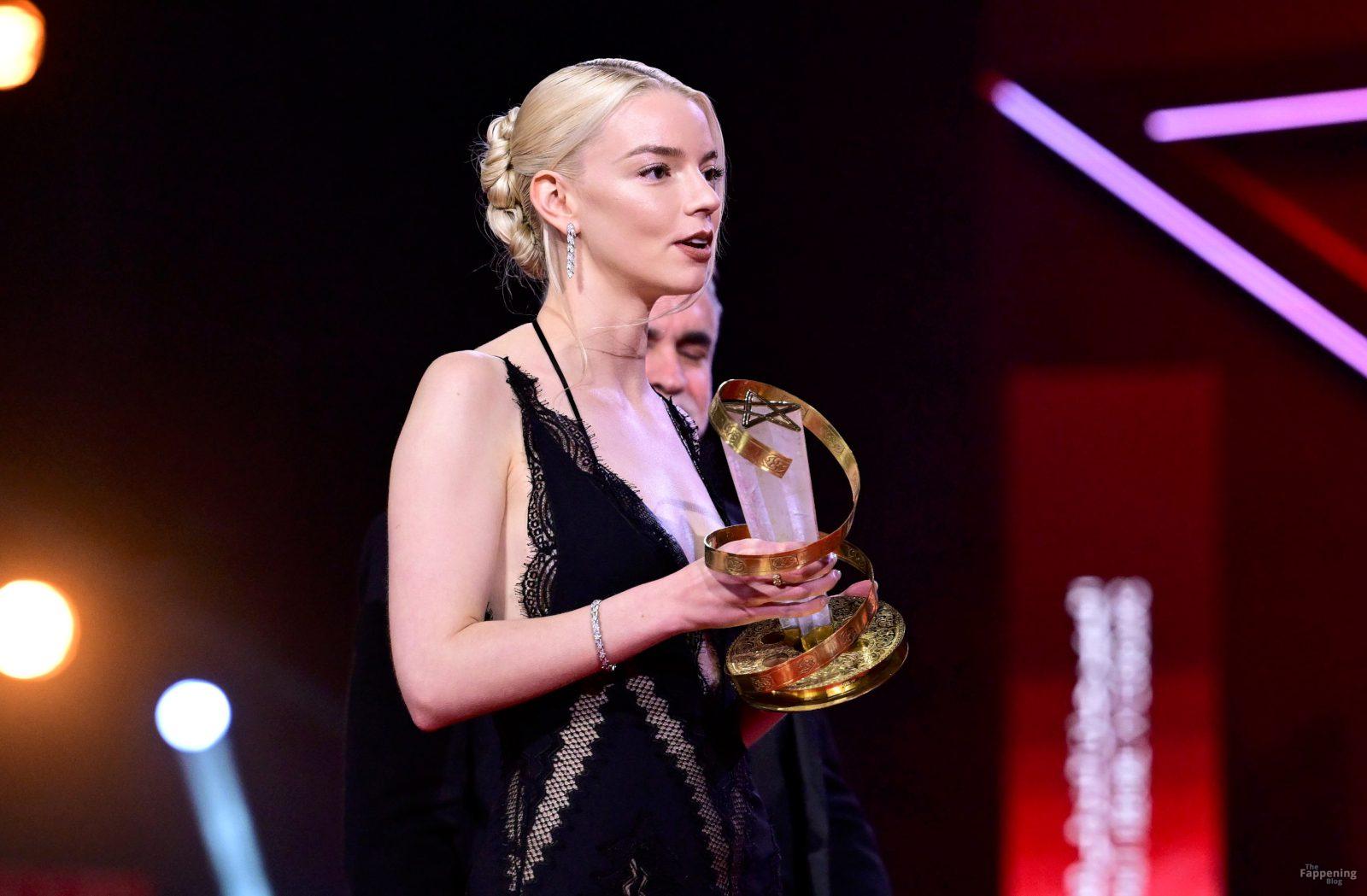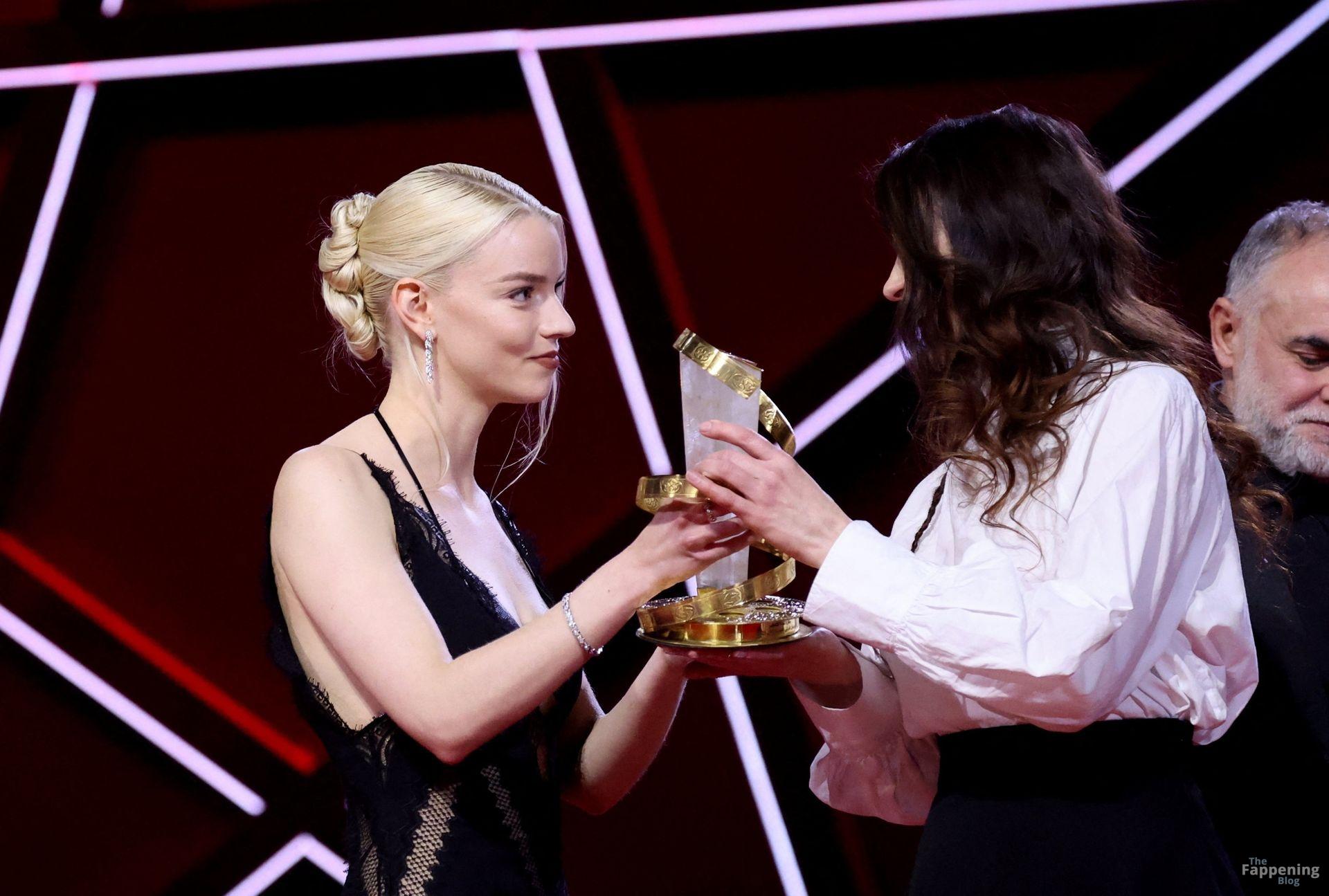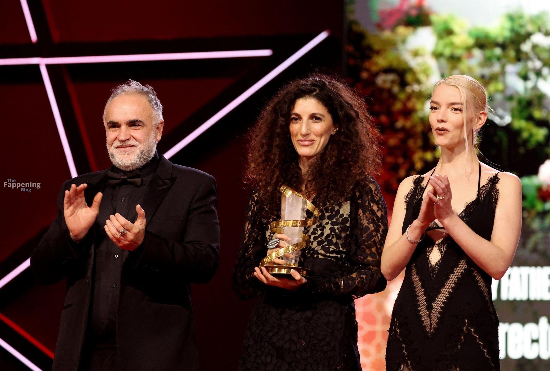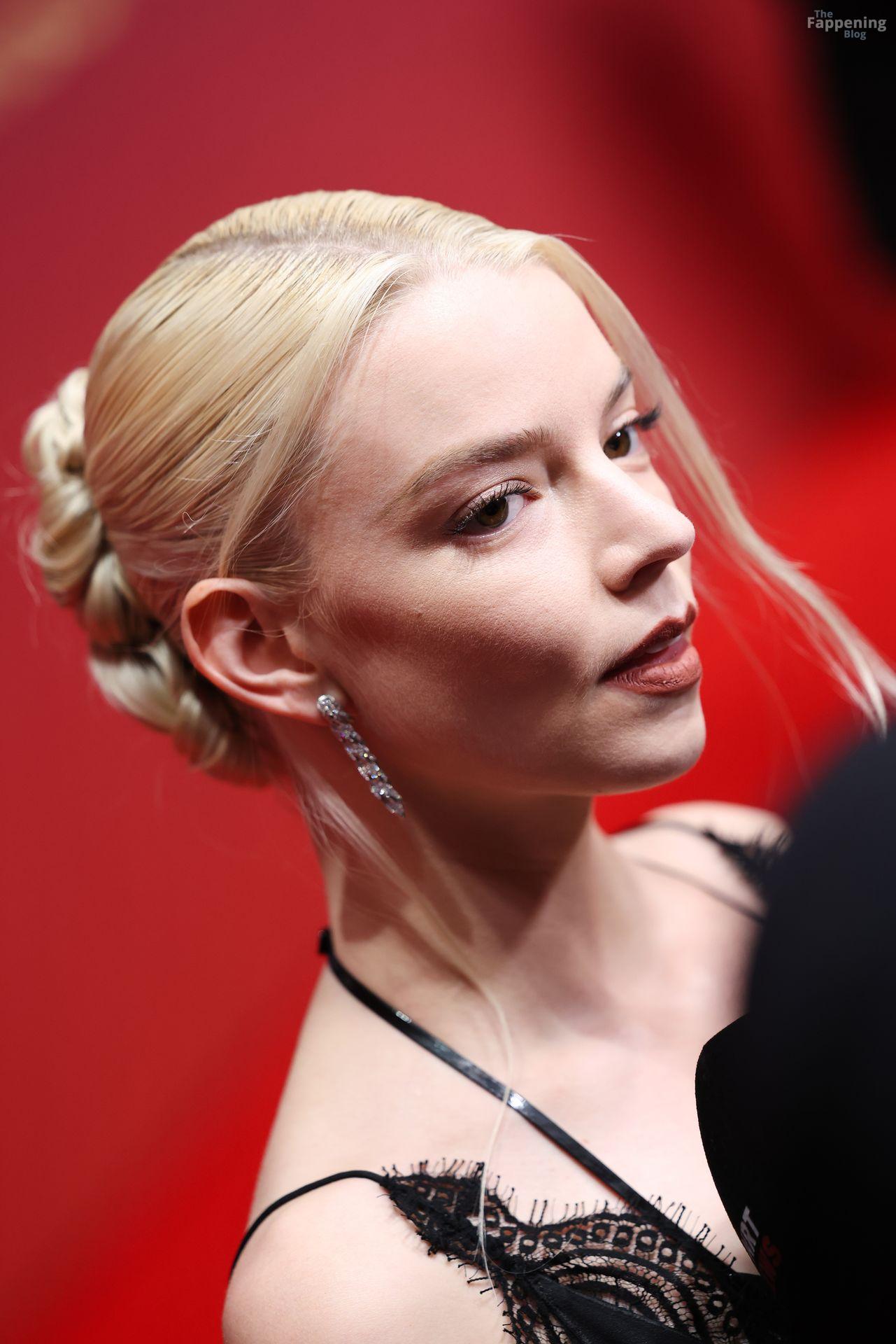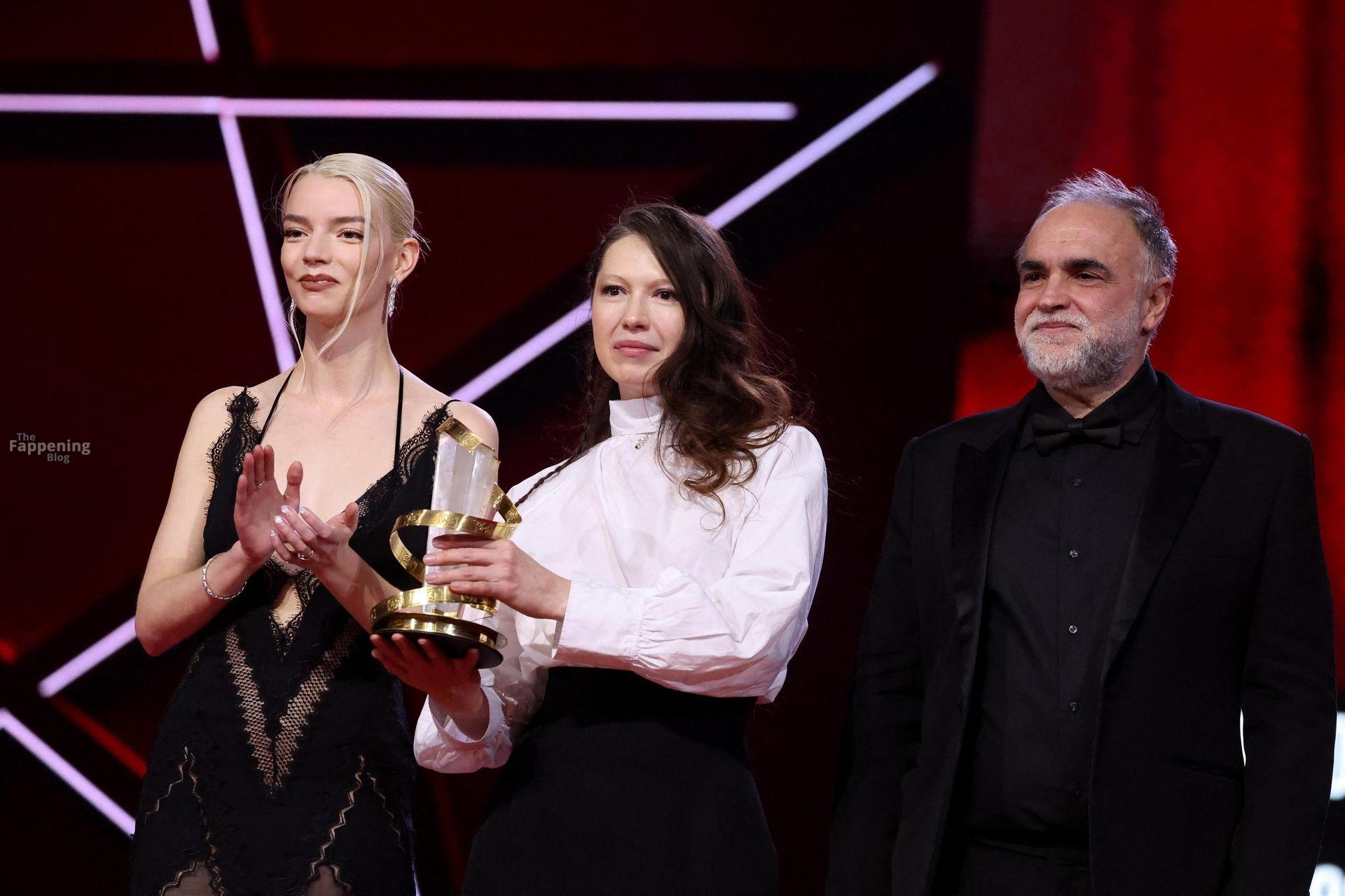 A atriz americana Anya Taylor-Joy posa com um vestido de renda transparente mostrando suas pernas no tapete vermelho ao chegar para a cerimônia de encerramento do 22º Festival de Cinema de Marrakesh (FIFM) em Marrakesh.