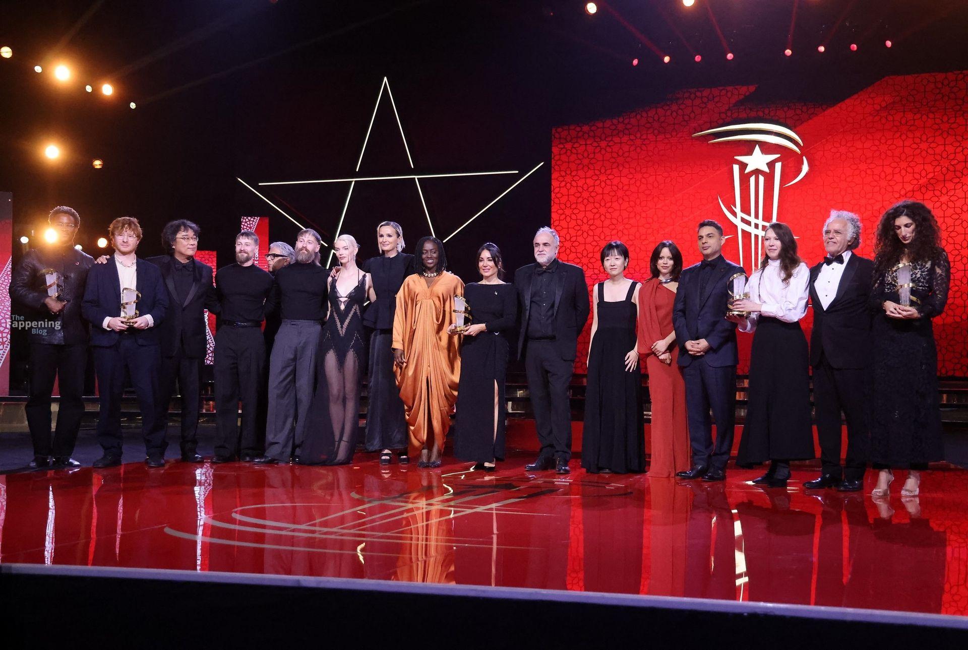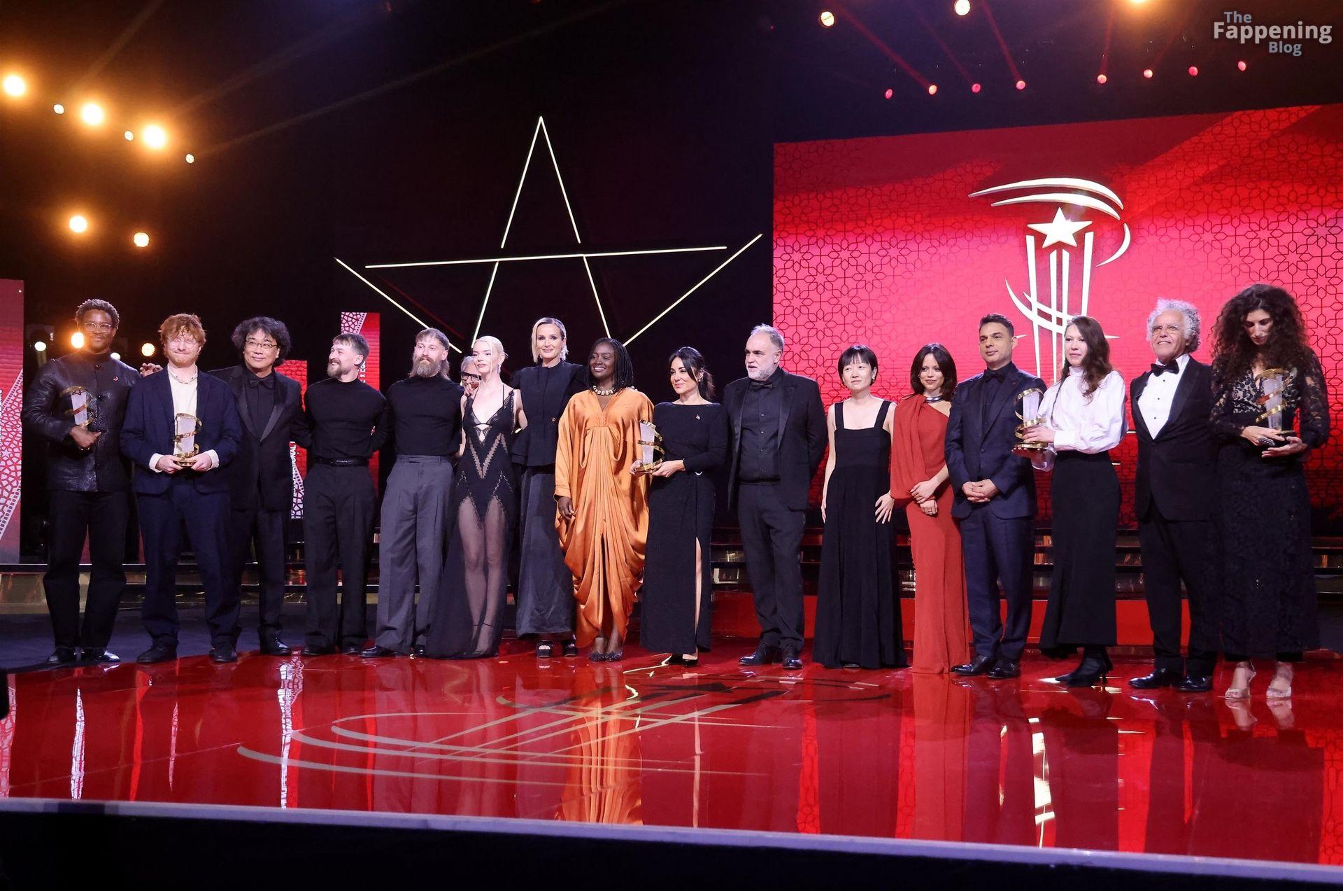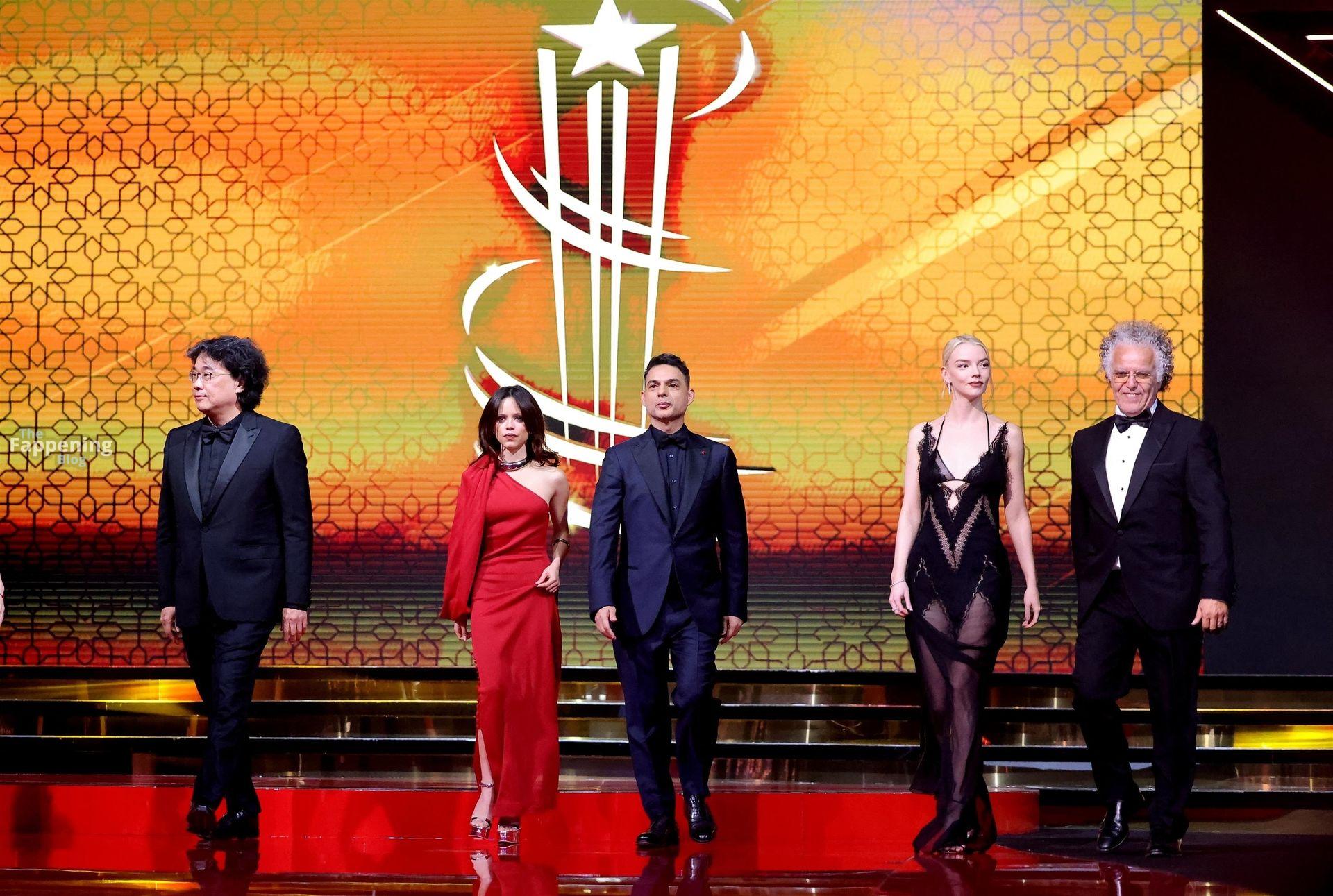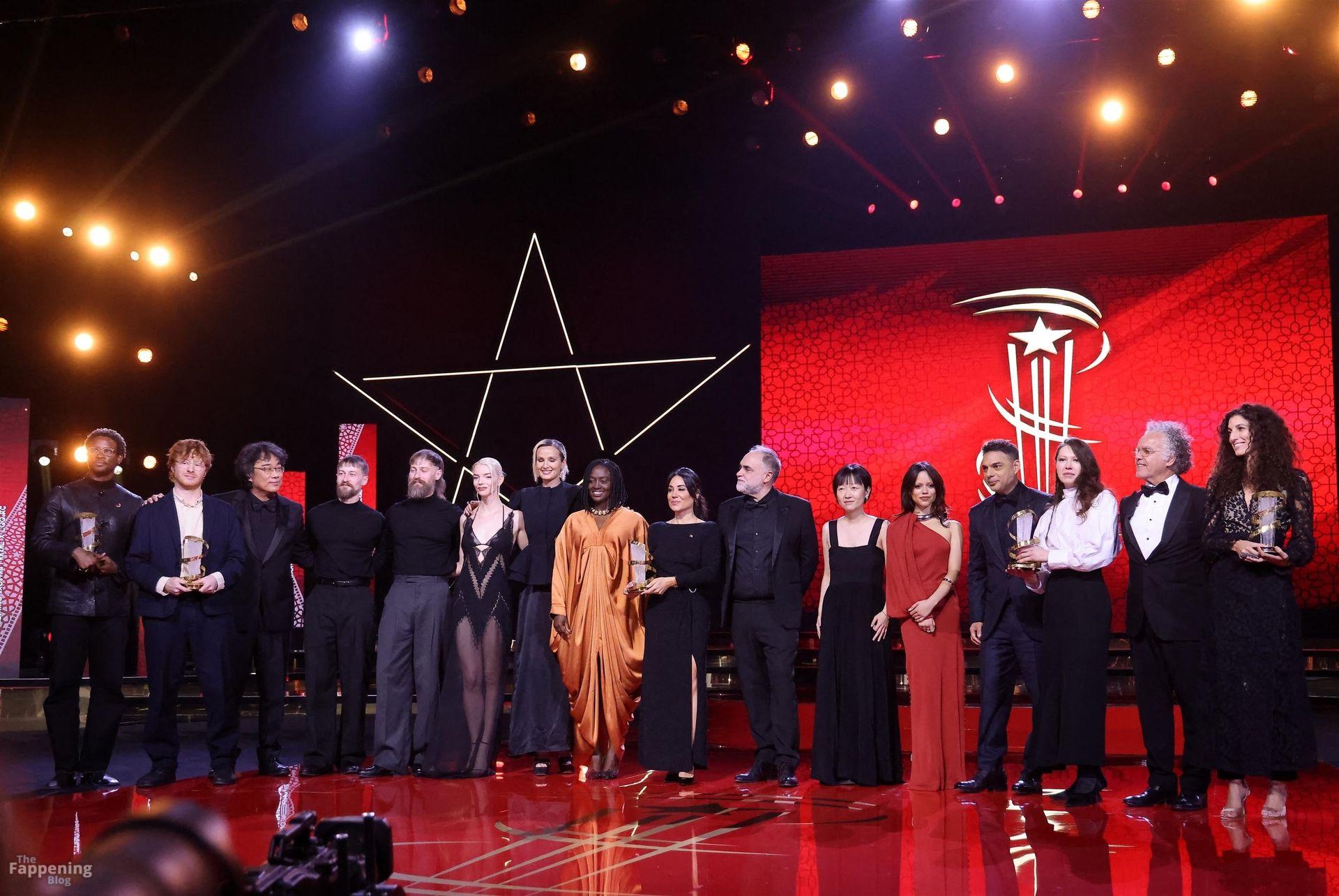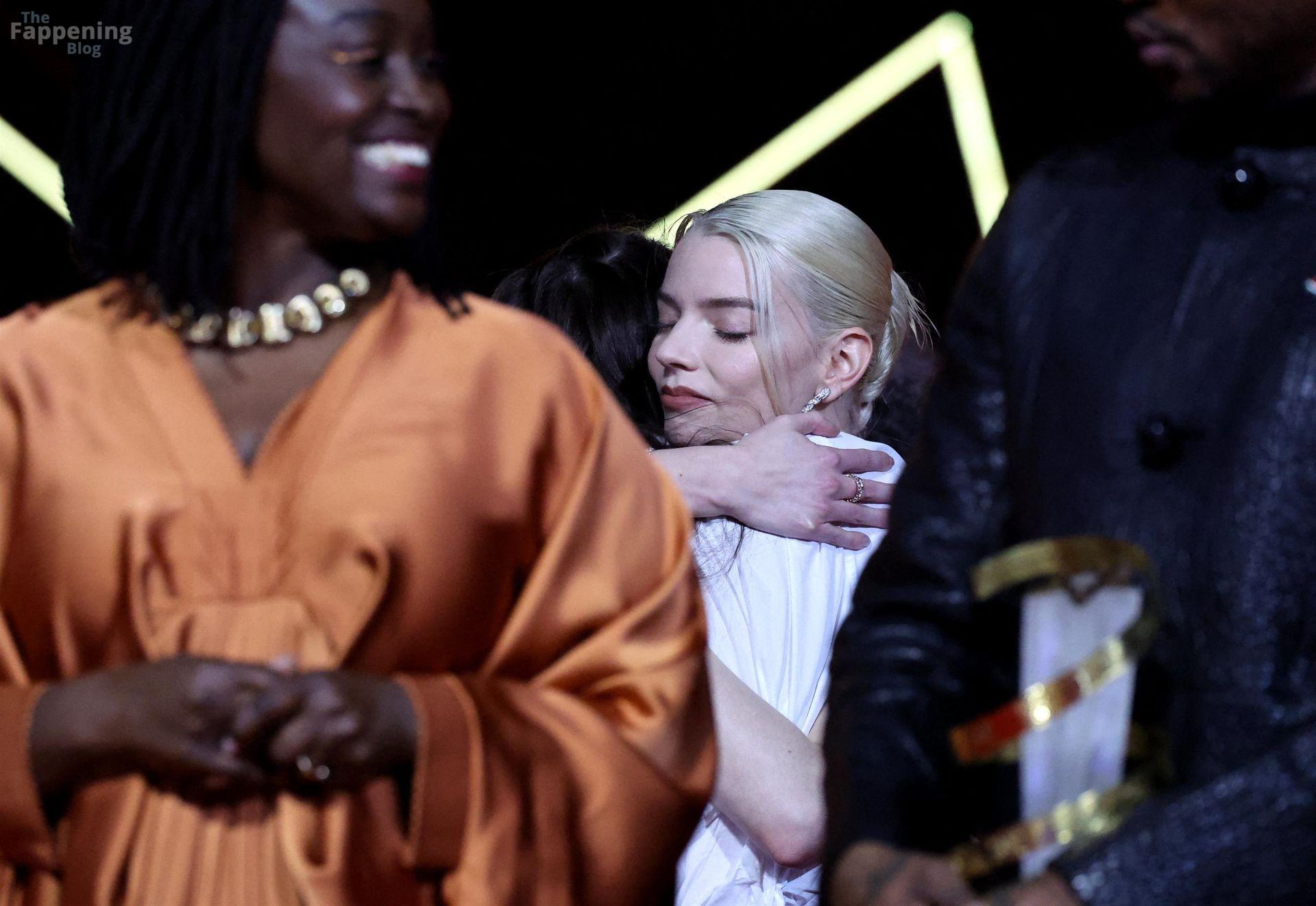A atriz americana Anya Taylor-Joy posa com um vestido de renda transparente mostrando suas pernas no tapete vermelho ao chegar para a cerimônia de encerramento do 22º Festival de Cinema de Marrakesh (FIFM) em Marrakesh.