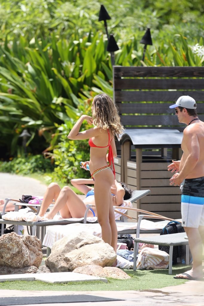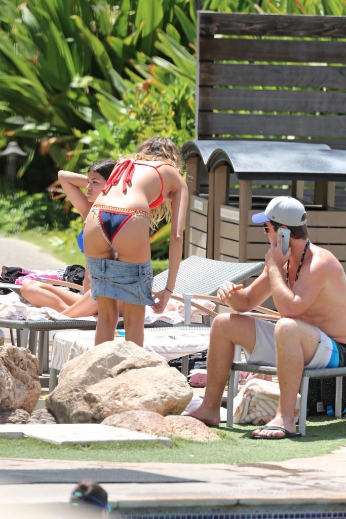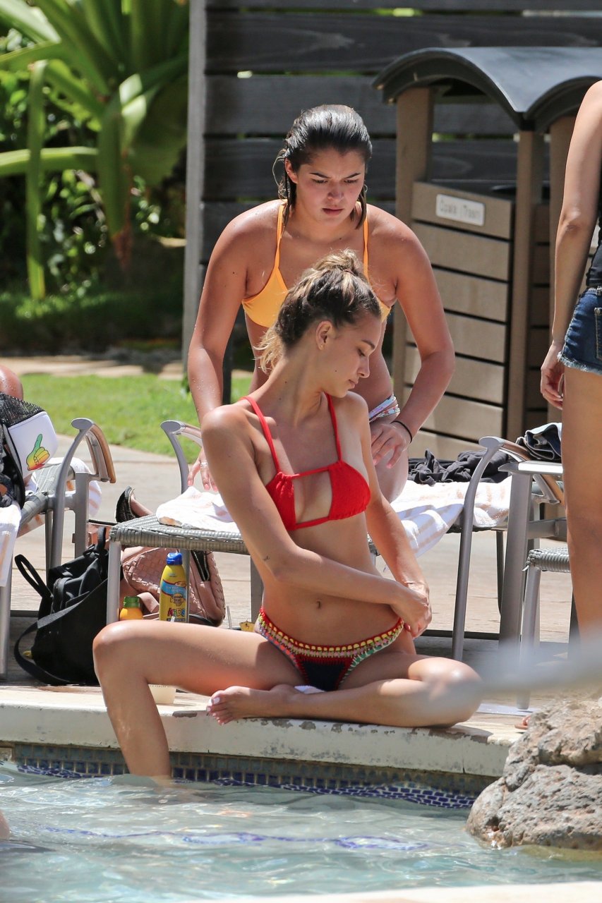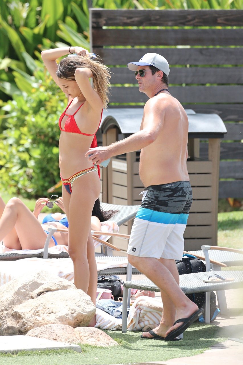 A modelo grávida April Love Geary mal mostra a barriga de bebê enquanto aproveita a piscina com Robin Thicke na North Shore do Havaí, 18/08/2017.