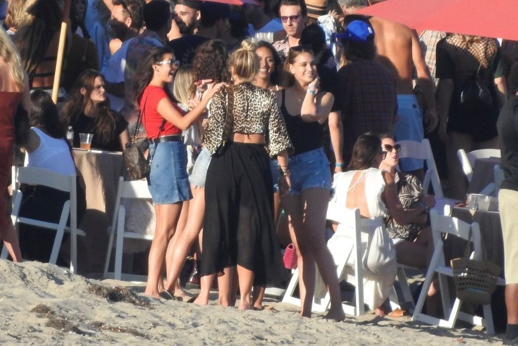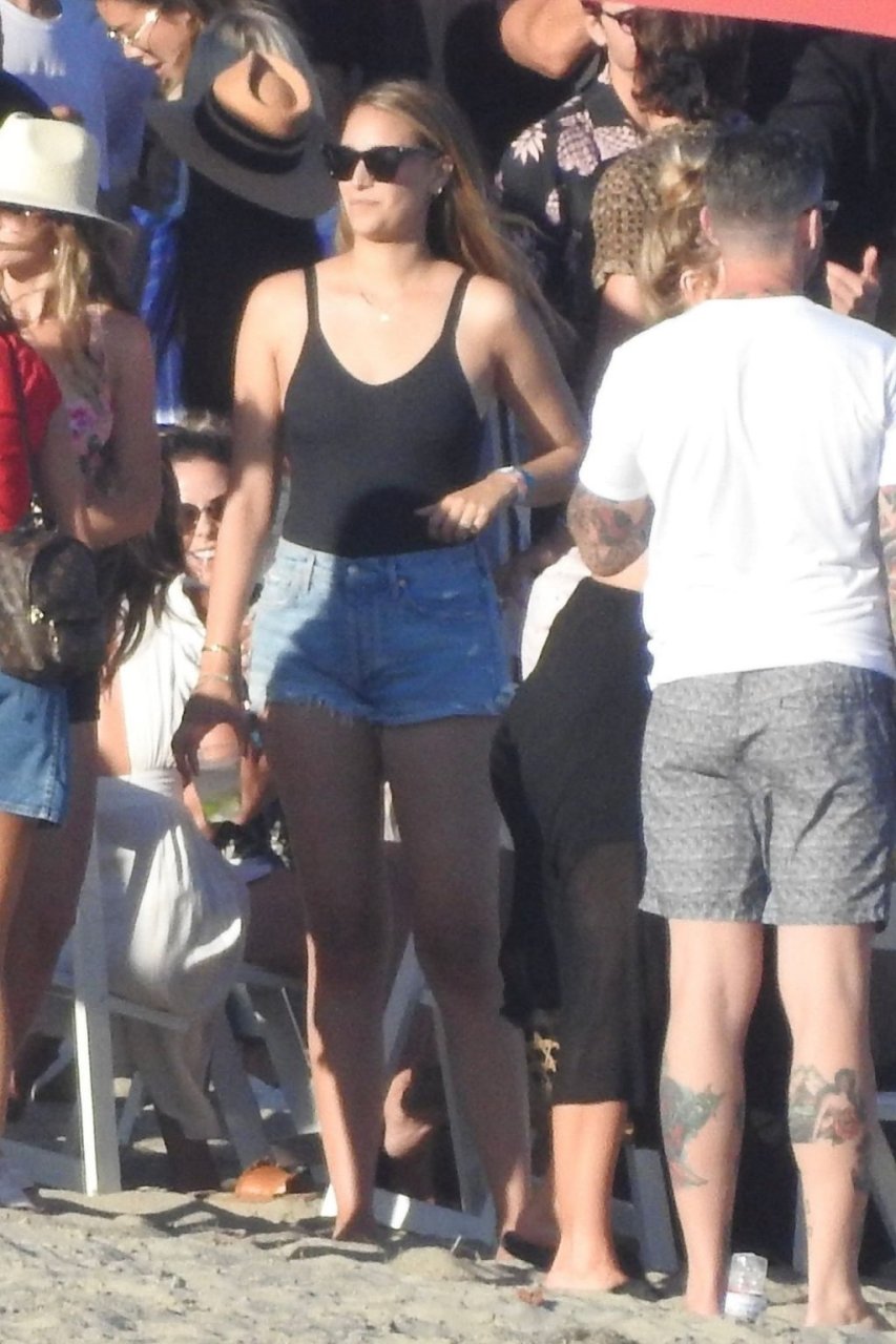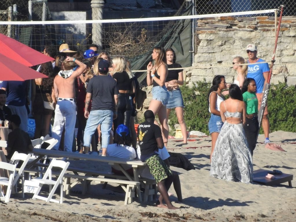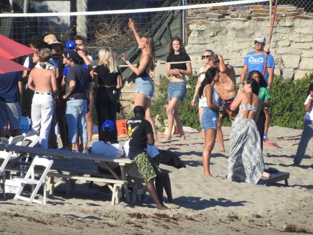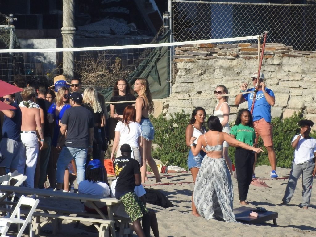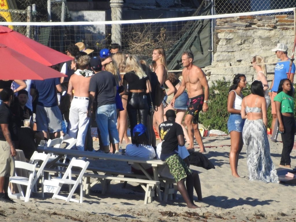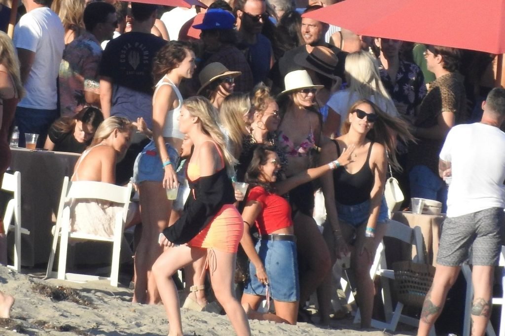 April Love Geary participa de uma festa na praia em Malibu onde Jamie Foxx e Sean Penn também são convidados, 25/08/2019. A modelo chegou com algumas amigas e foi vista aproveitando uma bebida gelada na praia.