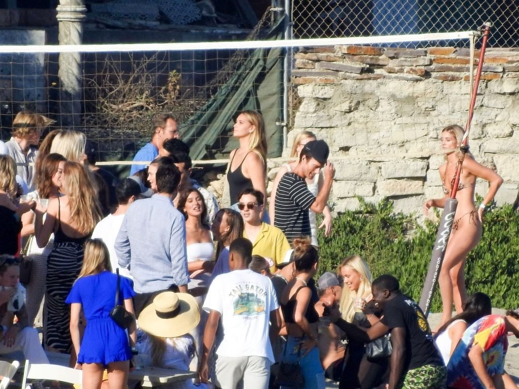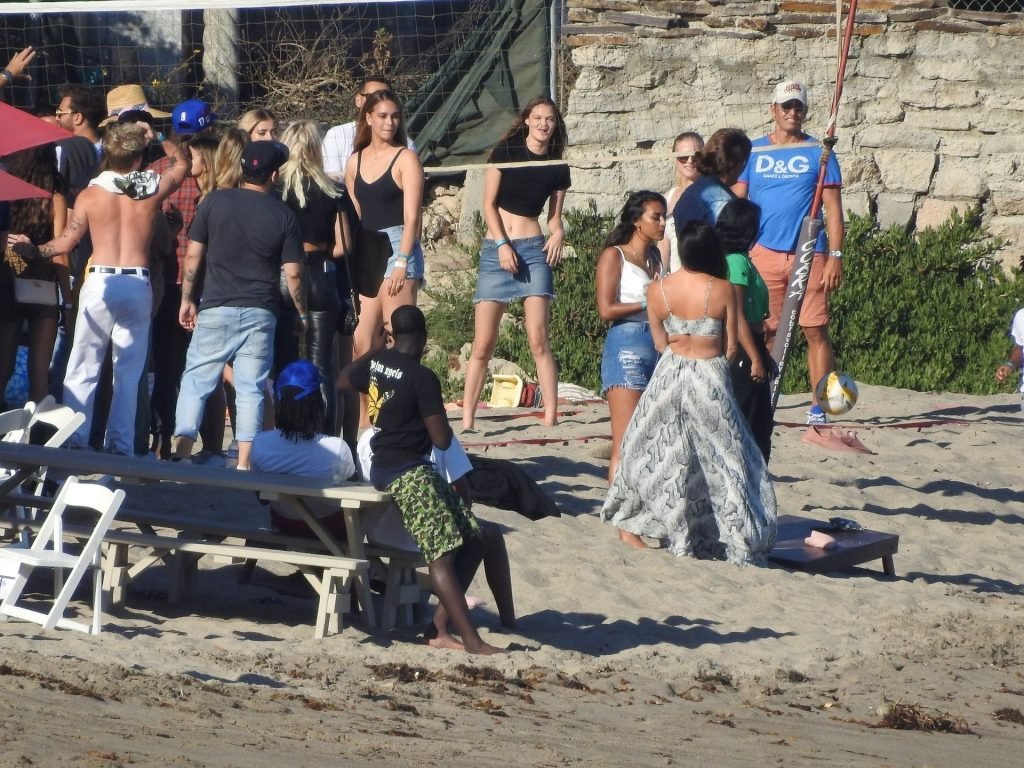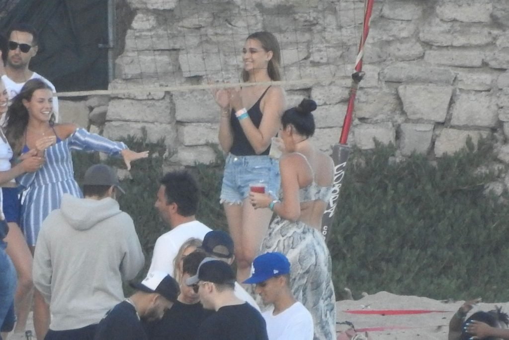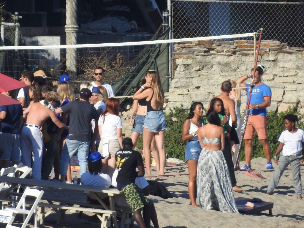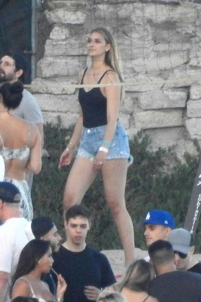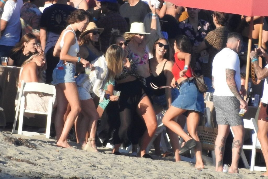April Love Geary participa de uma festa na praia em Malibu onde Jamie Foxx e Sean Penn também são convidados, 25/08/2019. A modelo chegou com algumas amigas e foi vista aproveitando uma bebida gelada na praia.