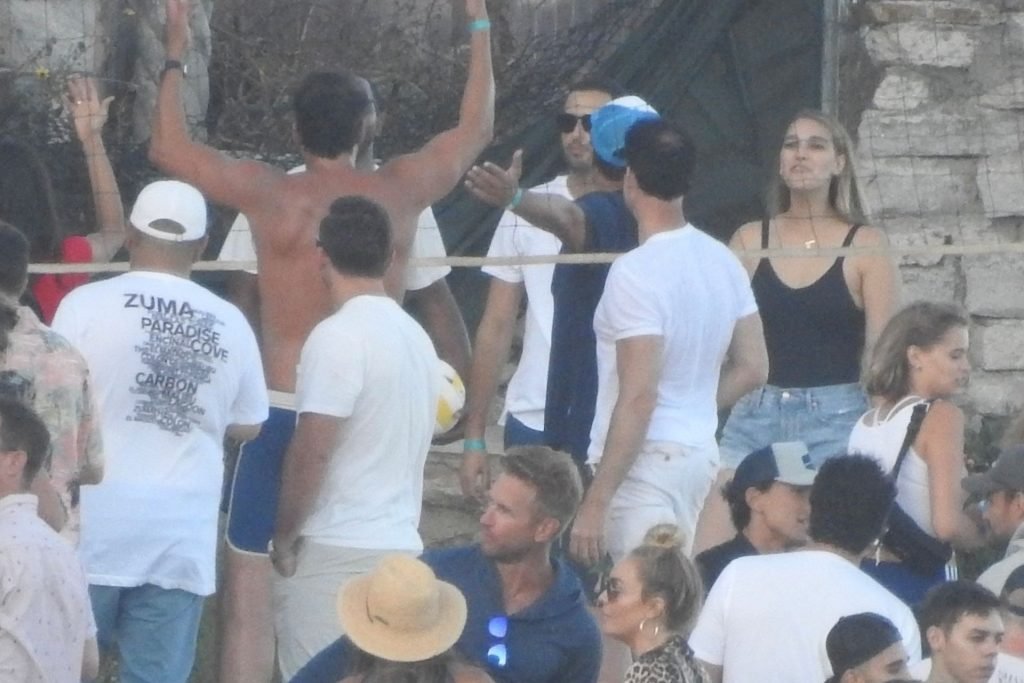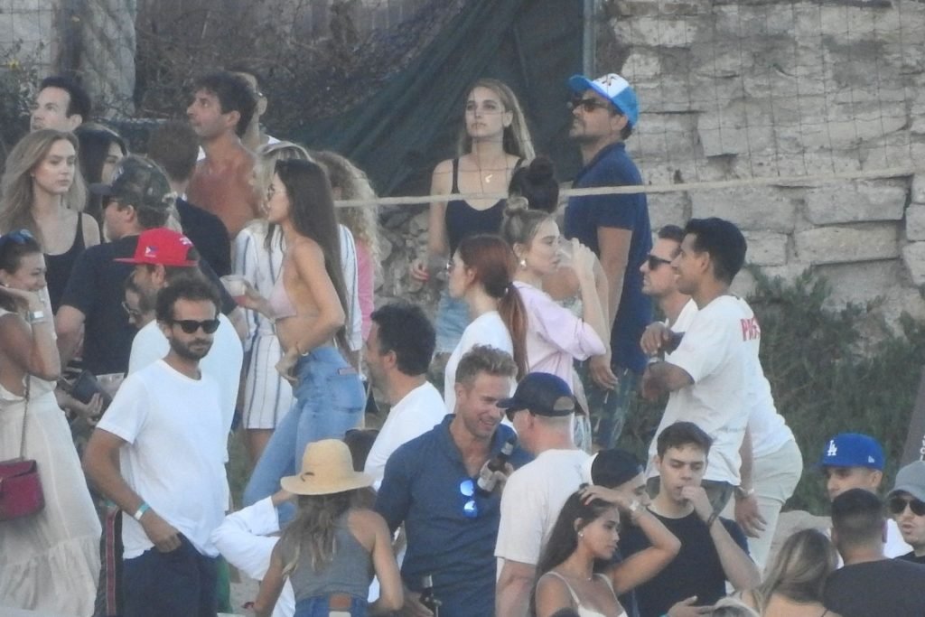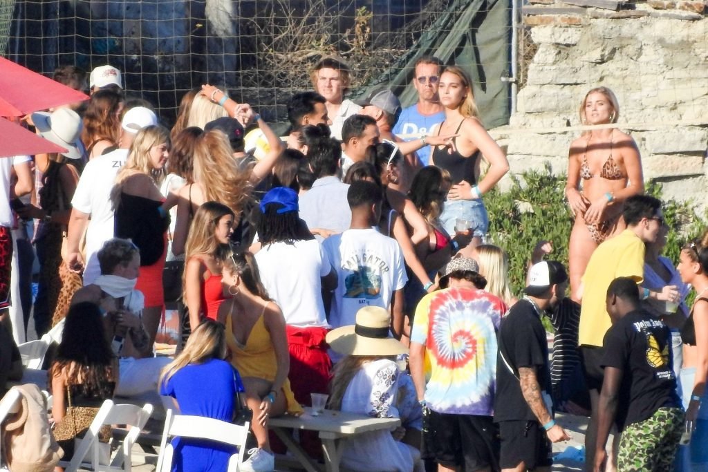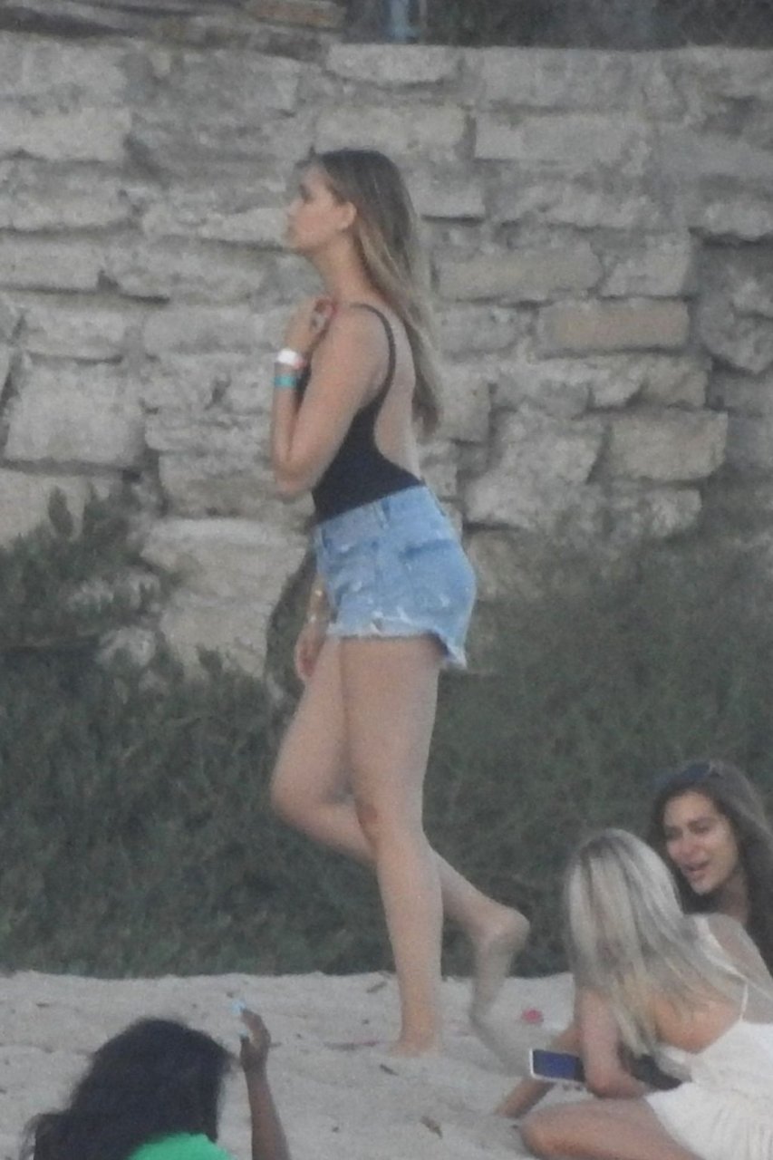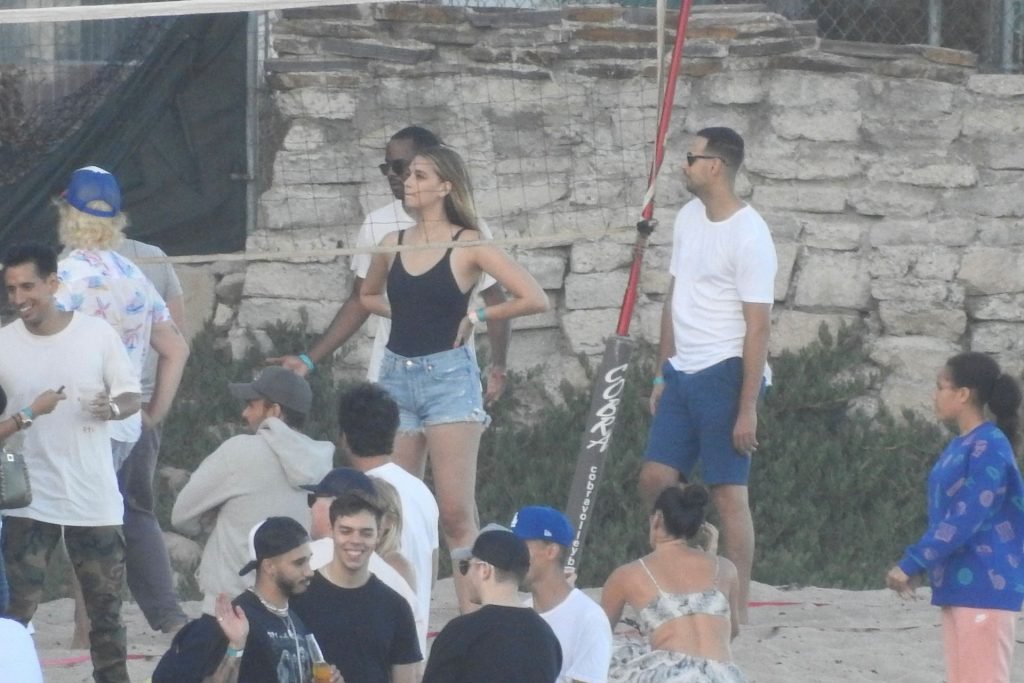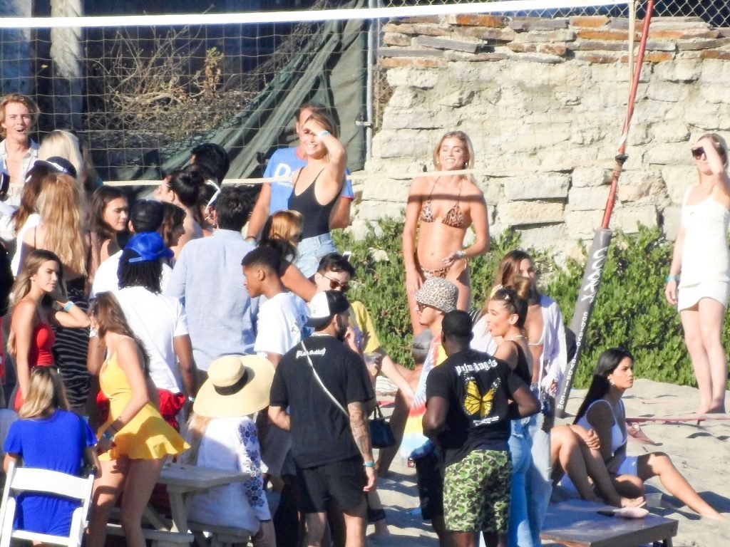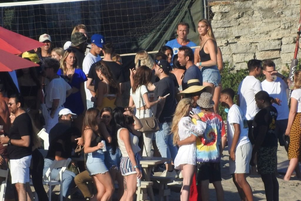 April Love Geary participa de uma festa na praia em Malibu onde Jamie Foxx e Sean Penn também são convidados, 25/08/2019. A modelo chegou com algumas amigas e foi vista aproveitando uma bebida gelada na praia.