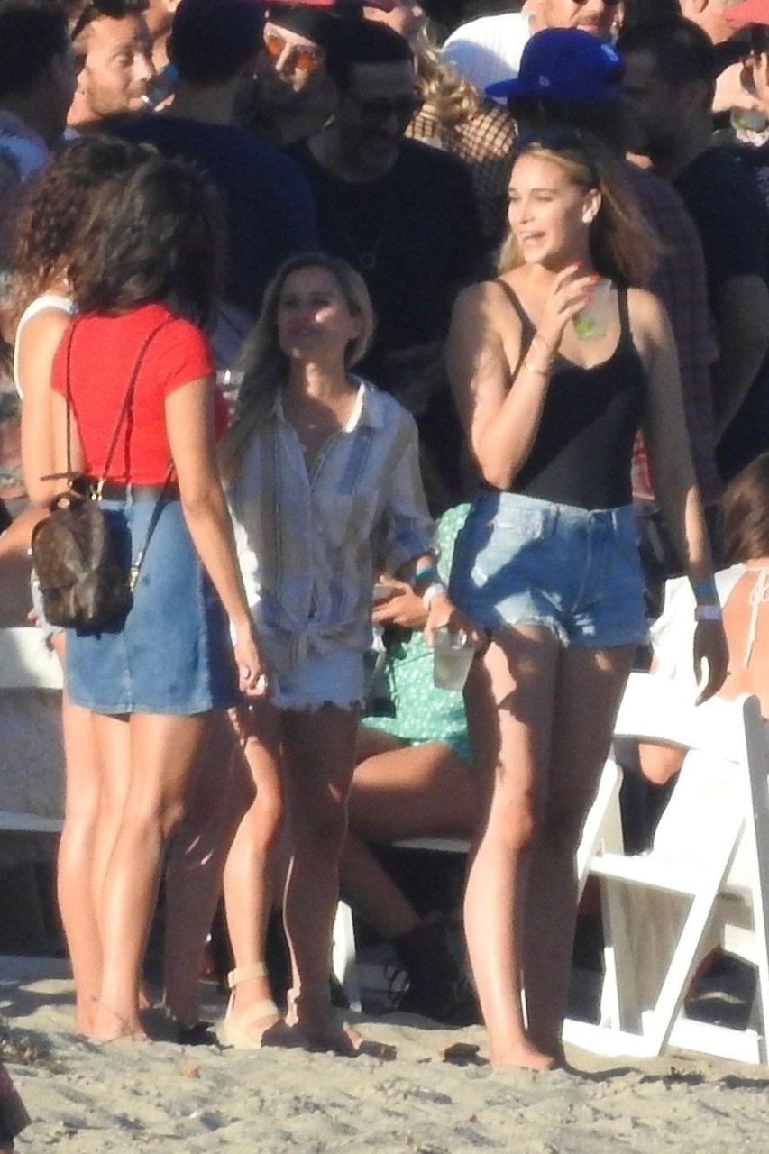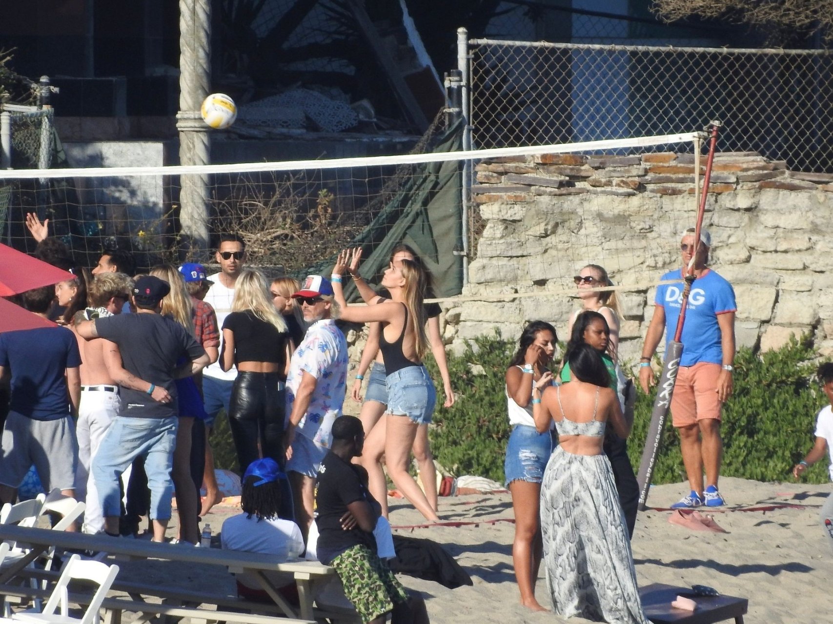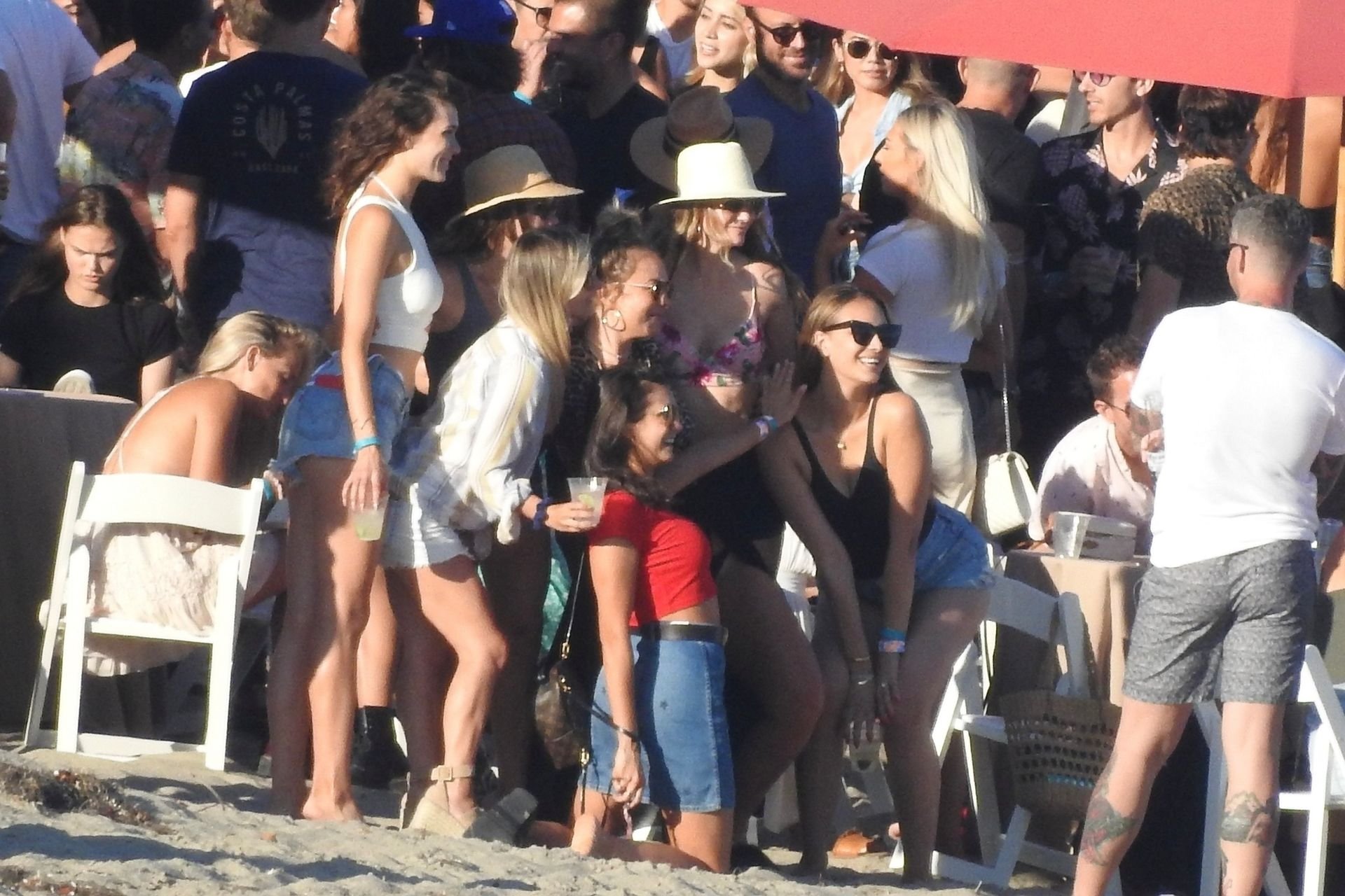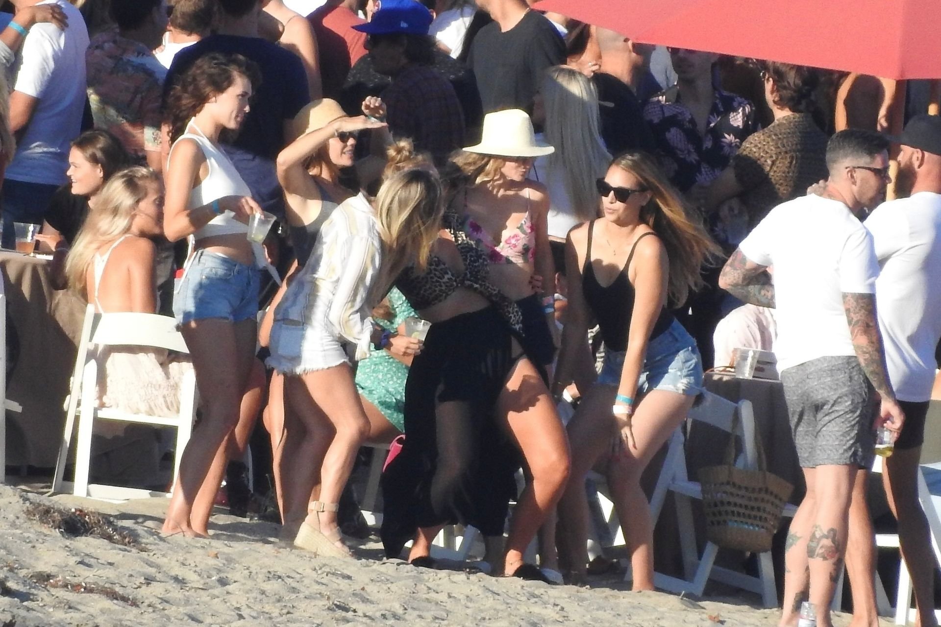 April Love Geary participa de uma festa na praia em Malibu onde Jamie Foxx e Sean Penn também são convidados, 25/08/2019. A modelo chegou com algumas amigas e foi vista aproveitando uma bebida gelada na praia.