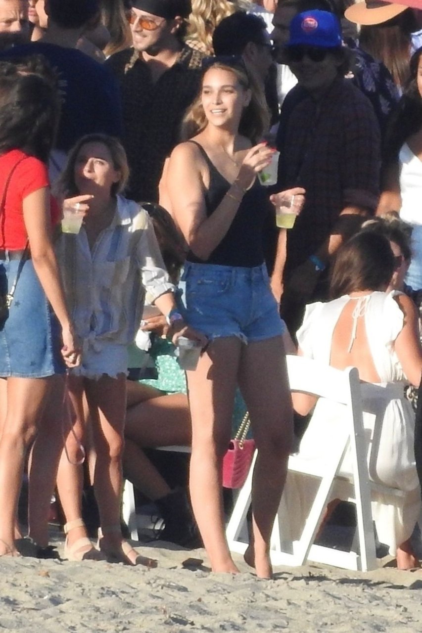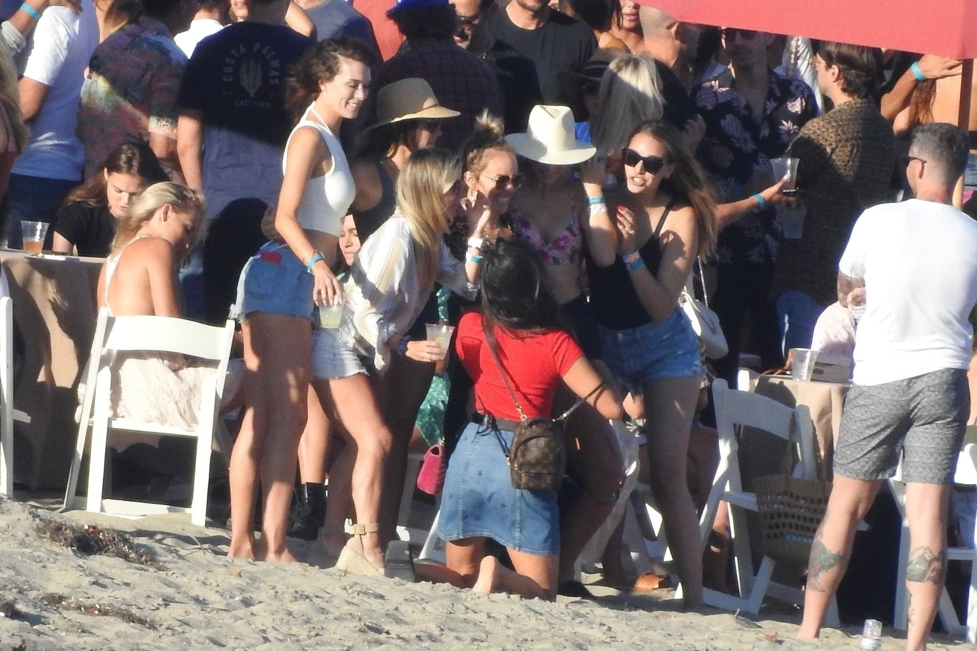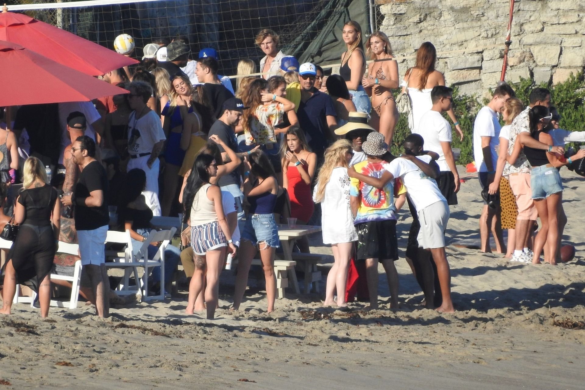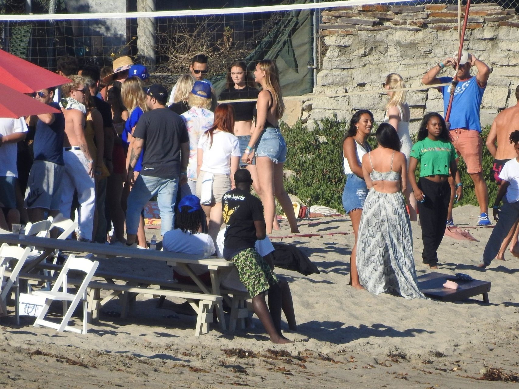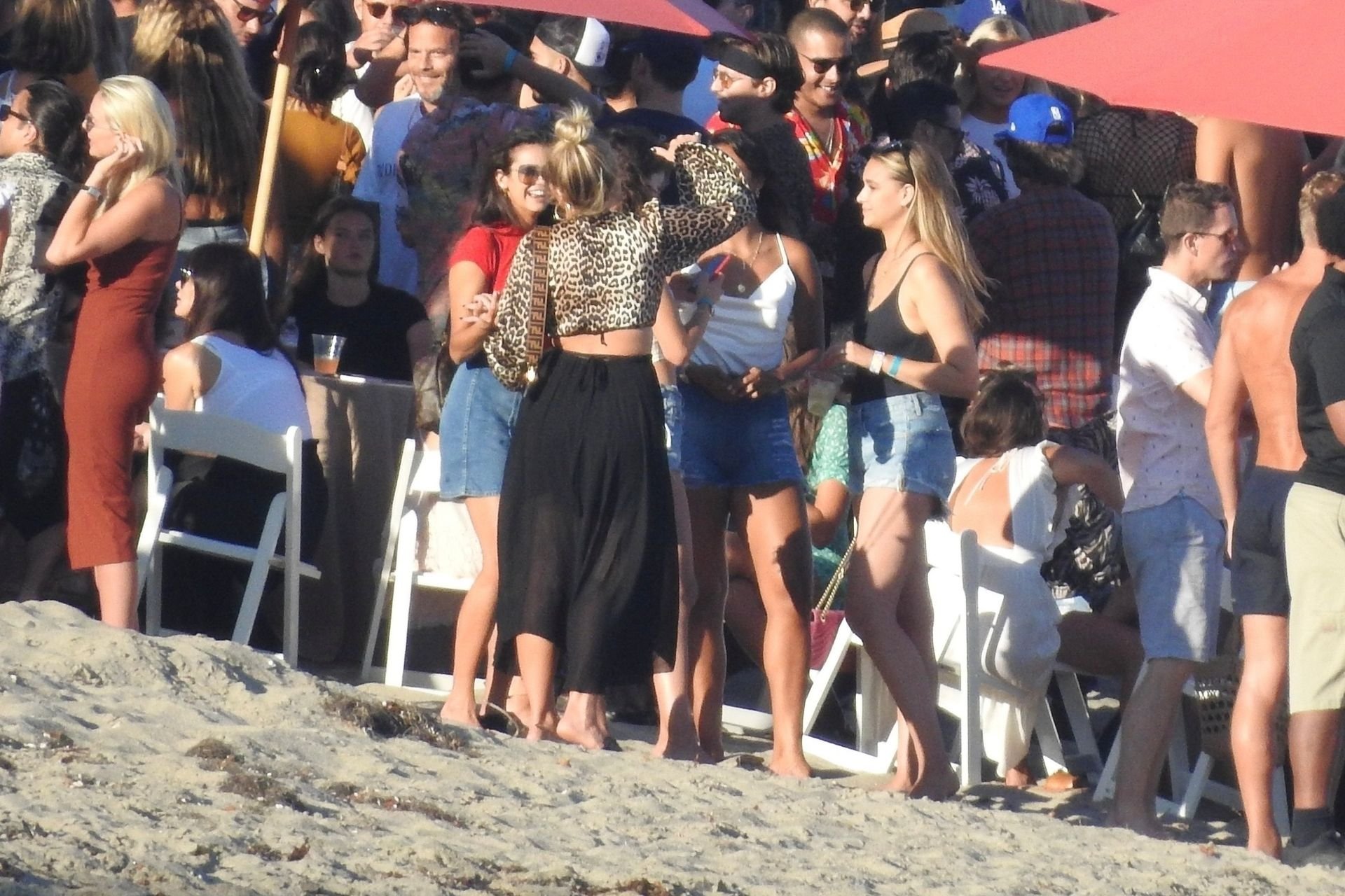 April Love Geary participa de uma festa na praia em Malibu onde Jamie Foxx e Sean Penn também são convidados, 25/08/2019. A modelo chegou com algumas amigas e foi vista aproveitando uma bebida gelada na praia.
