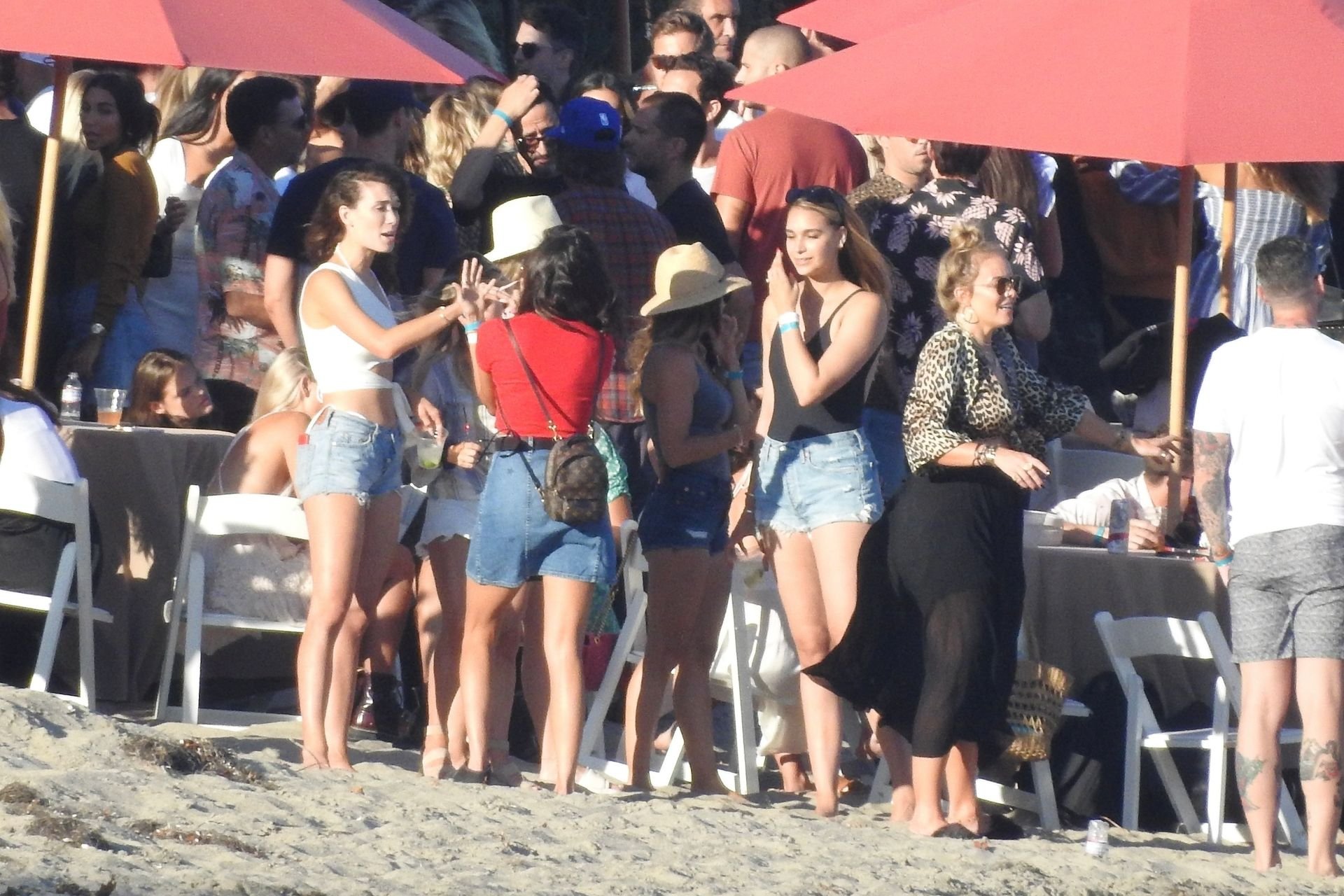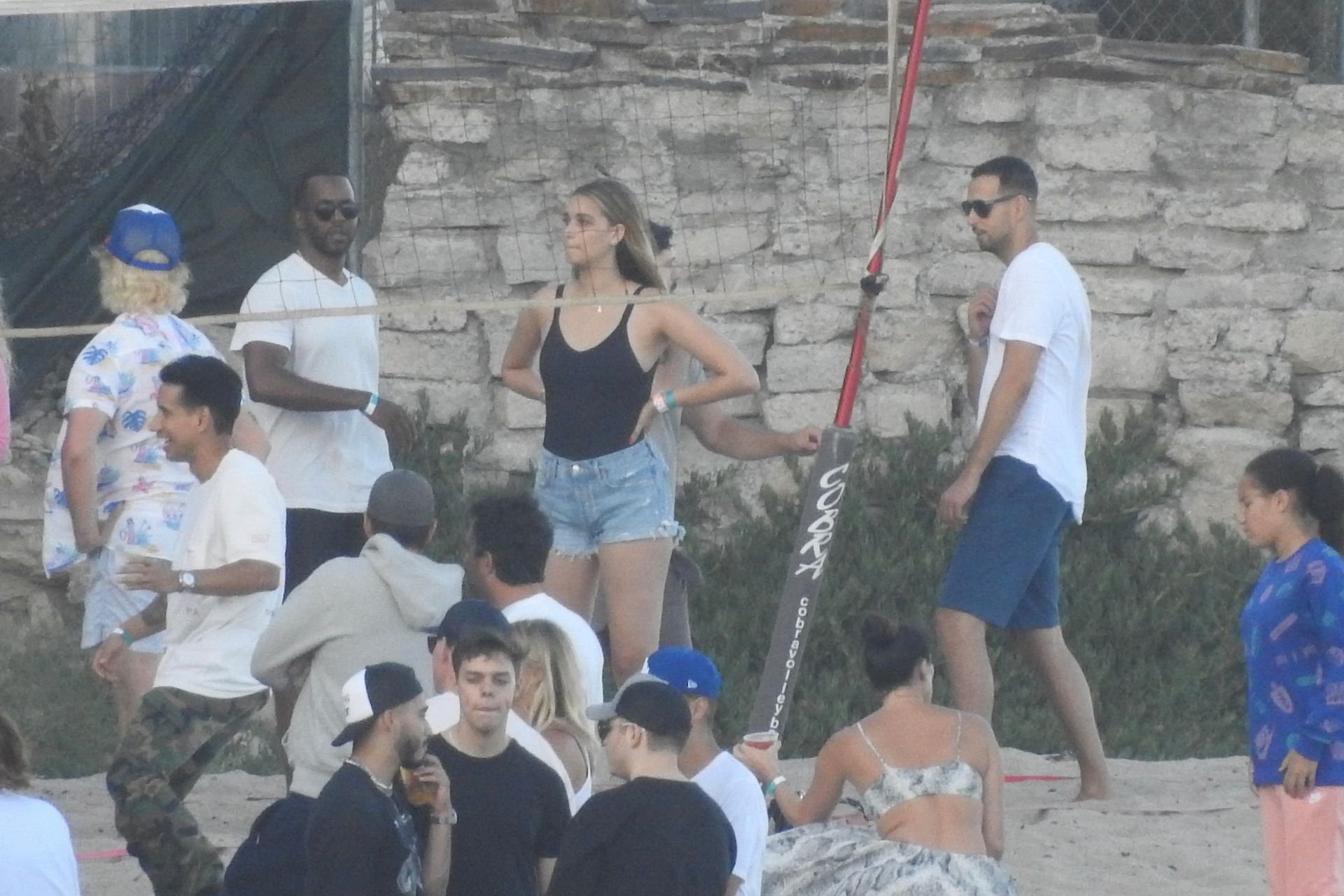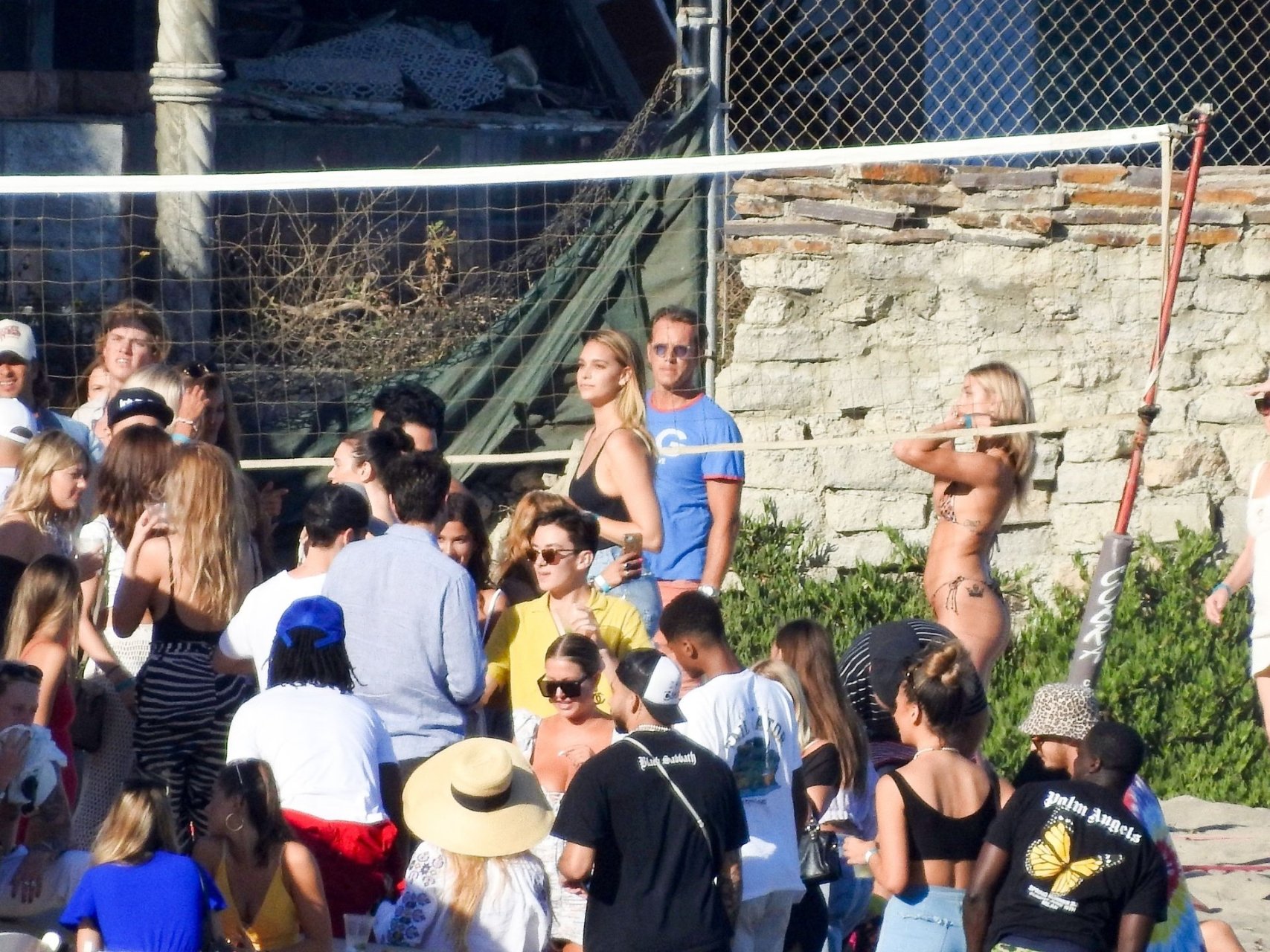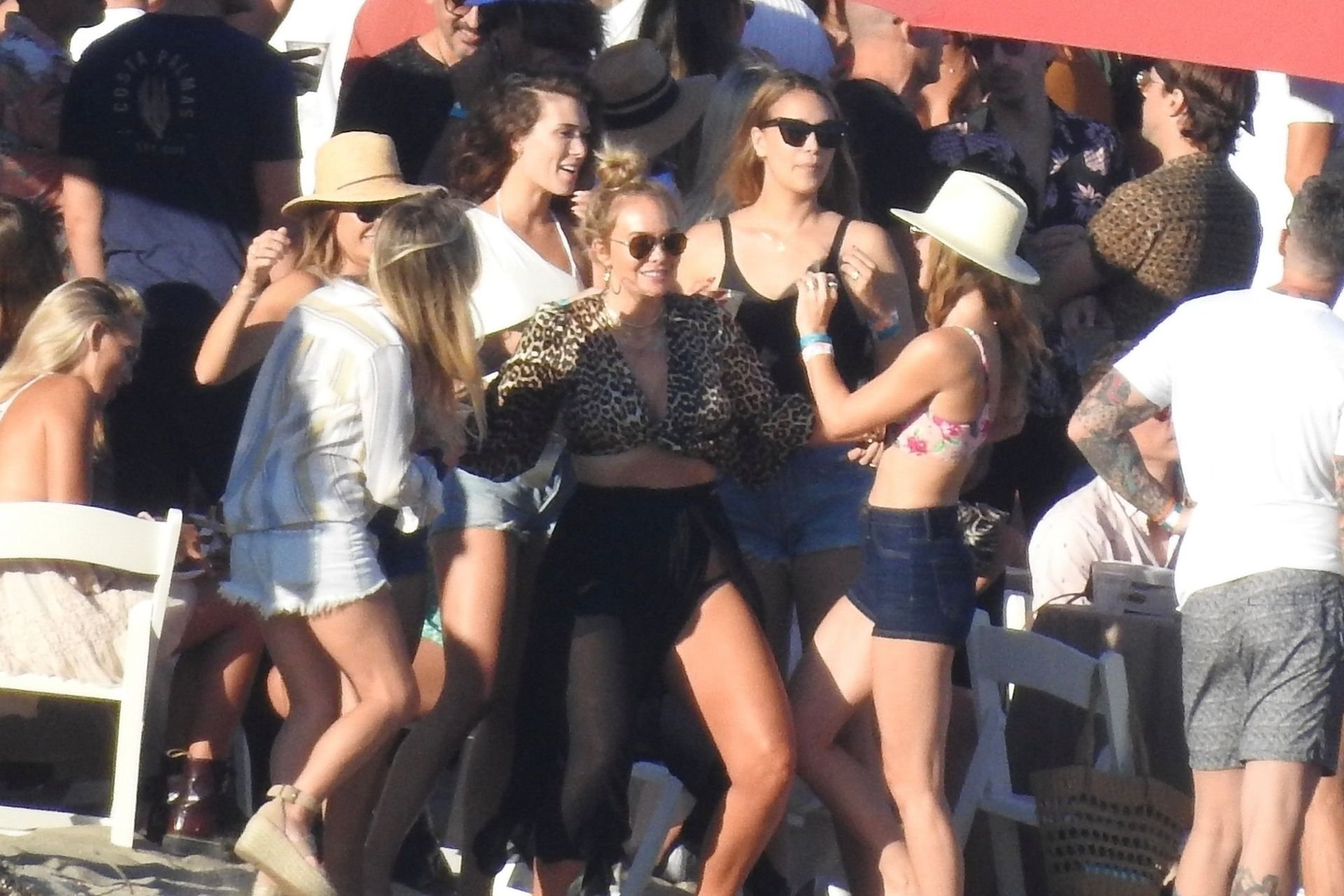 April Love Geary participa de uma festa na praia em Malibu onde Jamie Foxx e Sean Penn também são convidados, 25/08/2019. A modelo chegou com algumas amigas e foi vista aproveitando uma bebida gelada na praia.
