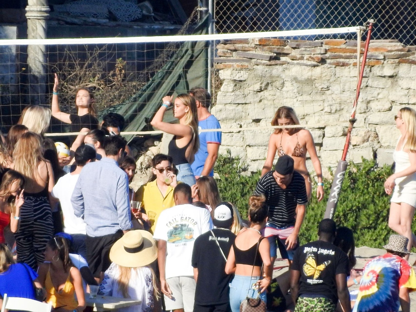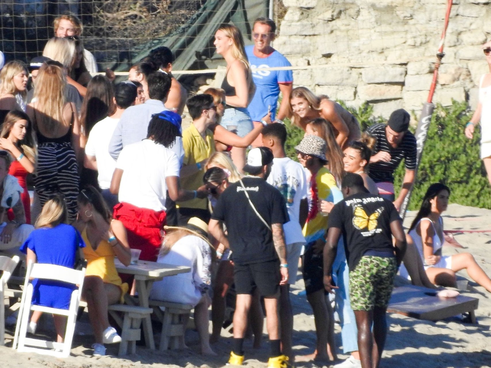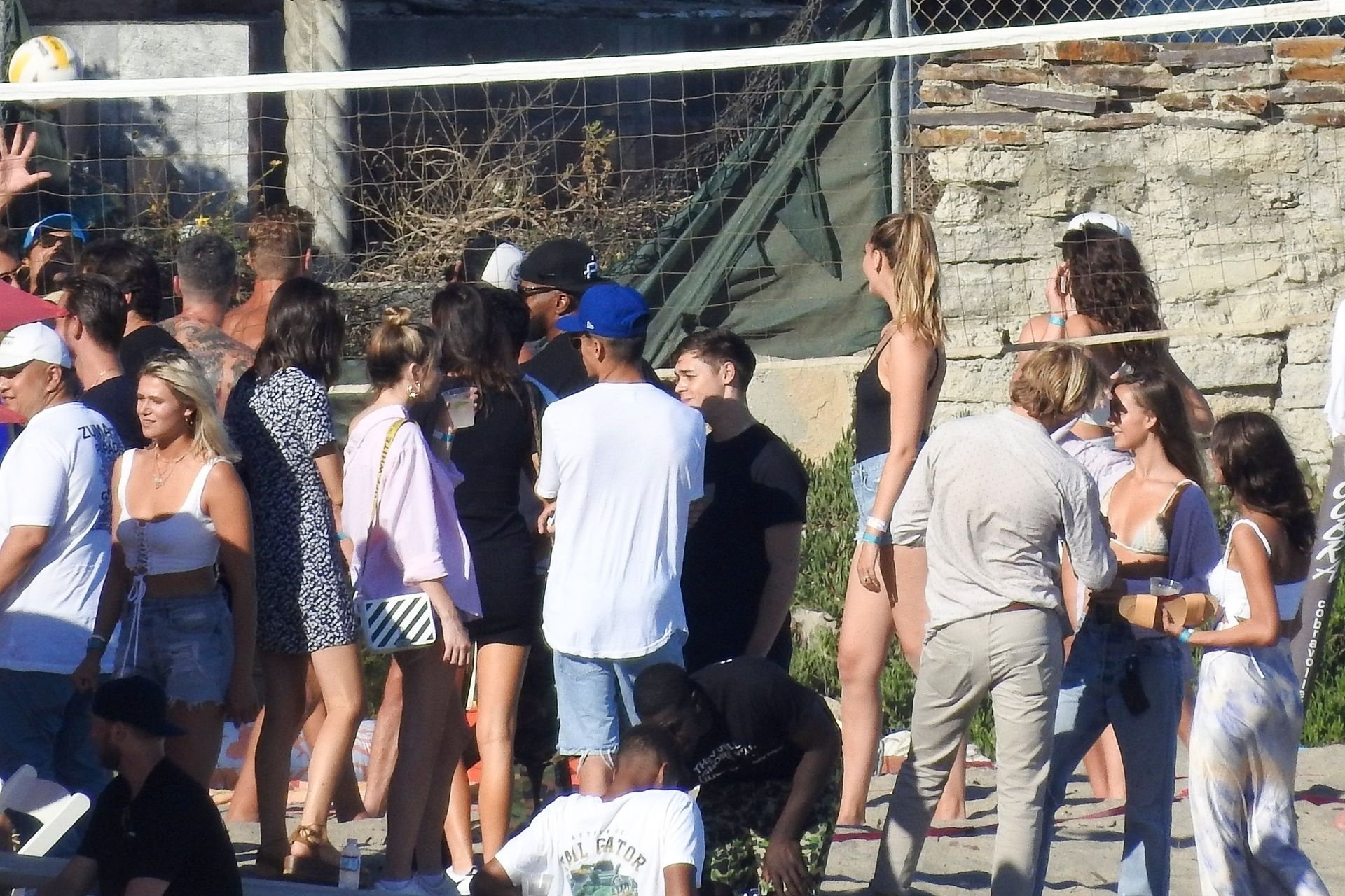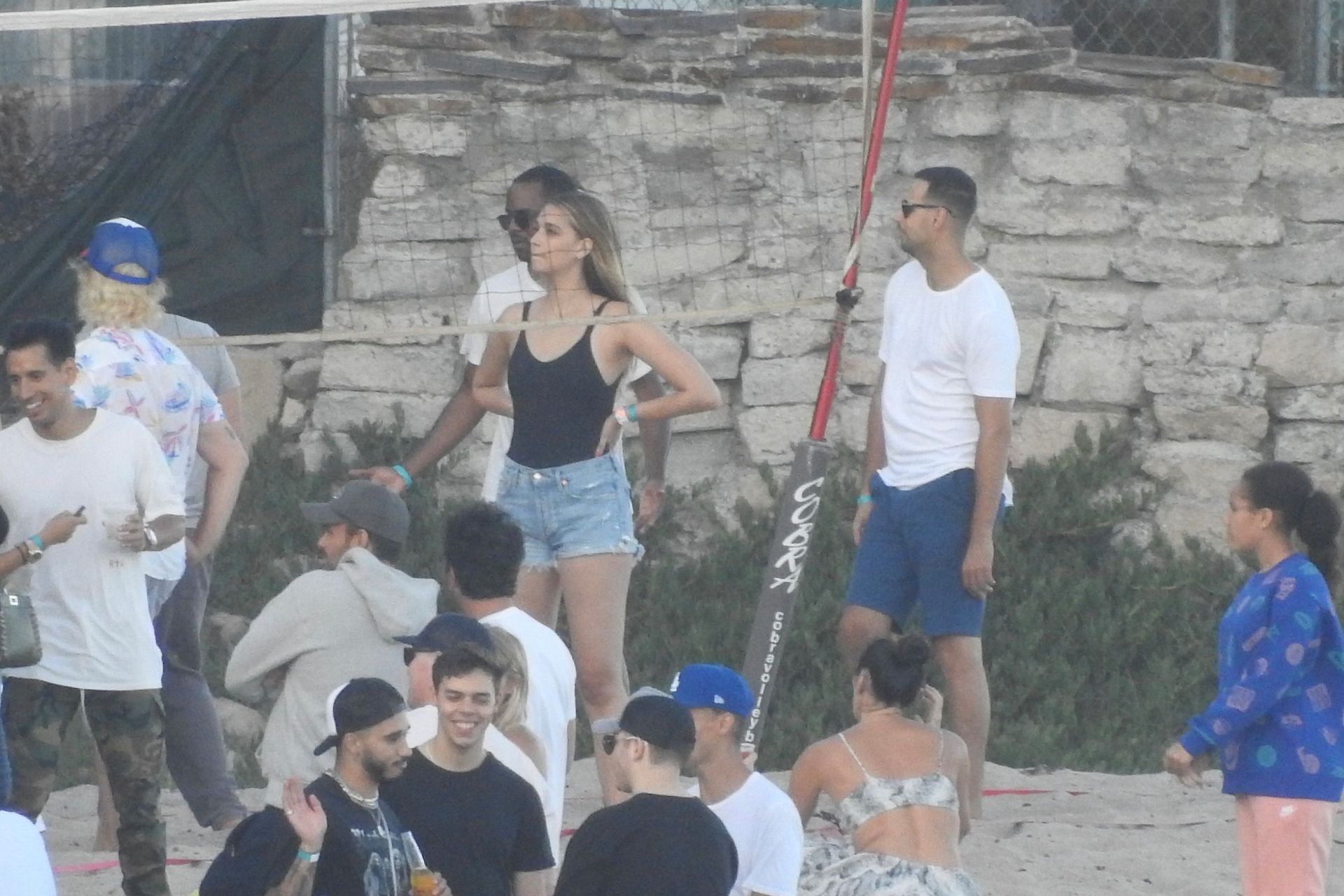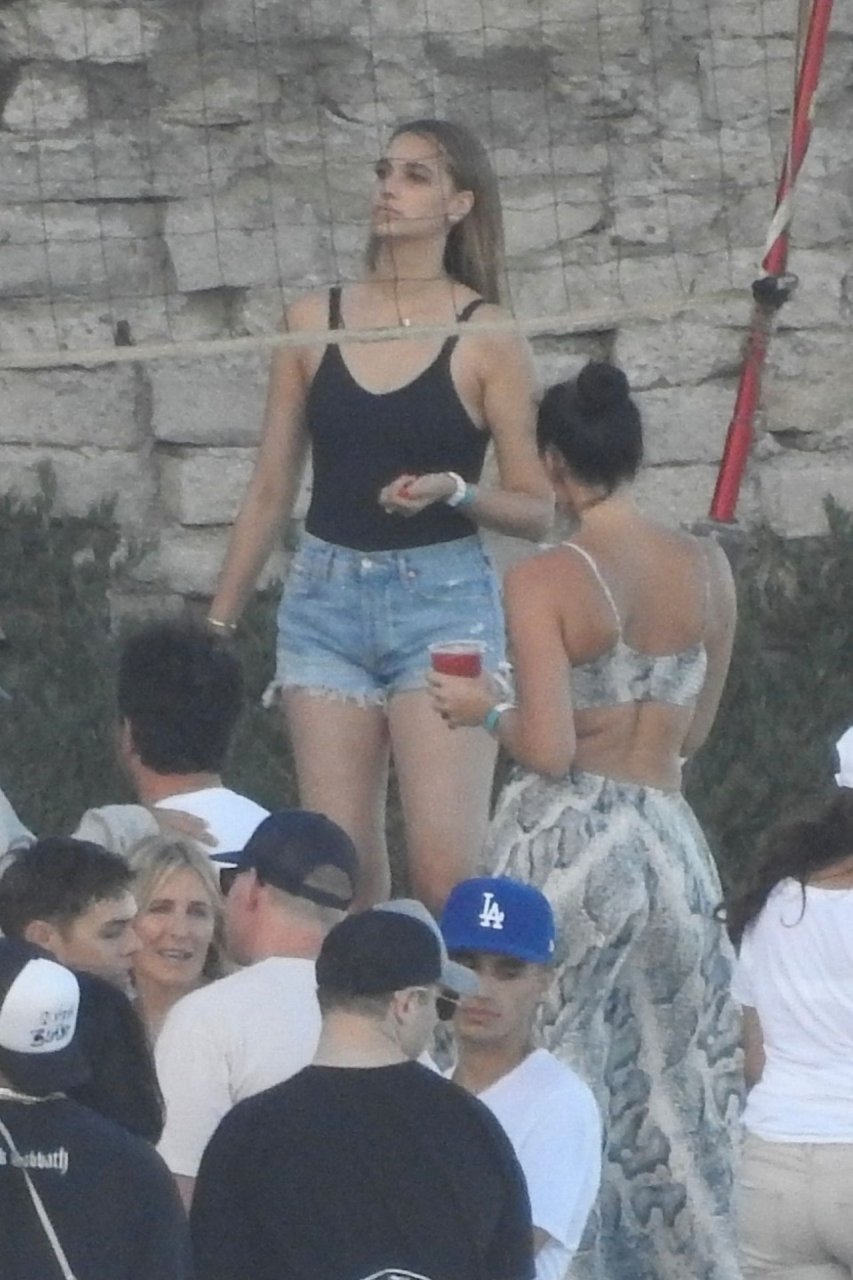 April Love Geary participa de uma festa na praia em Malibu onde Jamie Foxx e Sean Penn também são convidados, 25/08/2019. A modelo chegou com algumas amigas e foi vista aproveitando uma bebida gelada na praia.