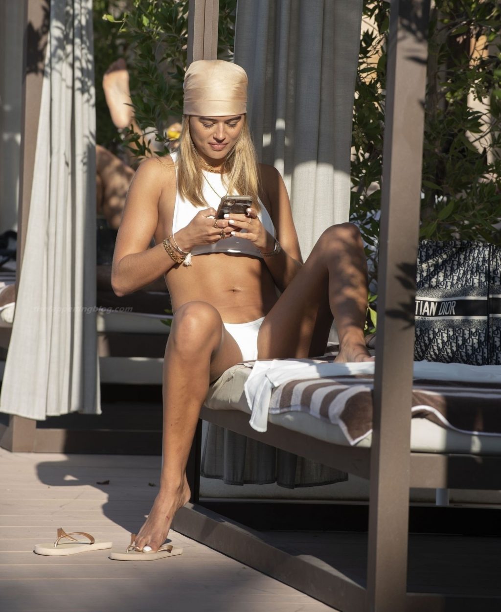 Arabella Chi, do Love Island, deu um mergulho na piscina do Hotel Westin Dubai exibindo seu corpo voluptuoso de praia usando um top cropped branco da Pretty Little Thing e biquíni durante as férias em Dubai em 12/03/2020.