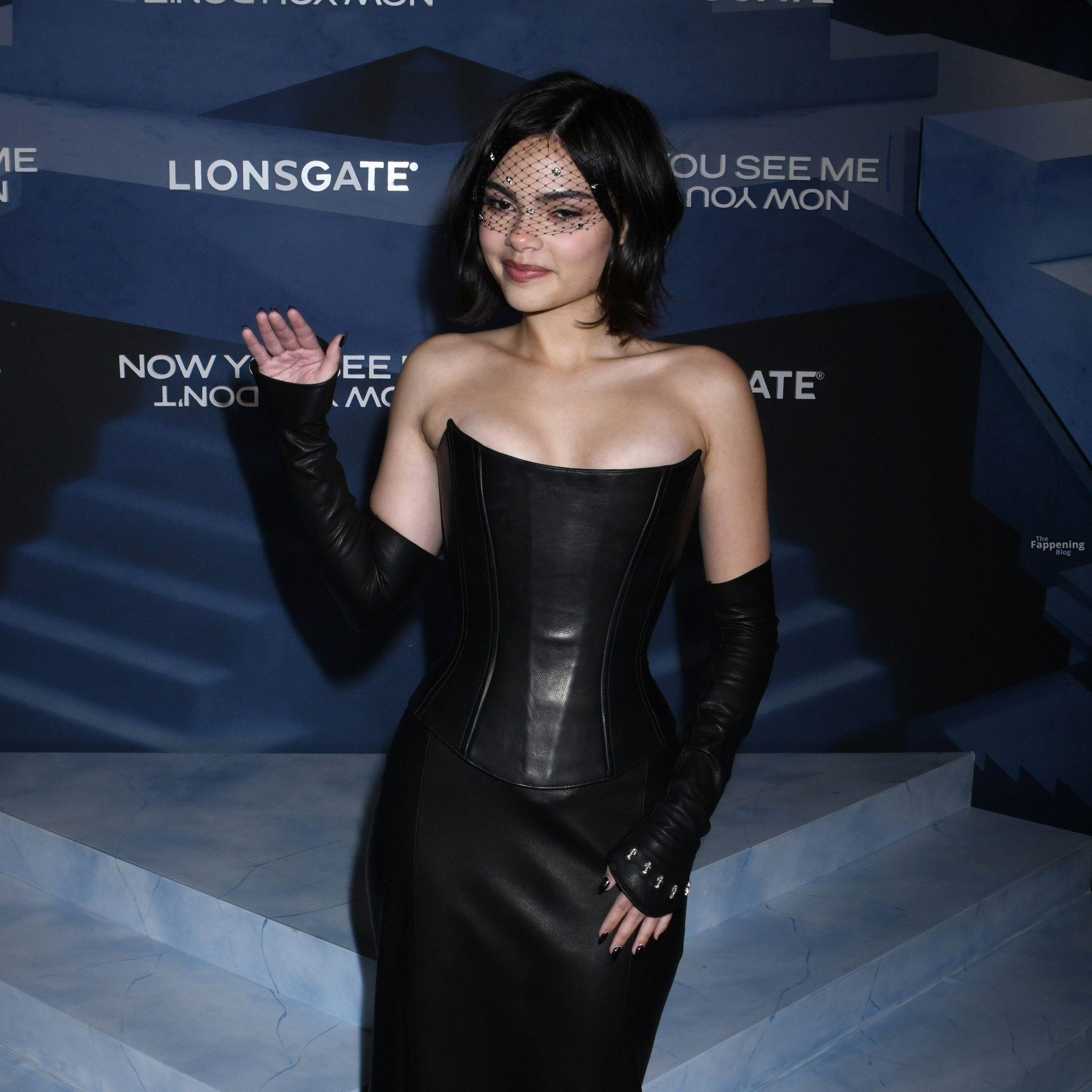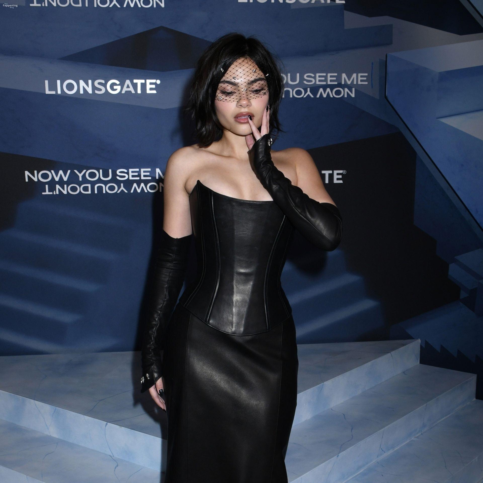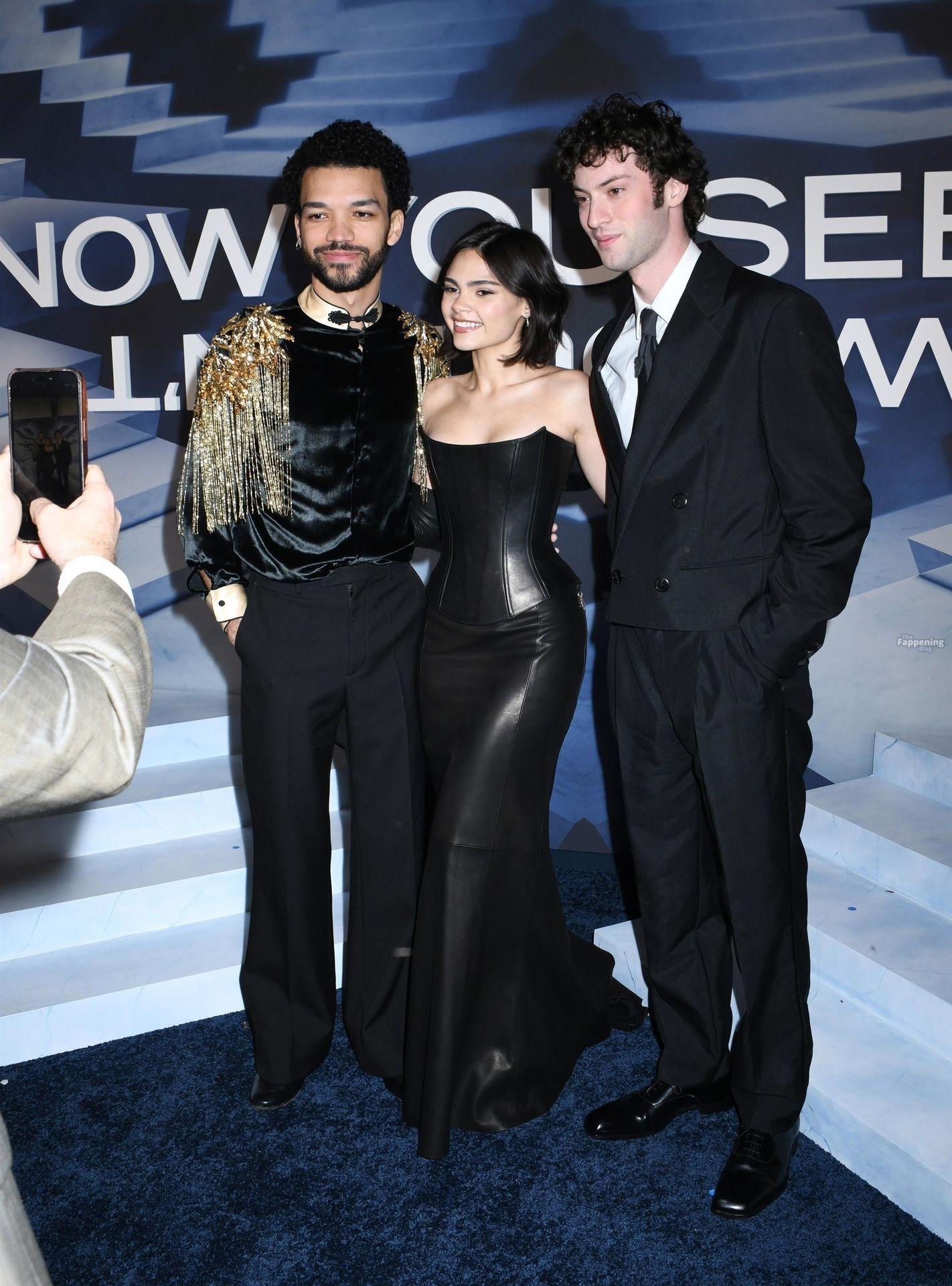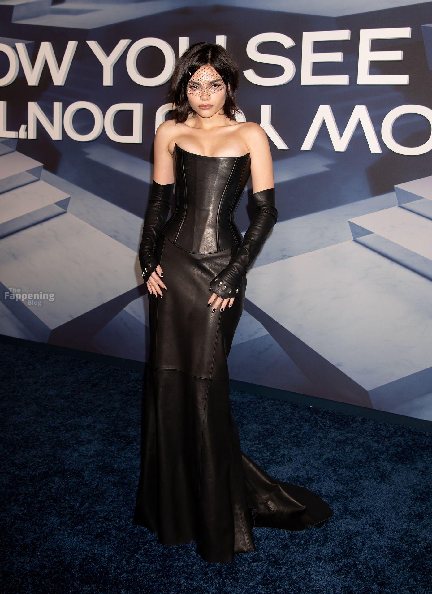 A atriz americana de seios fartos Ariana Greenblatt impressiona em um vestido corselete de couro na estreia de Now You See Me Now You Don’t no The Lighthouse at Chelsea Piers em Manhattan, NYC.