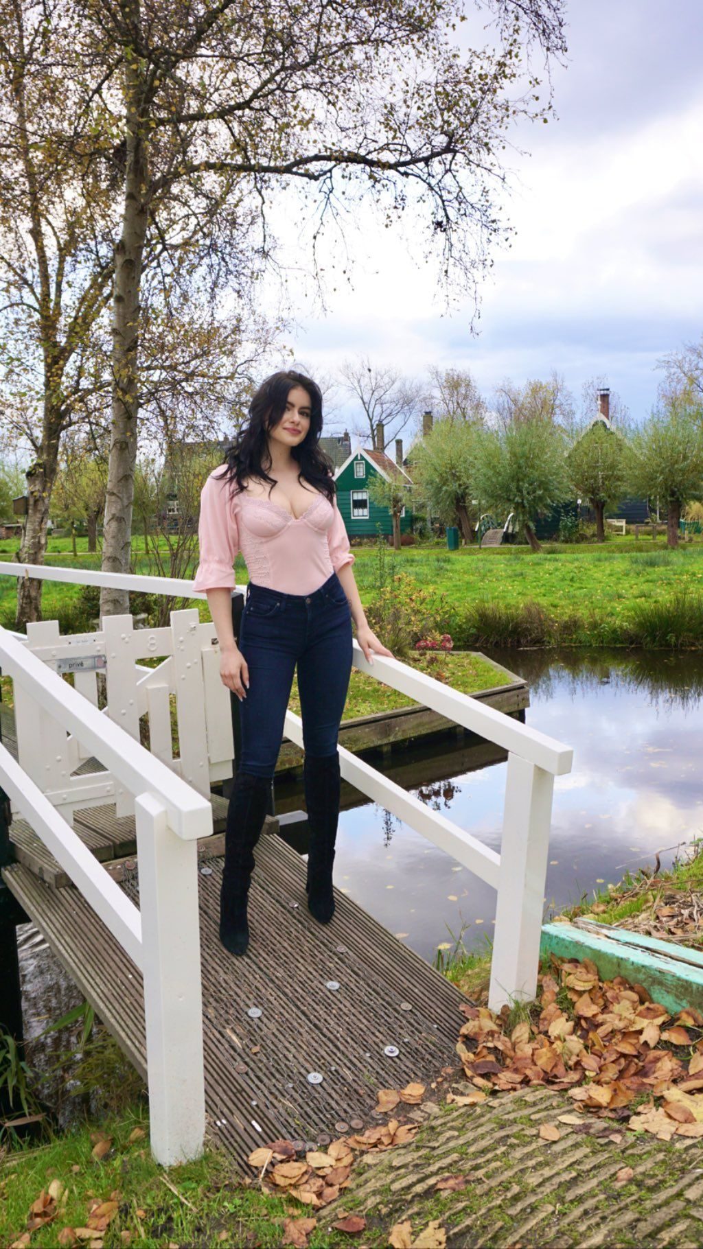 Ariel Winter mostra seus seios, vestindo uma blusa rosa em Zaanse Schans, Amsterdã, Holanda – Instagram, 19/11/2019. Você ainda pode olhar para seus seios, não para a casa ao fundo.