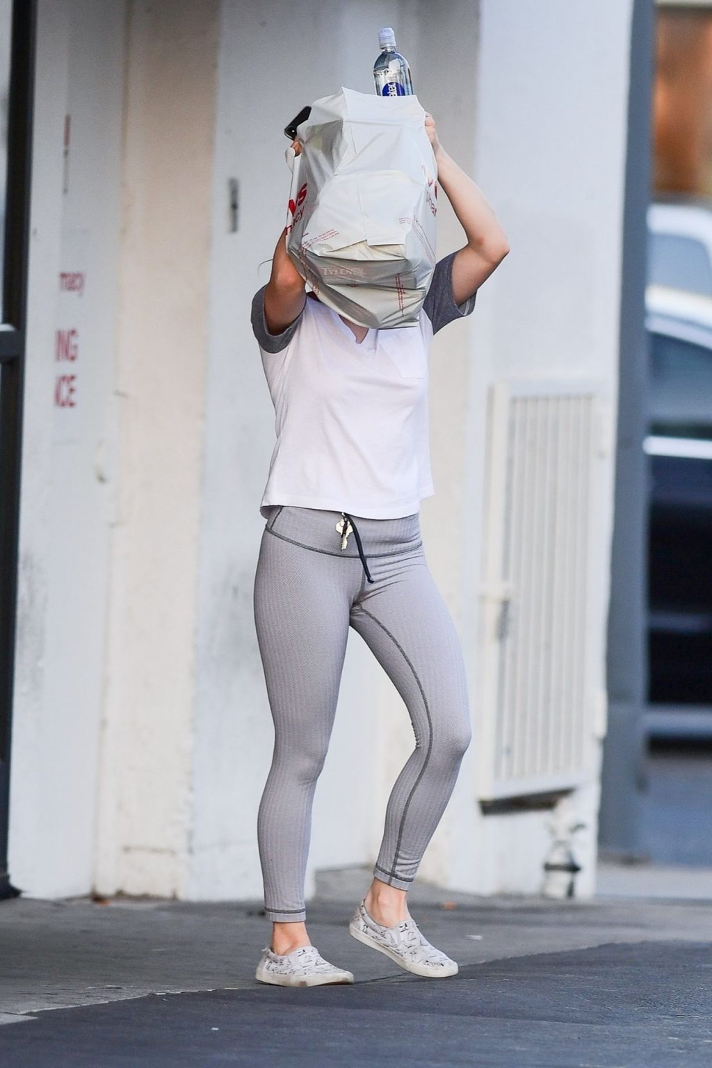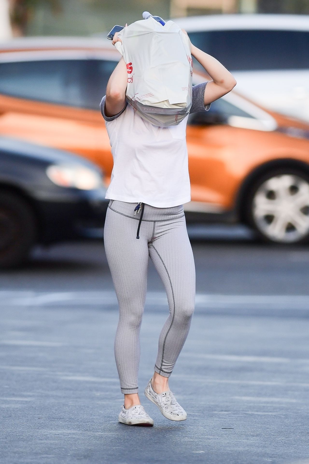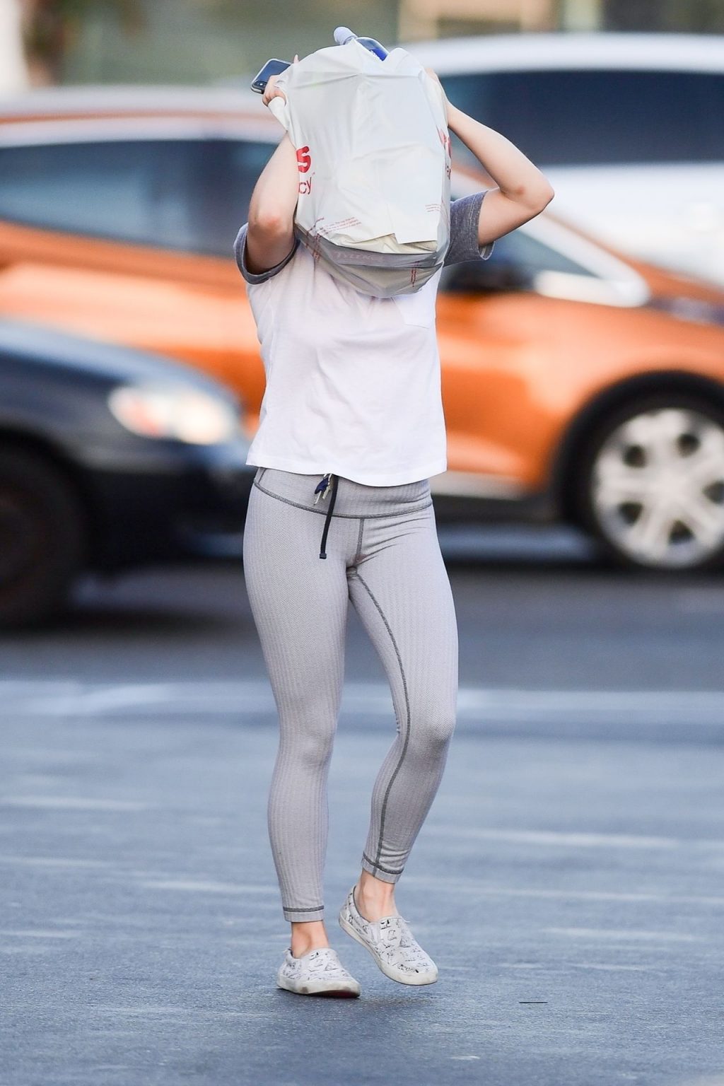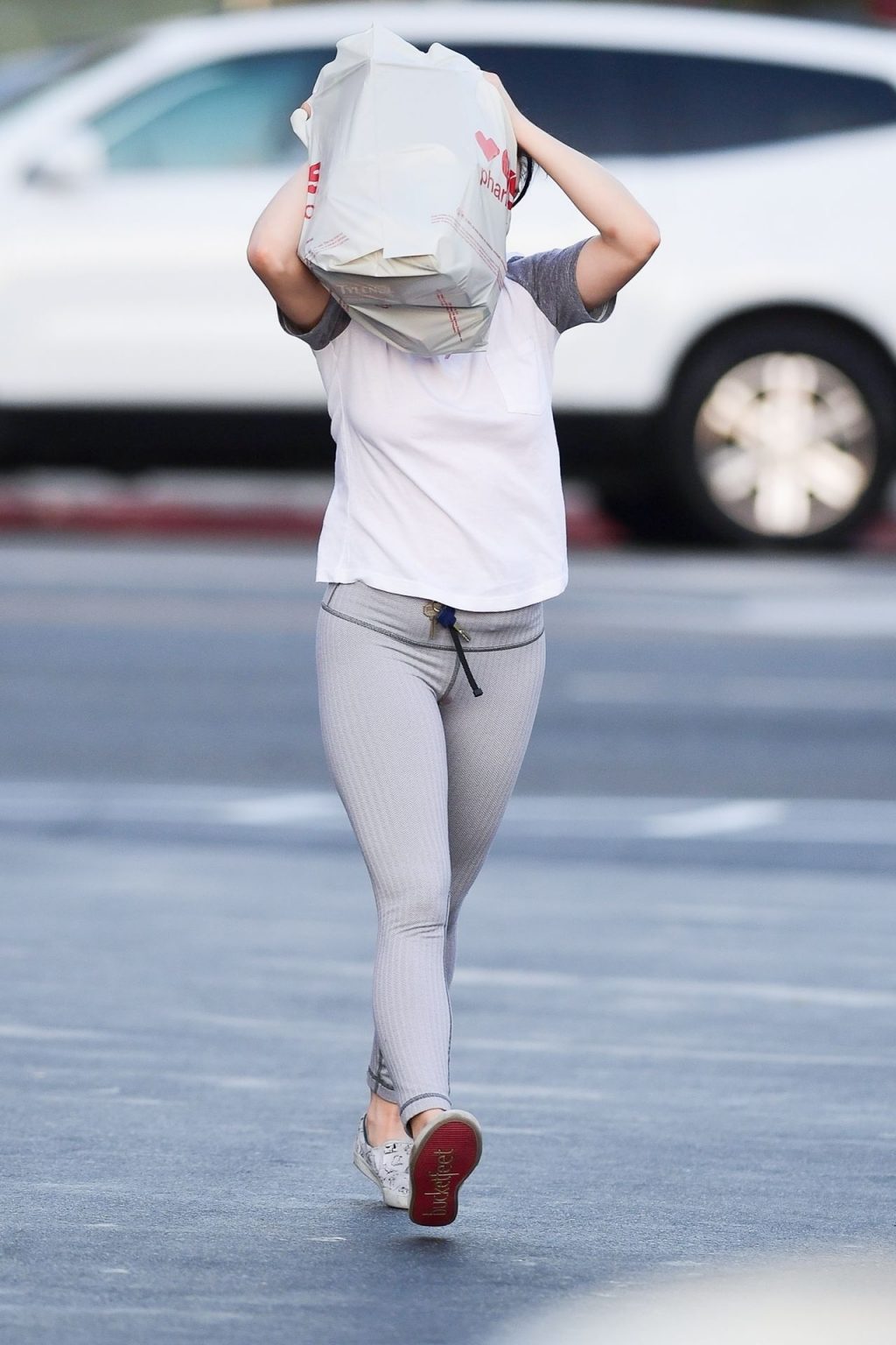 “Modern Family” atriz Ariel Winter cobre o rosto com sua sacola de compras ao sair da CVS após fazer algumas compras em Los Angeles, 10/11/2019.