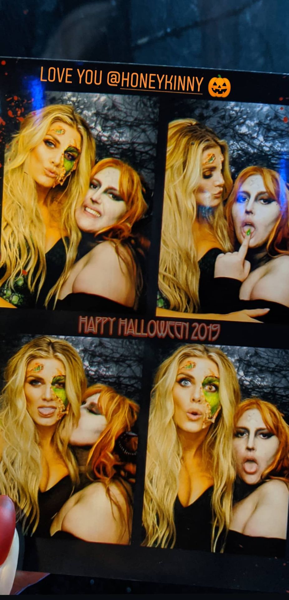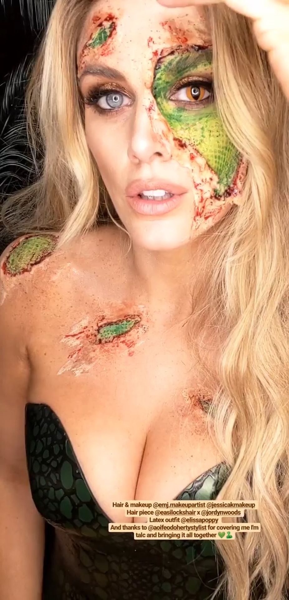 O apresentador de TV e rádio Jonathan Ross organiza sua festa anual de Halloween em Londres, 01/11/2019. A estrela de reality show e DJ de 32 anos, Ashley James, estava aqui com uma roupa sexy de látex “Cobra”, exibindo seu famoso decote.