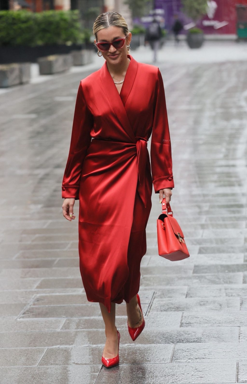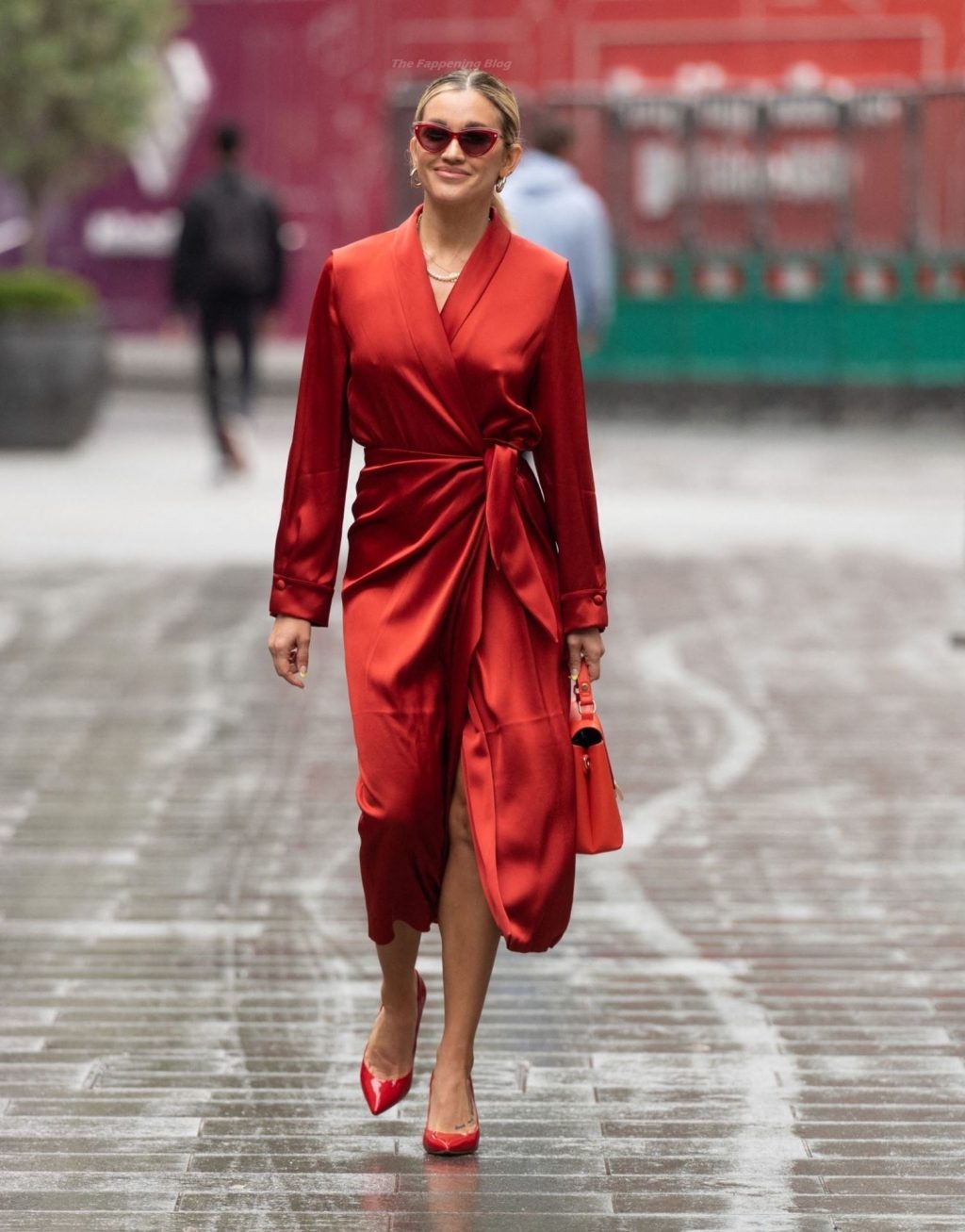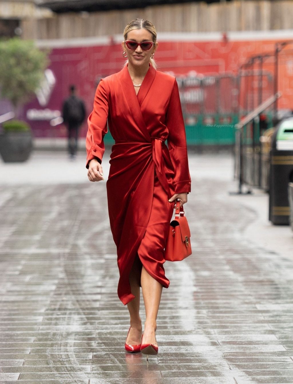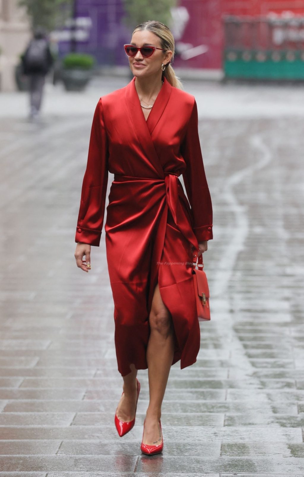 A cantora e apresentadora de TV/rádio Ashley Roberts usa um vestido carmesim com fenda alta, mostrando suas curvas na rádio Heart em Londres, 29/06/2021.