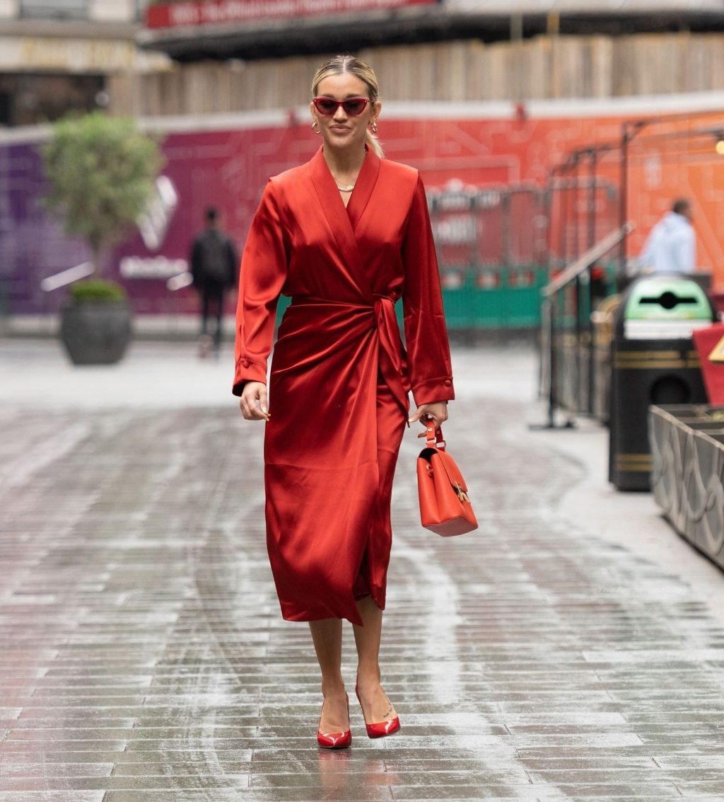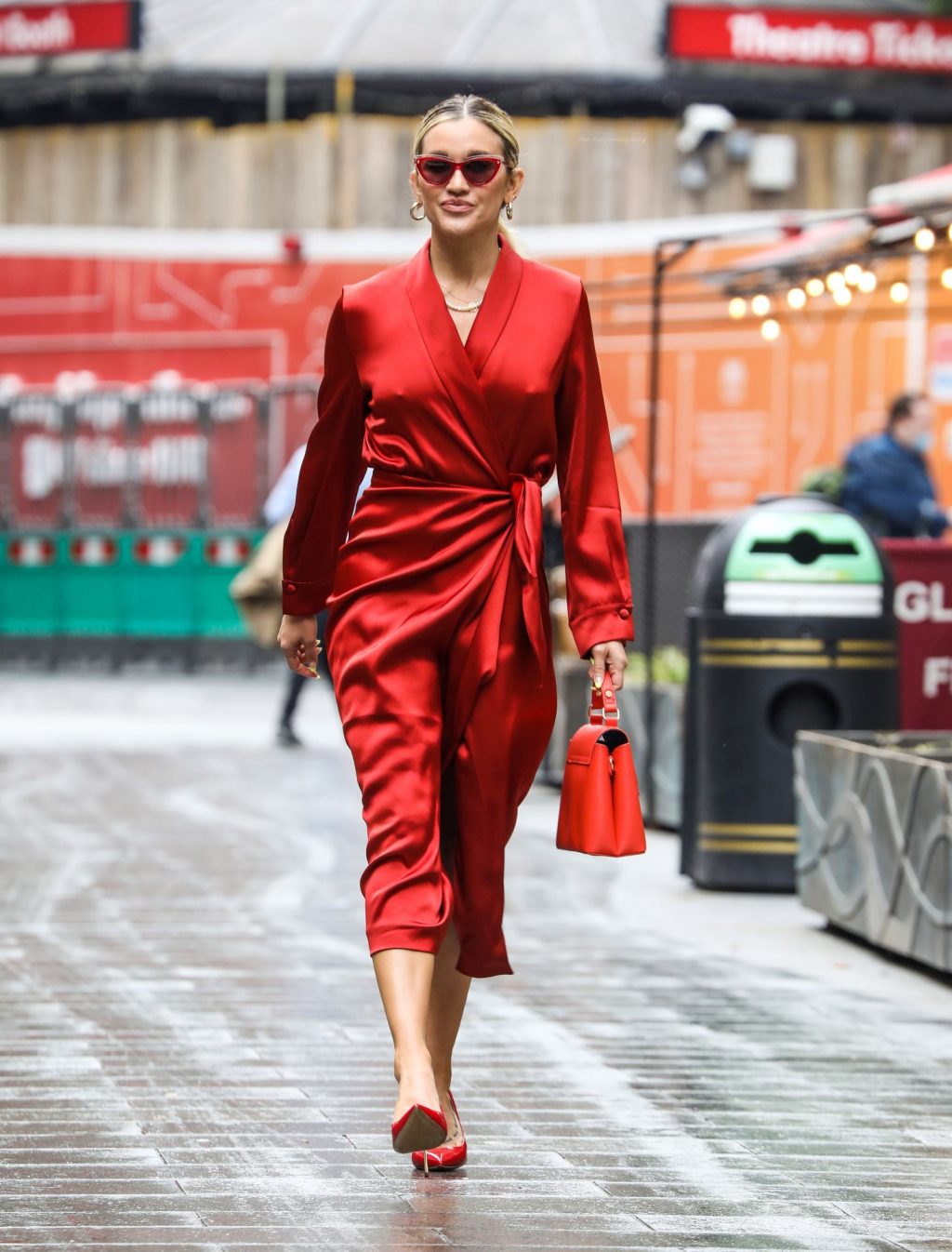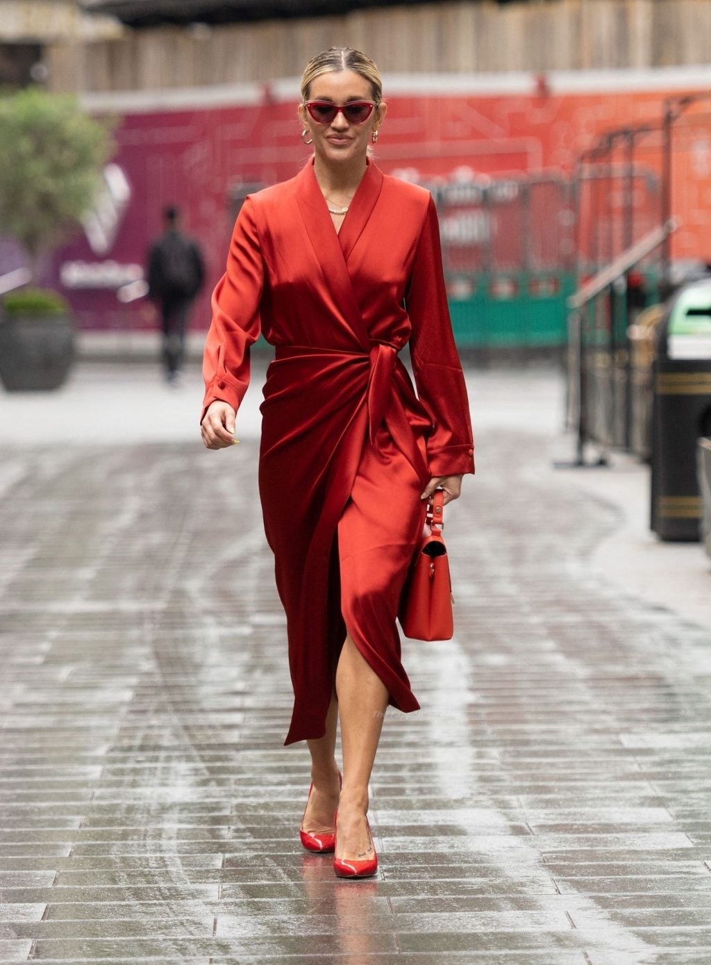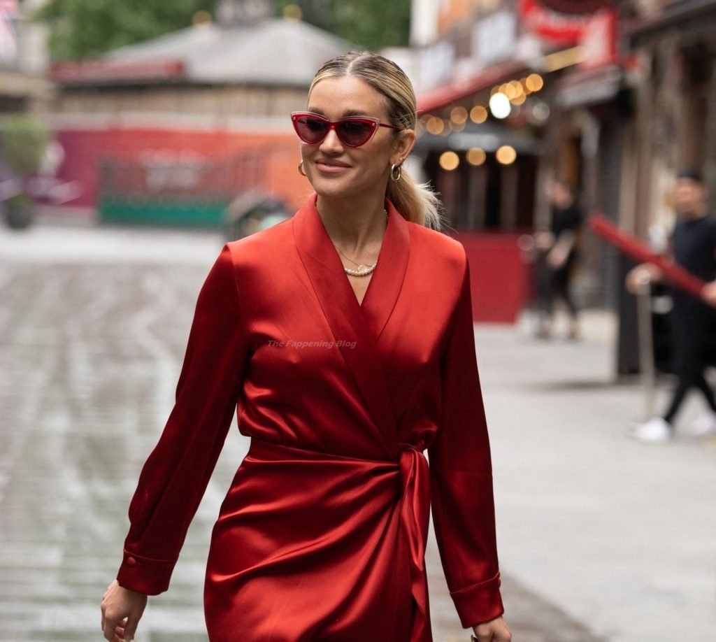 A cantora e apresentadora de TV/rádio Ashley Roberts usa um vestido carmesim com fenda alta, mostrando suas curvas na rádio Heart em Londres, 29/06/2021.