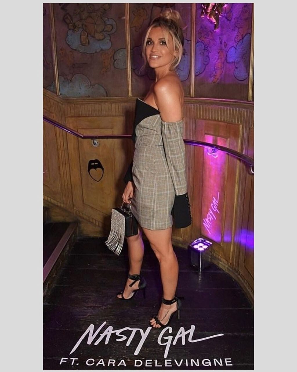 Ashley Roberts, com seios fartos e pernas longas, foi vista saindo da festa de lançamento Cara Delevingne x Nasty Gal no clube The Box em Soho, Londres, 22/10/2019.