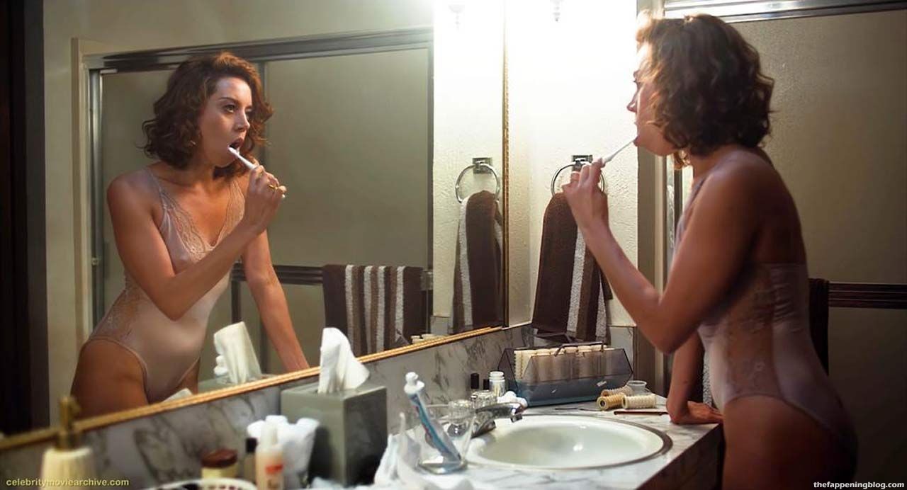 In this scene from ‘An Evening with Beverly Luff Linn’, we can see Aubrey Plaza sexy in beige lingerie brushing her teeth in the bathroom. Then her man enters and starts to kiss her neck from behind, but Aubrey is not satisfied and leaves the bathroom. Her nipples are poking!