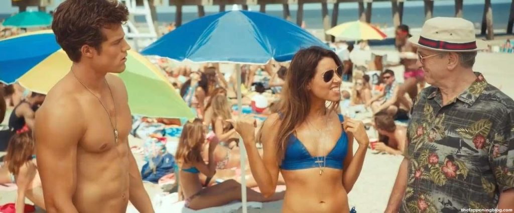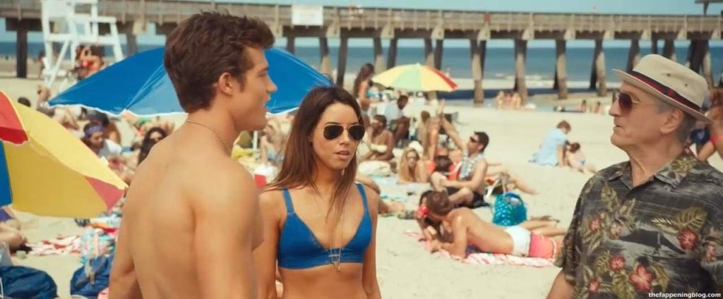 Aubrey Plaza is seen here in a blue bikini while talking to Robert De Niro and one younger guy. Her boobs are pressed with this upper bikini, she has sunglasses and talking dirty to a man, then he squeezes body milk onto Plaza’s cleavage, as she screams!