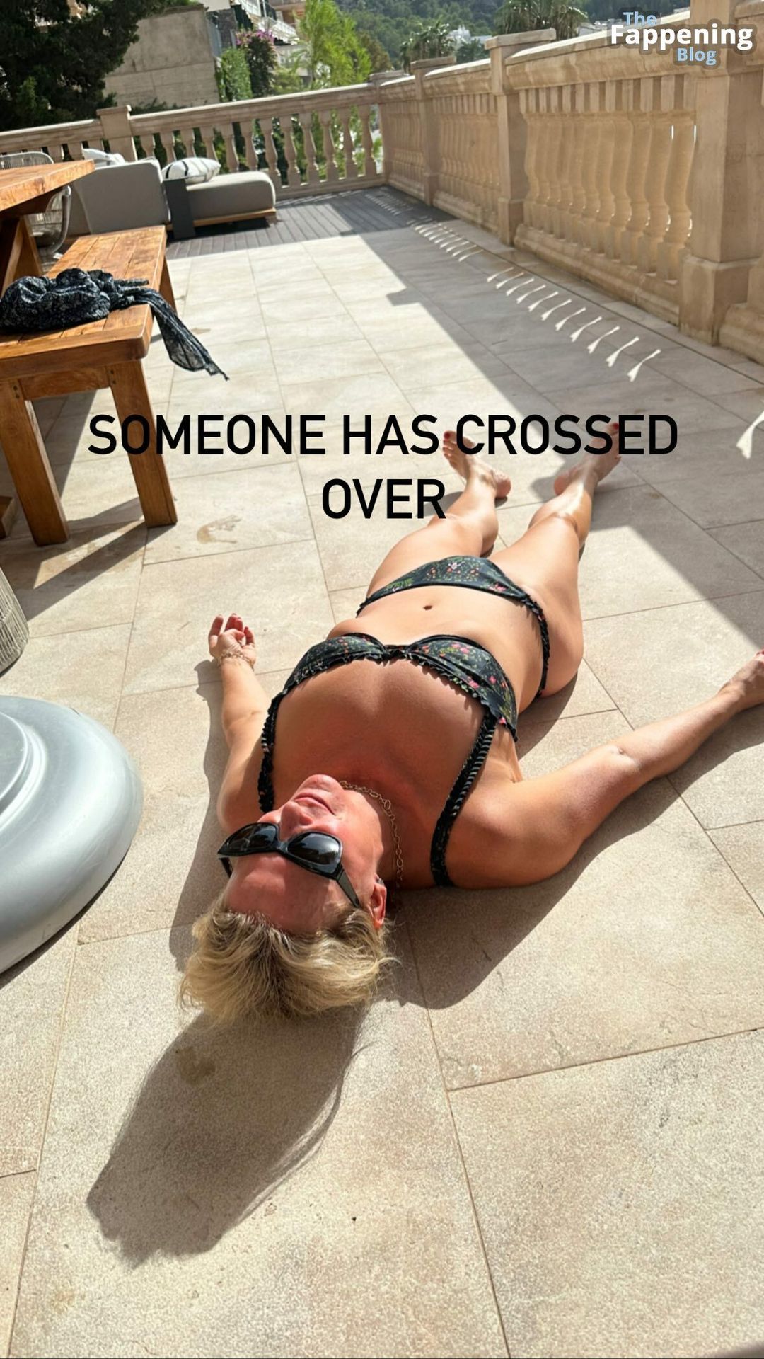 Chelsea Handler está mostrando seu decote, seus grandes seios, enquanto está deitada no chão sob o sol, usando um biquíni. Ela está esquentando o clima e fazendo uma declaração ousada como uma chefe.