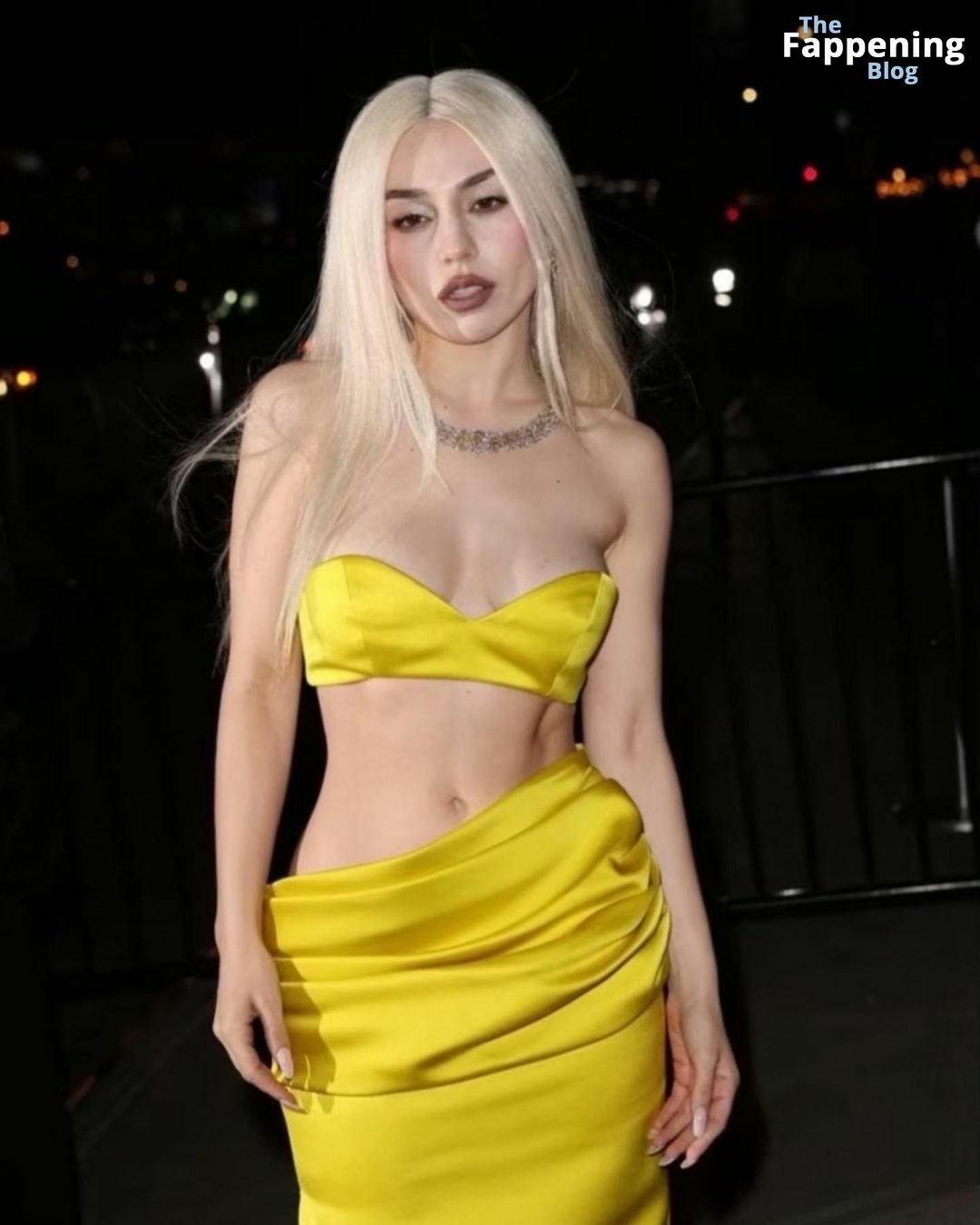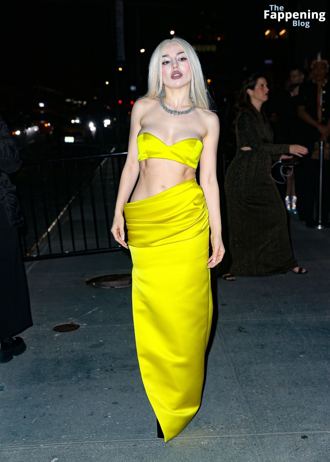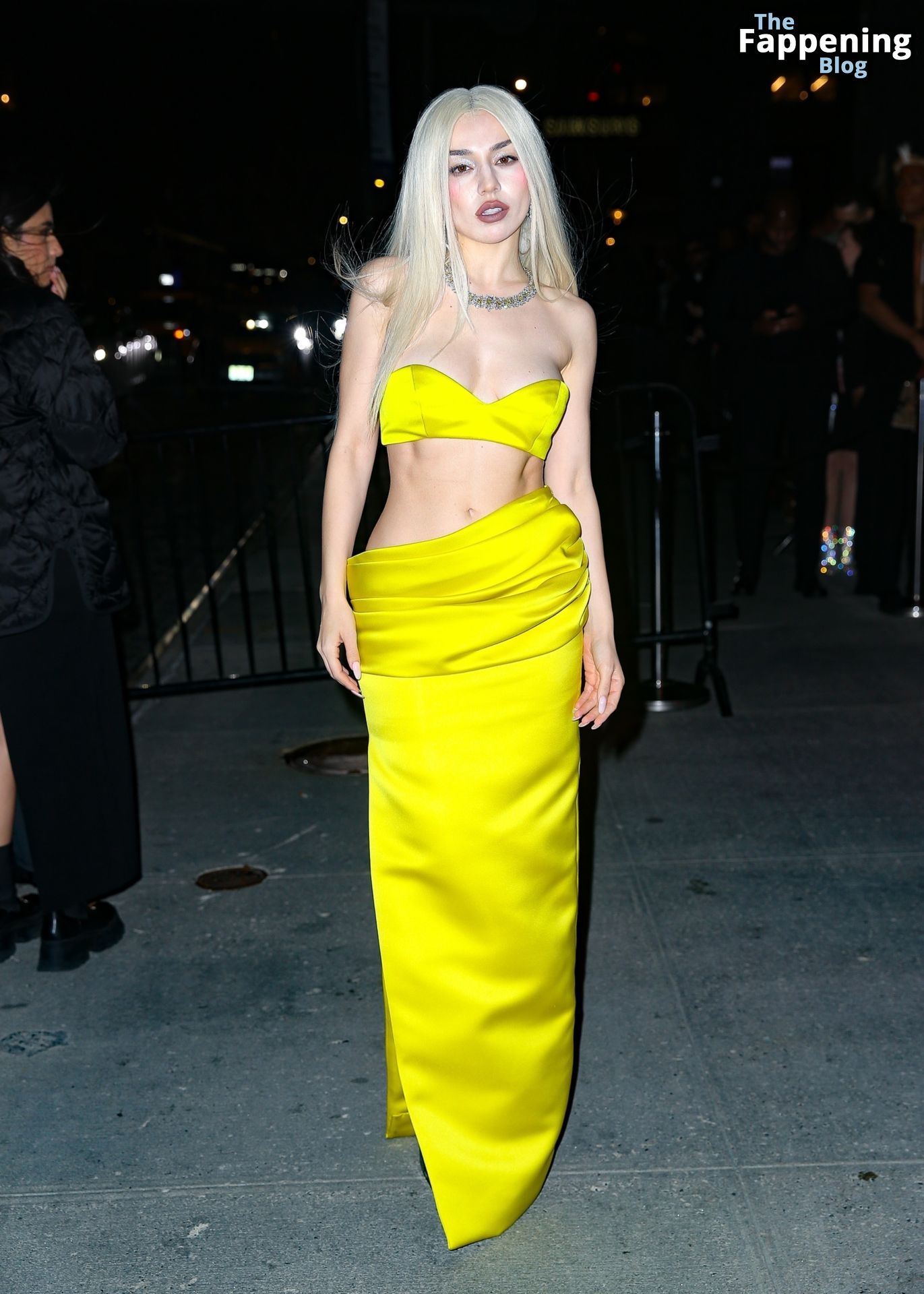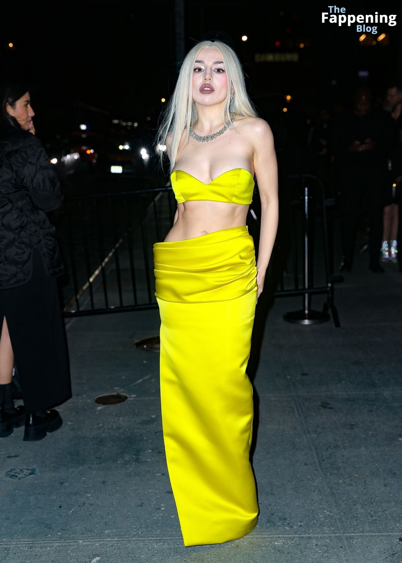 Não subestime a declaração de moda quente de Ava Max: um vestido amarelo sem sutiã que destaca toda a sua beleza enquanto ela é vista chegando a uma festa do Met Gala em NYC.