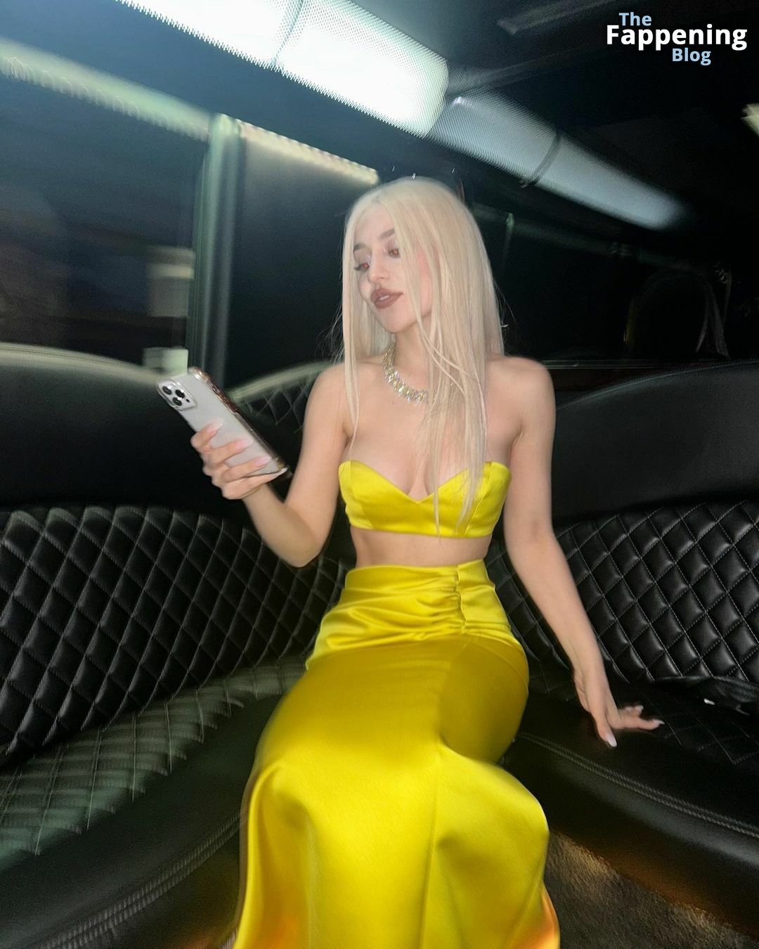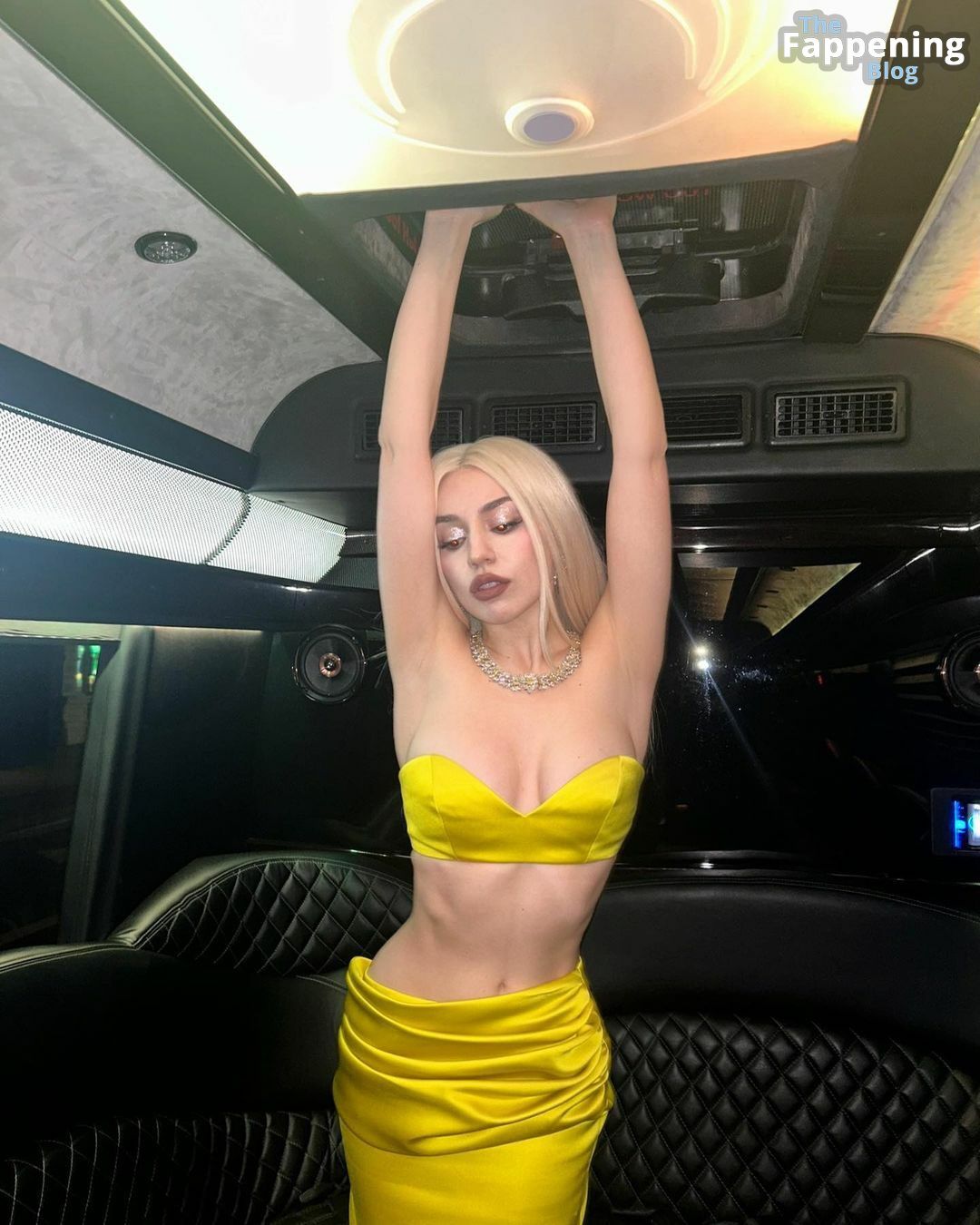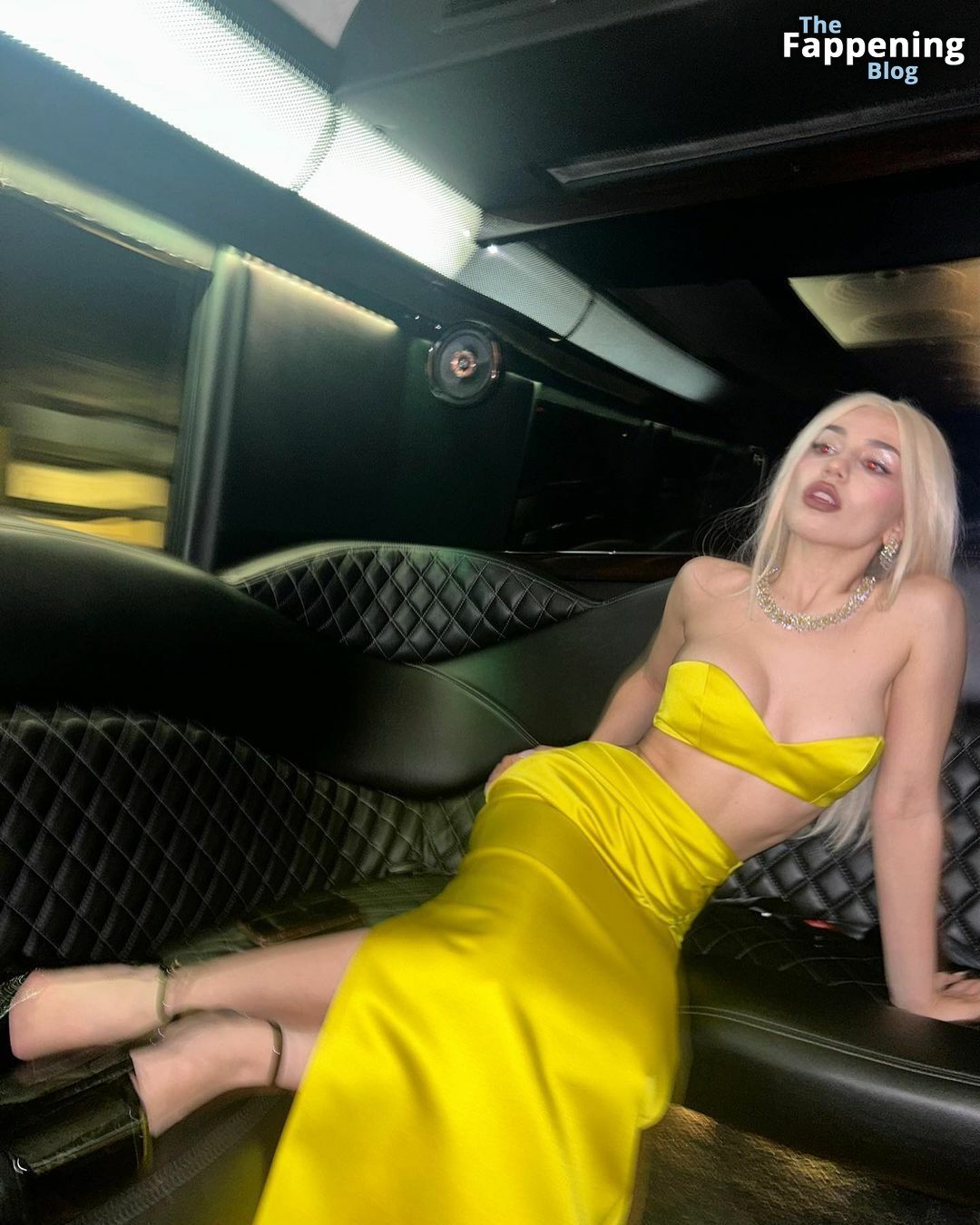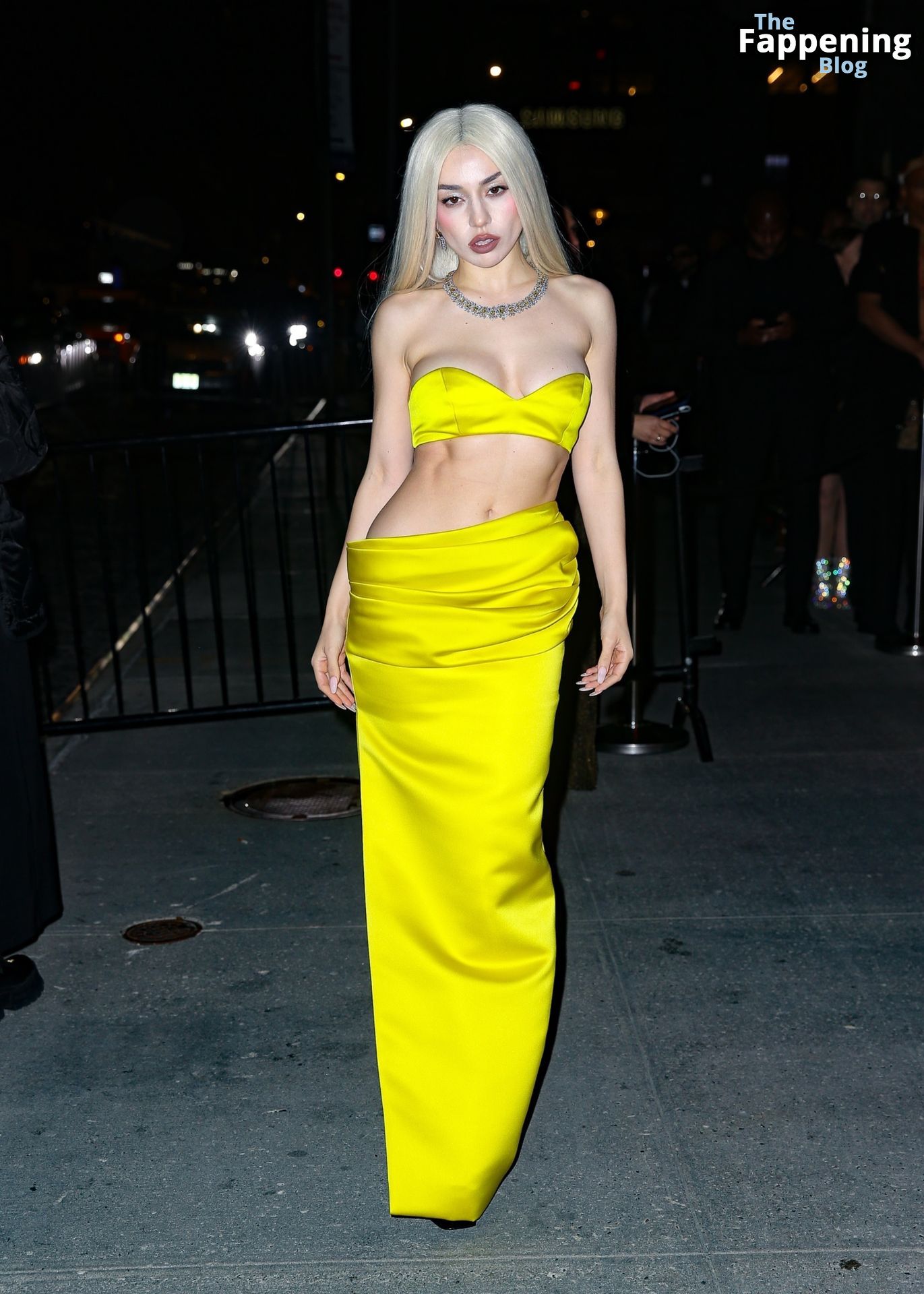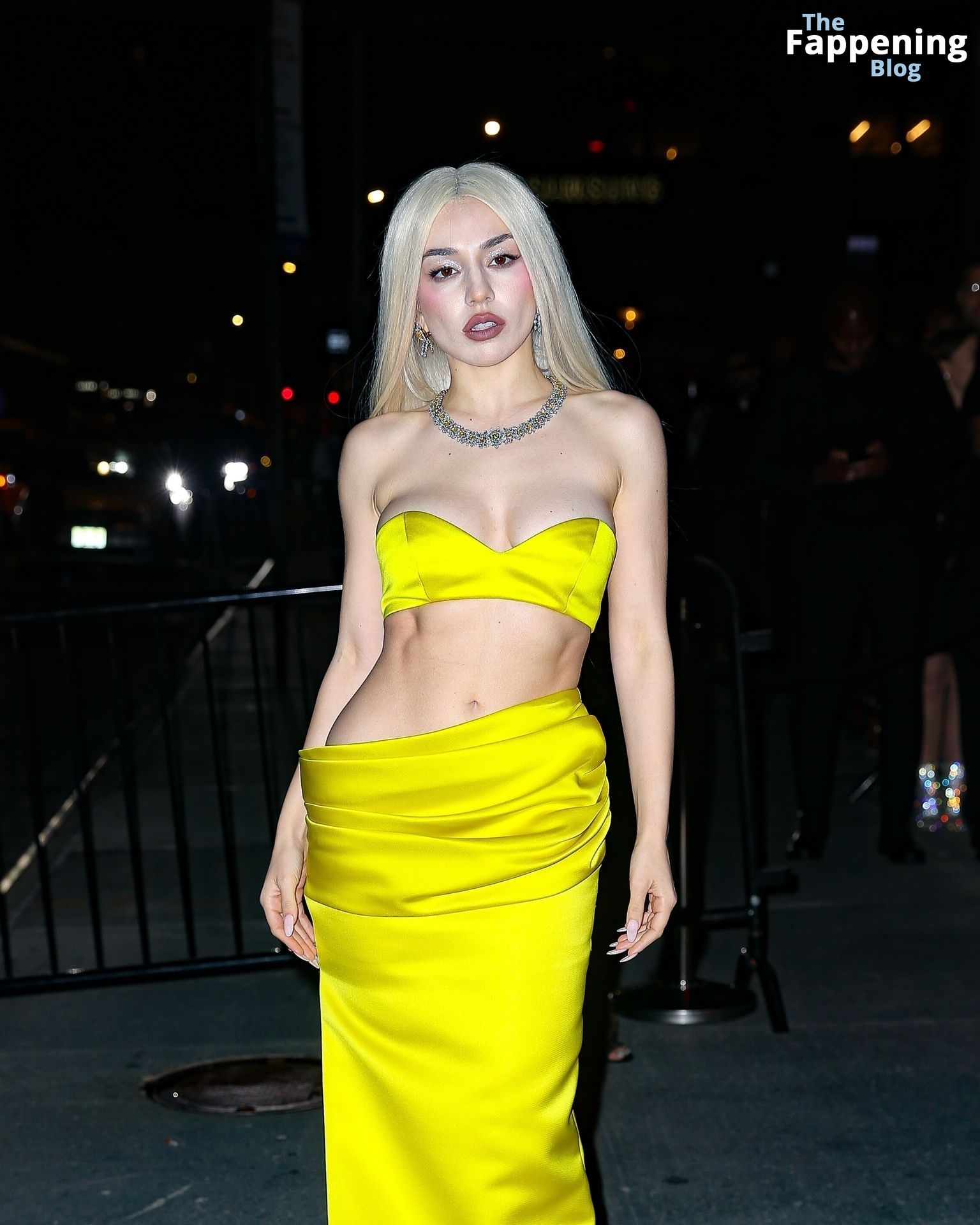 Não subestime a declaração de moda quente de Ava Max: um vestido amarelo sem sutiã que destaca toda a sua beleza enquanto ela é vista chegando a uma festa do Met Gala em NYC.