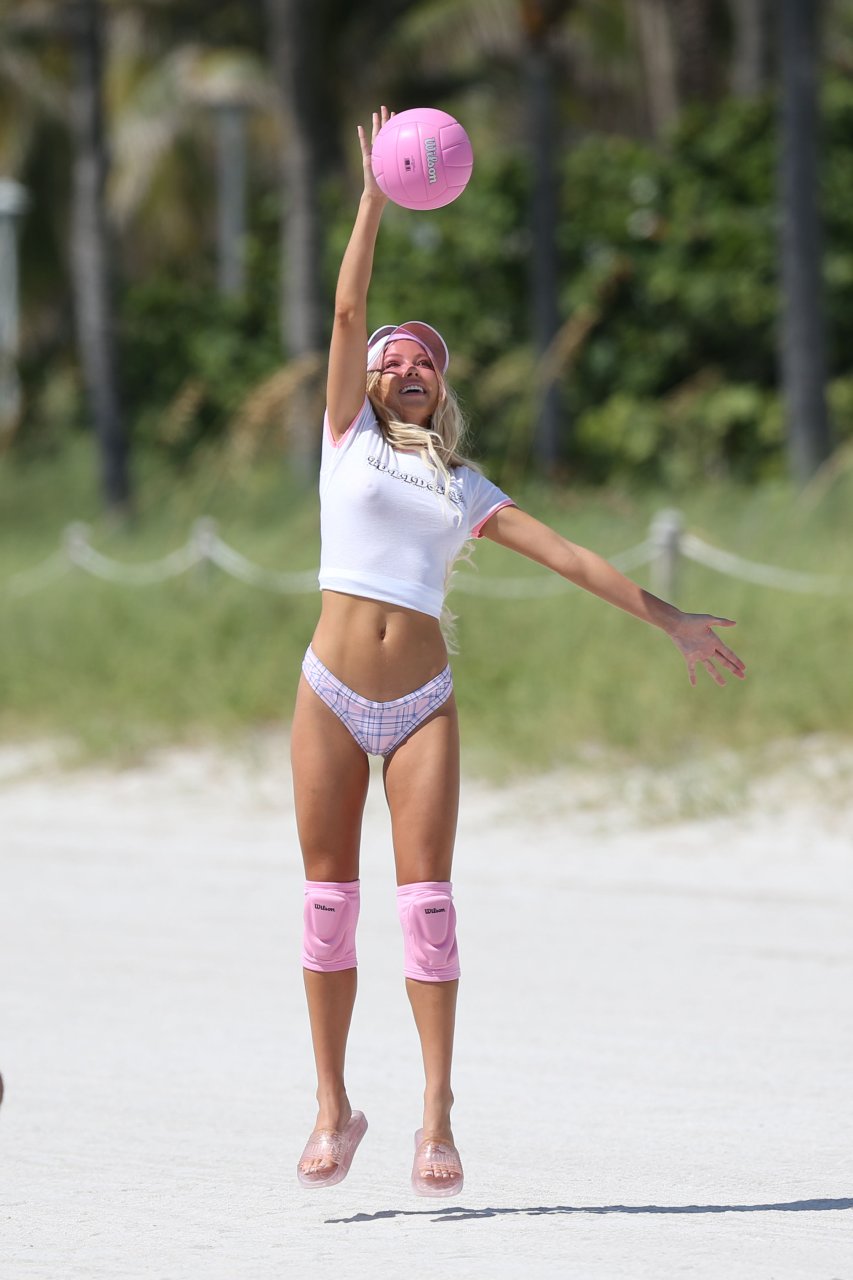A suposta ex-namorada de Justin Bieber foi vista jogando vôlei, vestindo apenas roupa íntima e uma camiseta, com joelheiras e um boné. As garotas então trocaram para pijamas e usaram poinsétias na cabeça, para um toque extra de Natal.