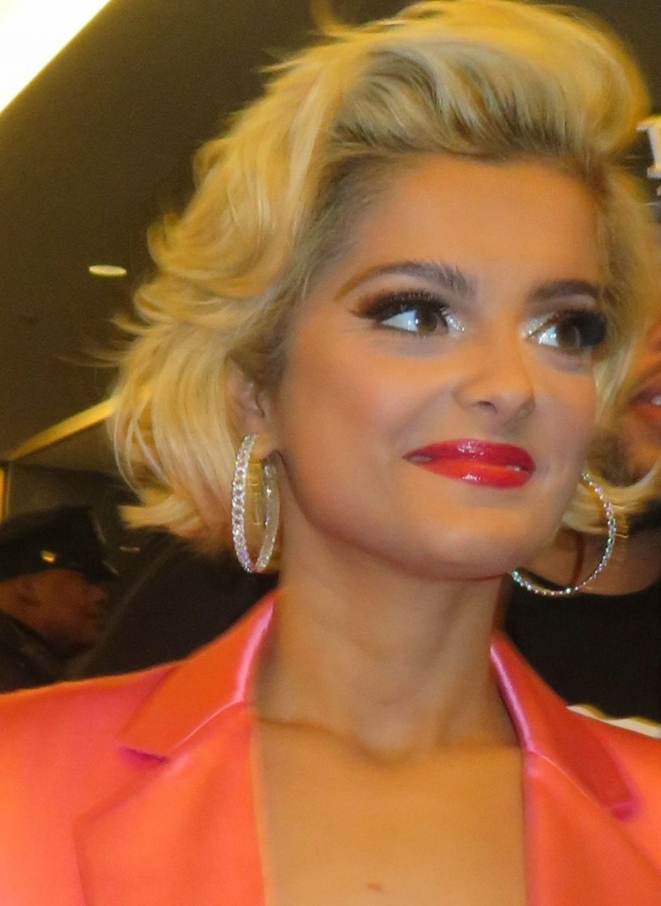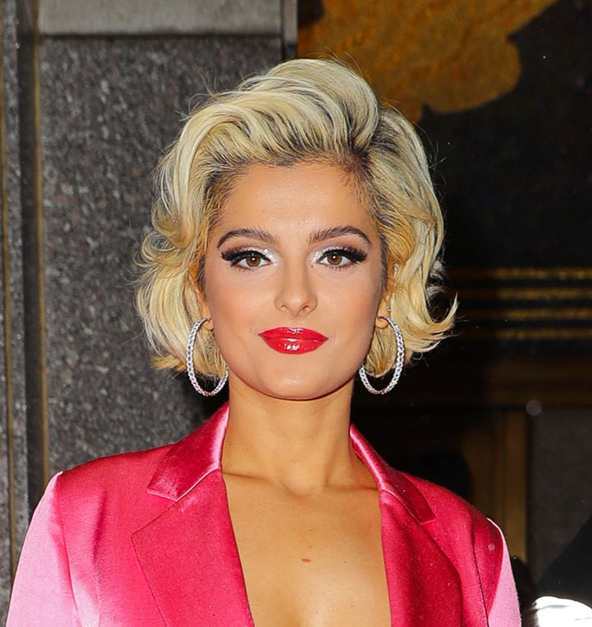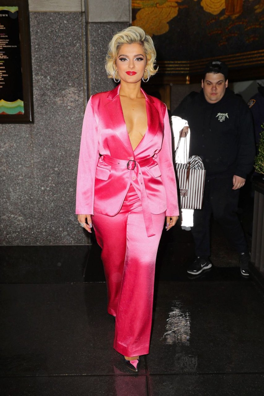 Cantora Bebe Rexha aparece sem sutiã em um terno de cetim fúcsia ao sair do The Tonight Show Starring Jimmy Fallon em Nova York, 20/12/2018.