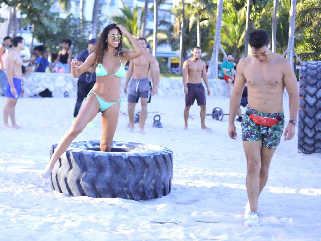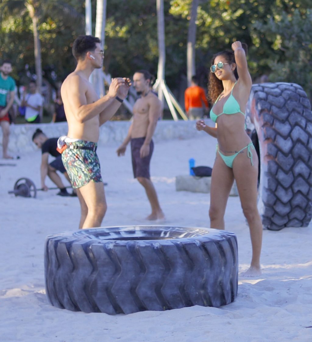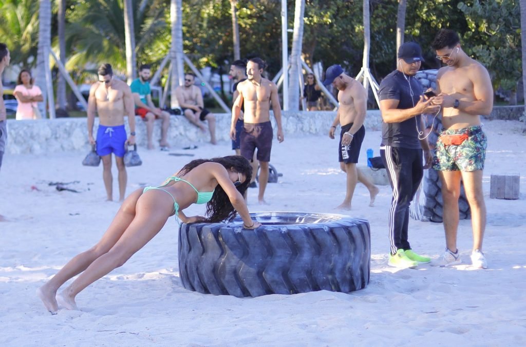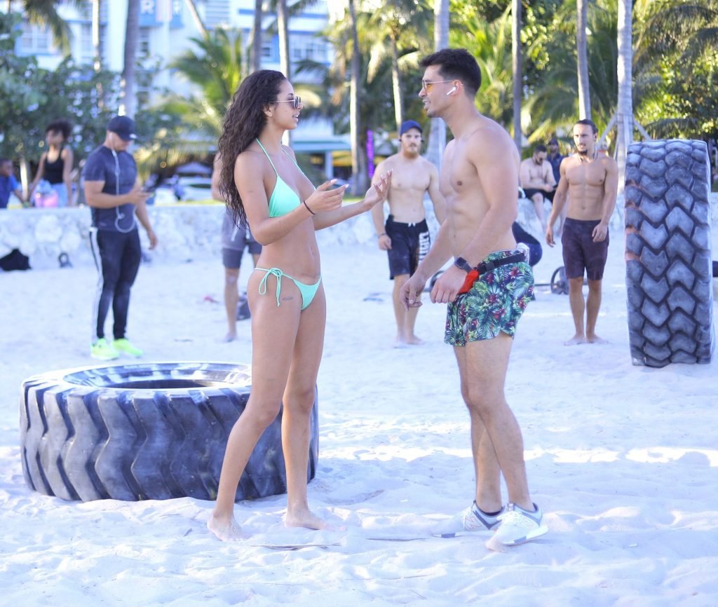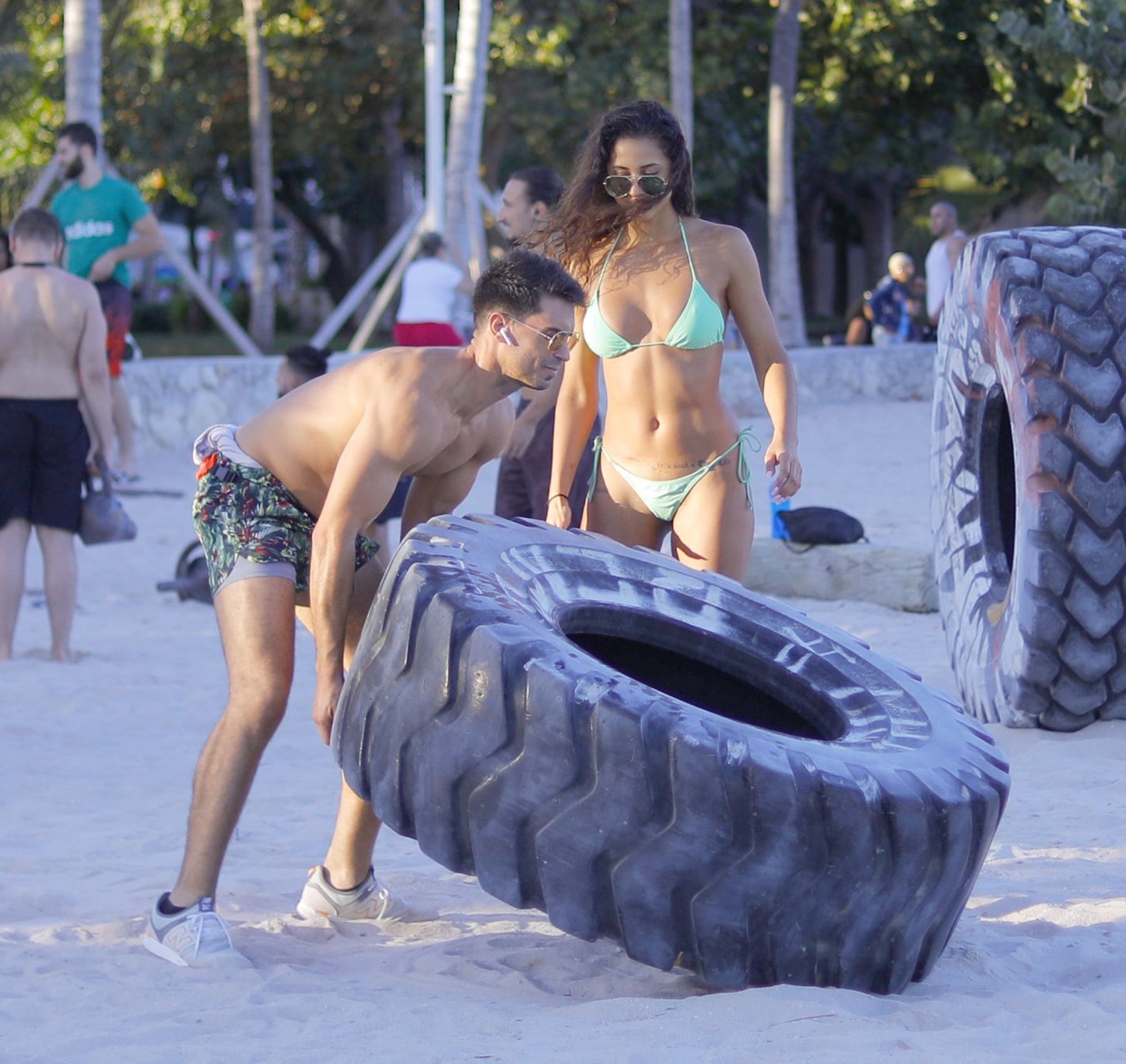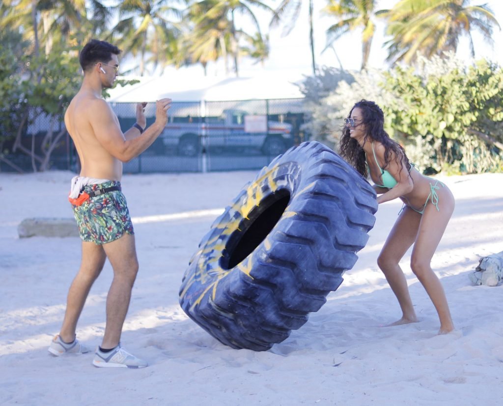 A modelo alemã Rebecca (Becca) Scott exibe seu corpo tonificado em um maiô e faz um treino com um treinador enquanto levanta um pneu e ri com ele na Praia de Miami, 01/08/2019.