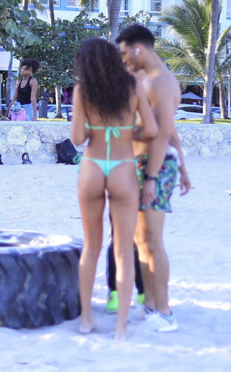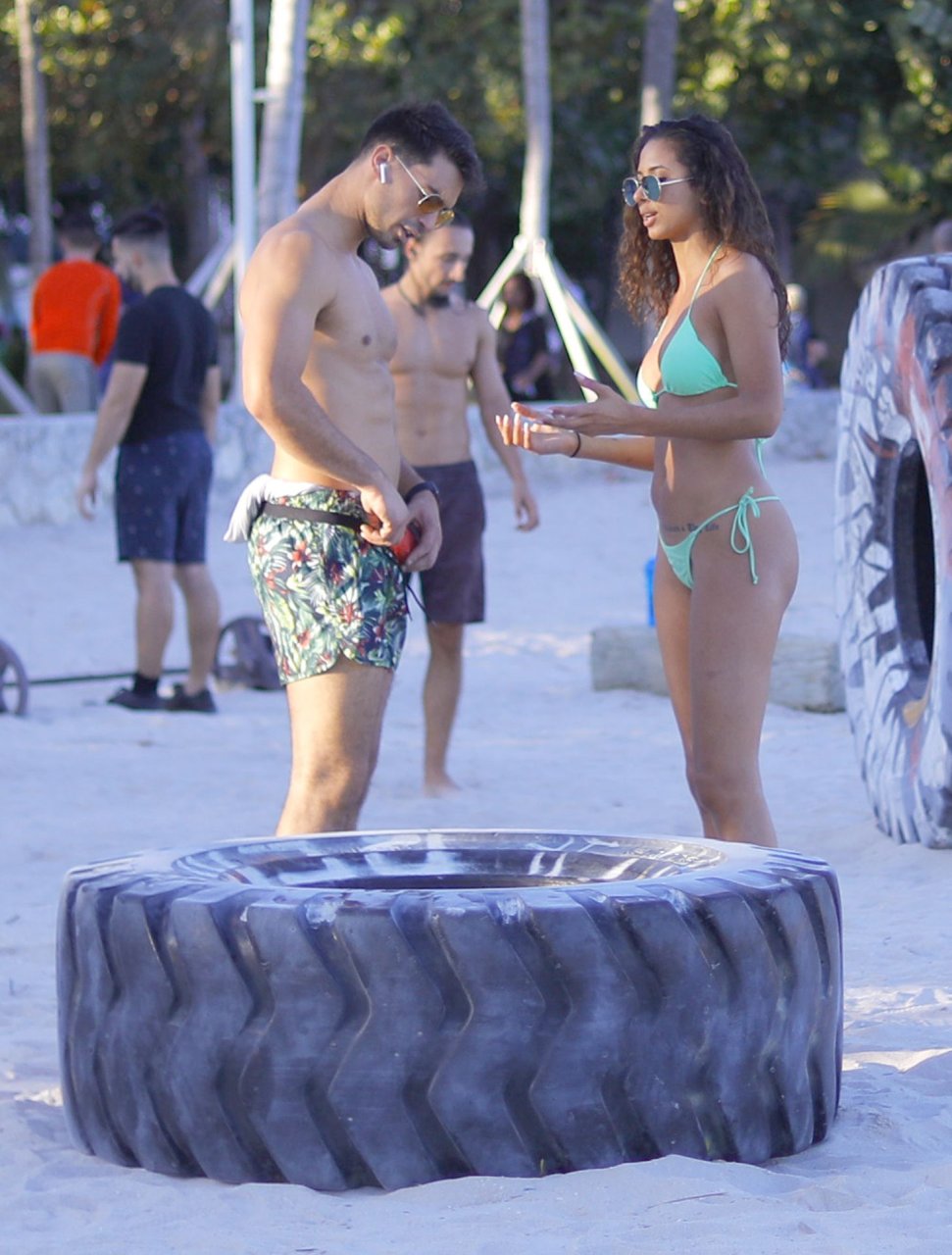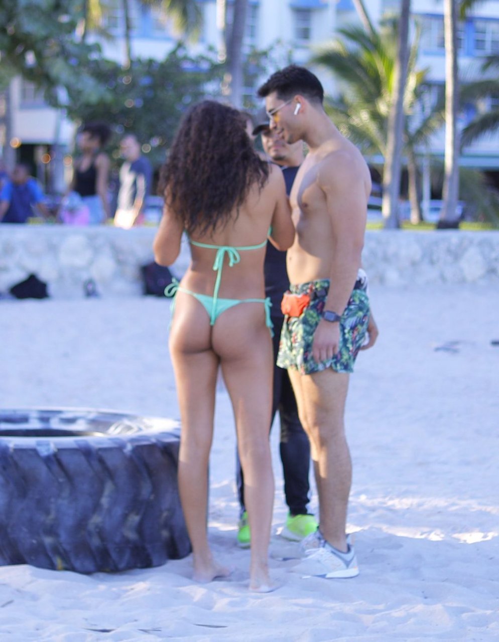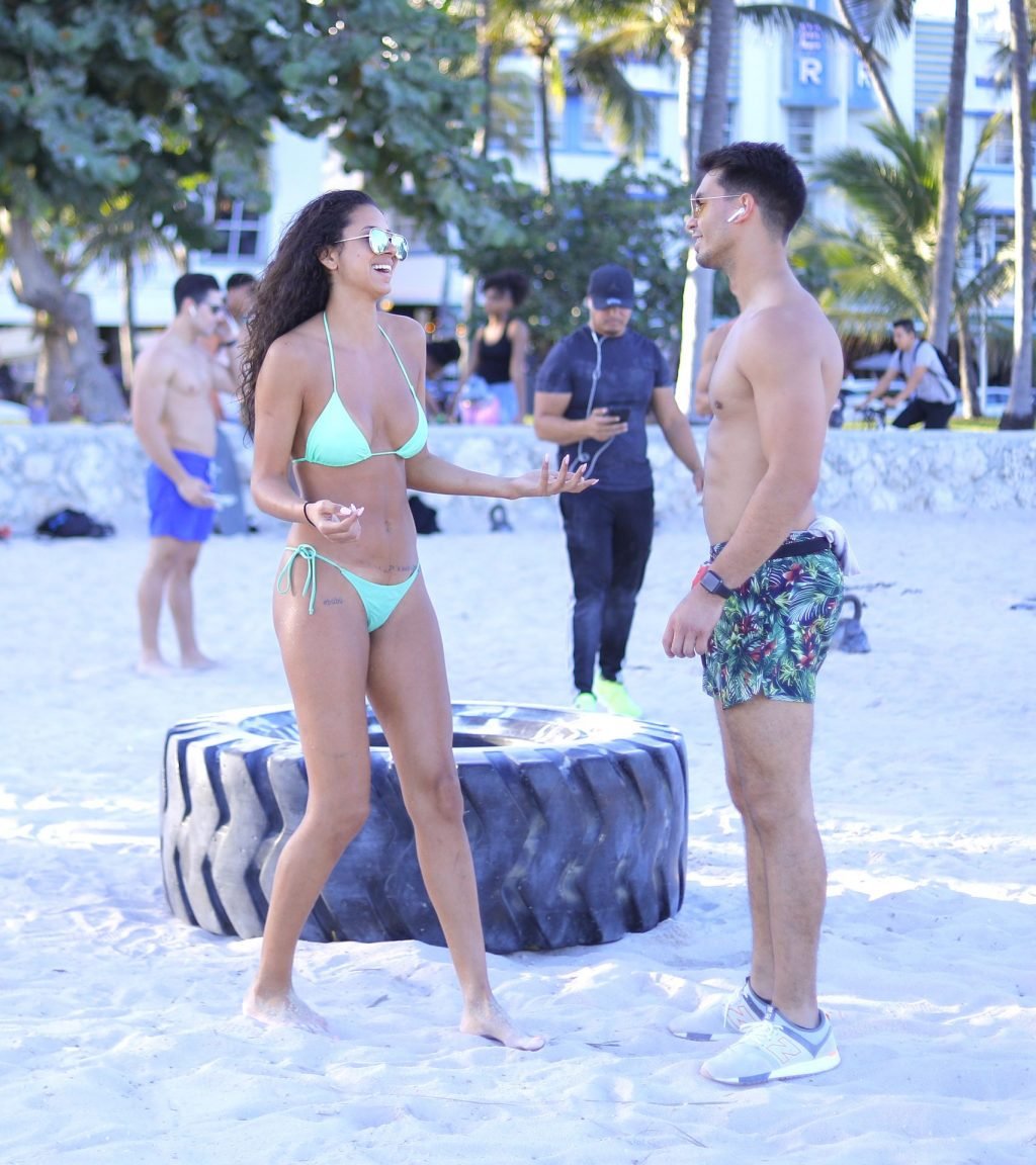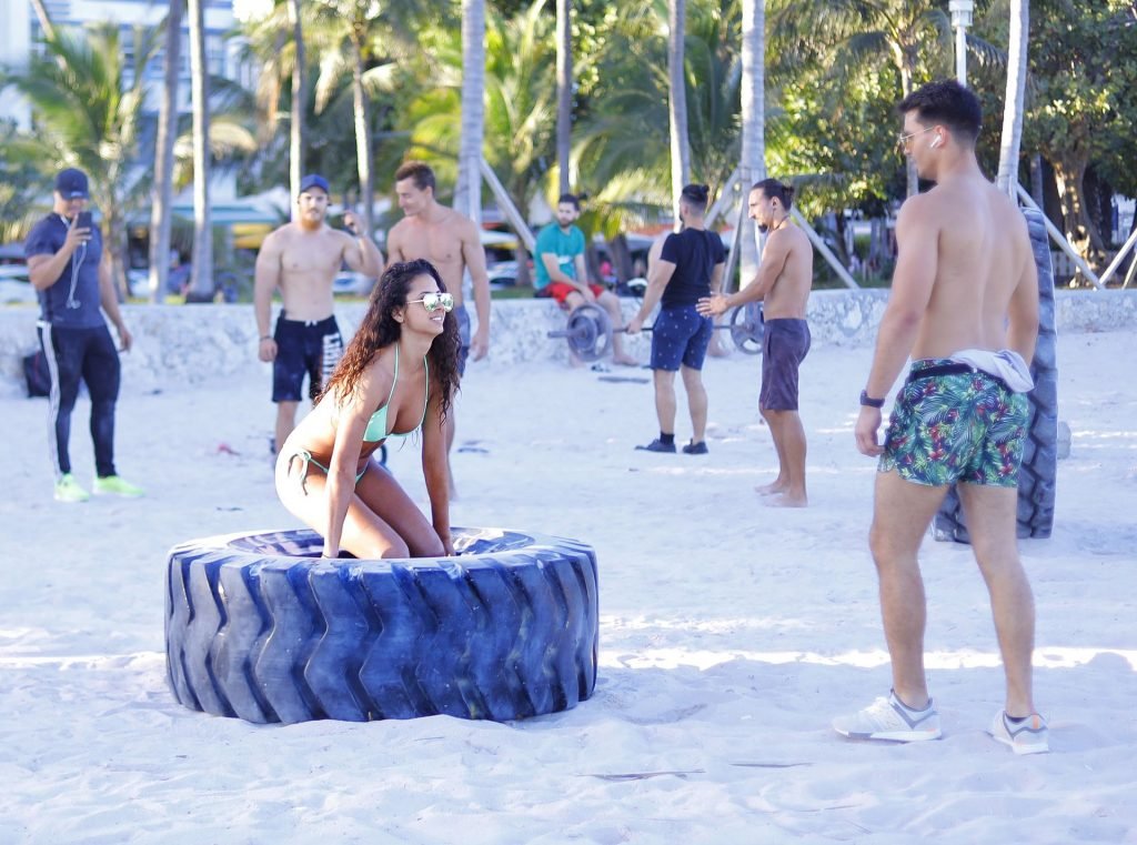 A modelo alemã Rebecca (Becca) Scott exibe seu corpo tonificado em um maiô e faz um treino com um treinador enquanto levanta um pneu e ri com ele na Praia de Miami, 01/08/2019.